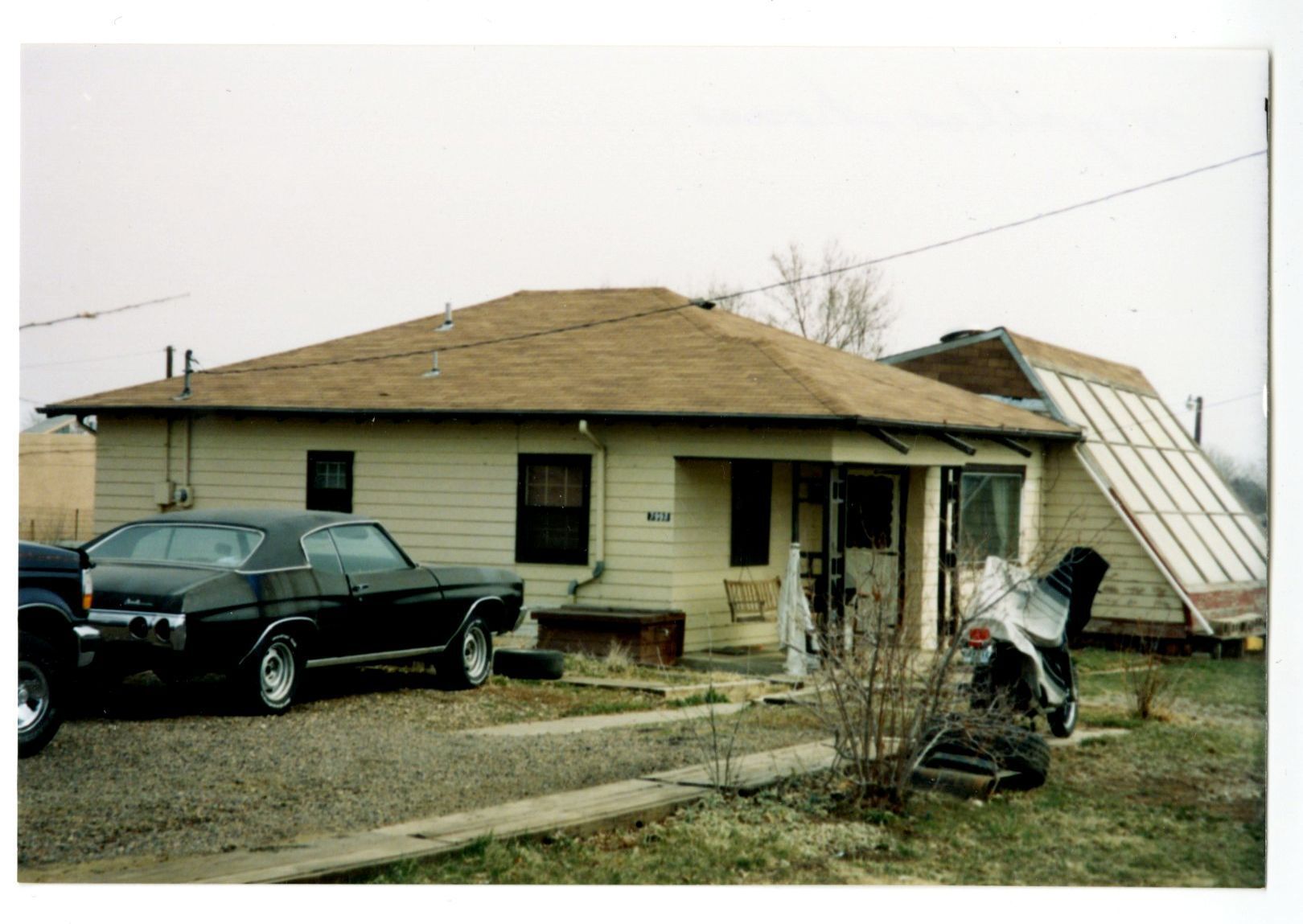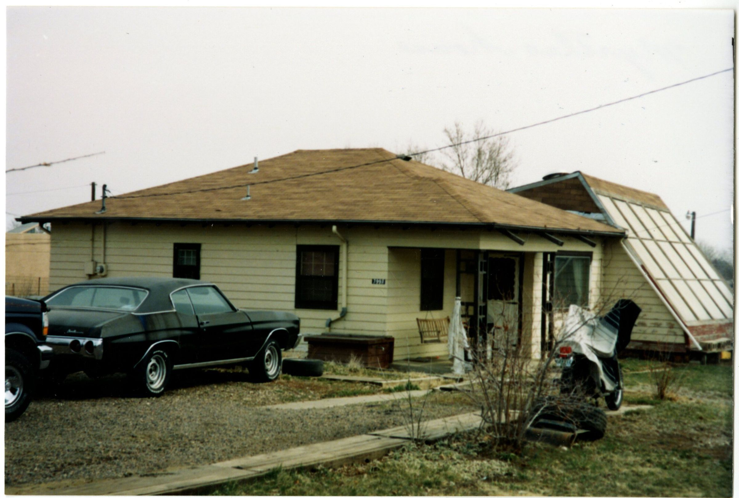 Scanned color photograph of a house formerly belonging to Myrtle Van Horn, a daughter of Ellenor Brown, 1998. The house is light tan, one story tall, with cars and a lawn mower in front, electrical wire overhead. A triangular shaped shed with windows sits just behind the main house. The backside of the photograph has an inscription, stating "Myrtle's house" and the date the photograph was taken.Collection