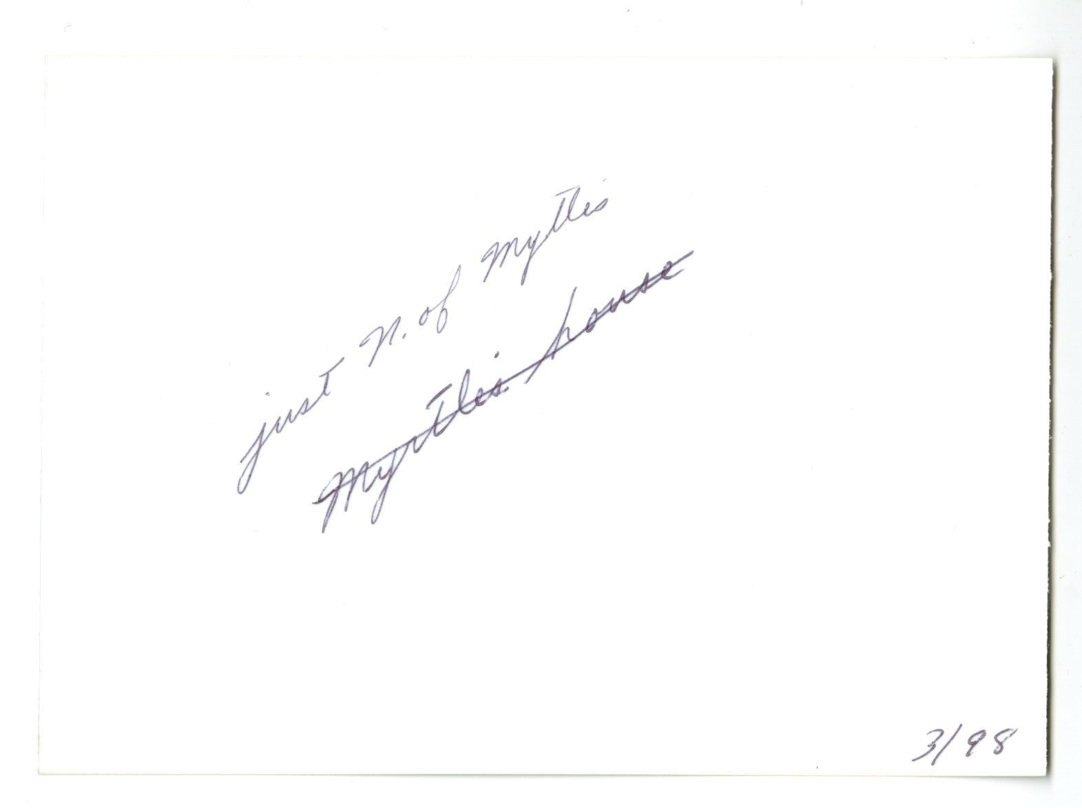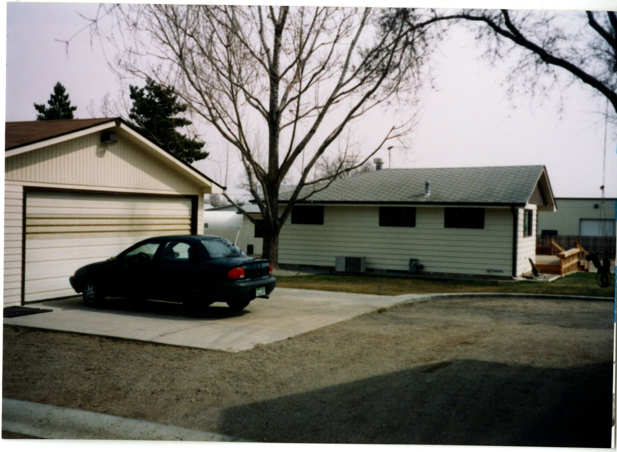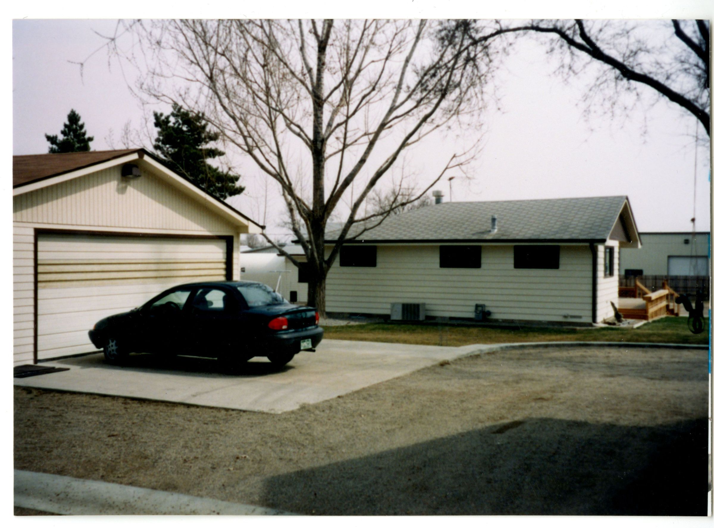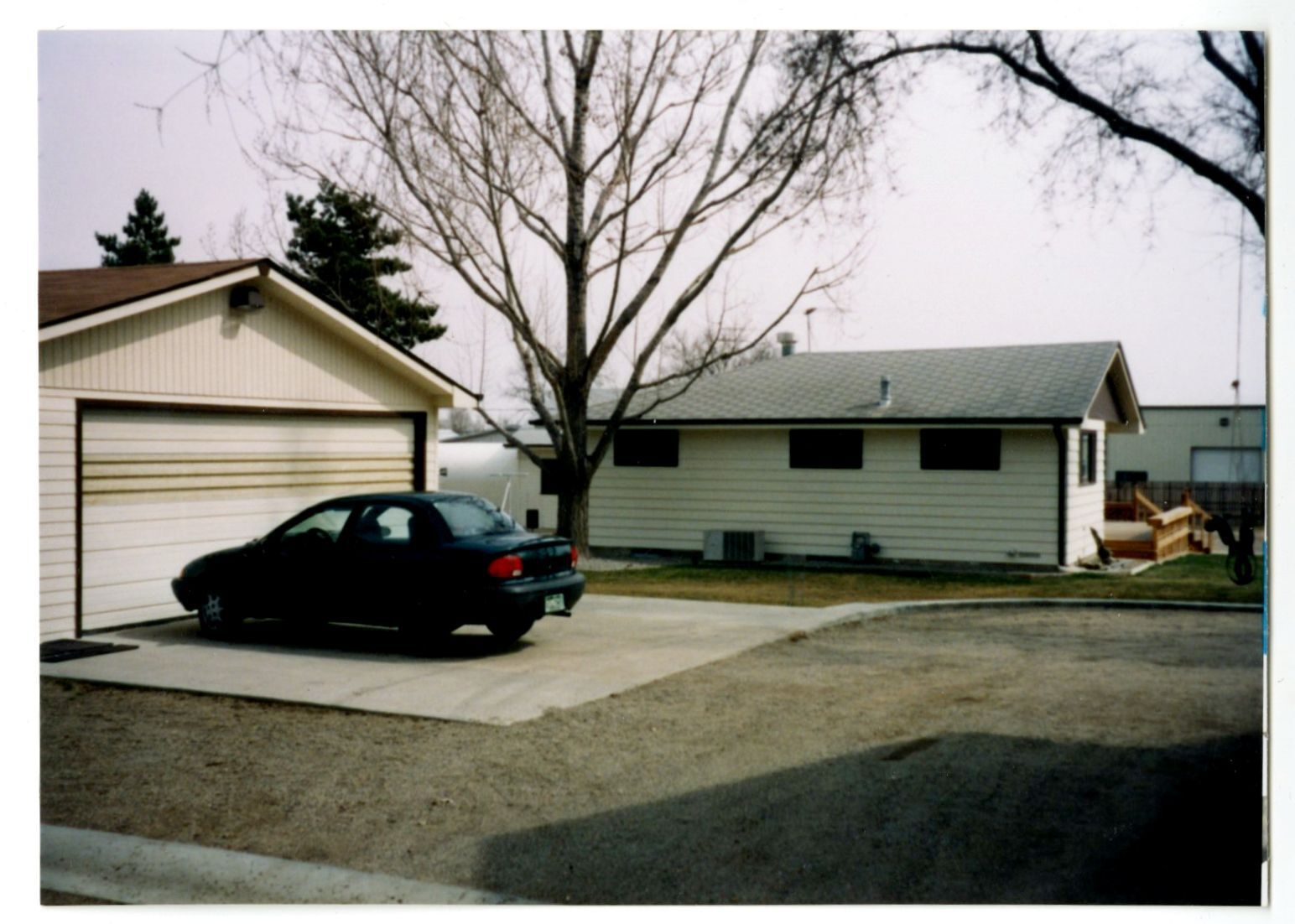 Scanned color photograph of the view north of Myrtle Van Horn's old house, 1998. A blue car sits in front of a white garage, with a tree next to it and a white house in the background. The backside of the photograph has an inscription labeling the photograph.Collection