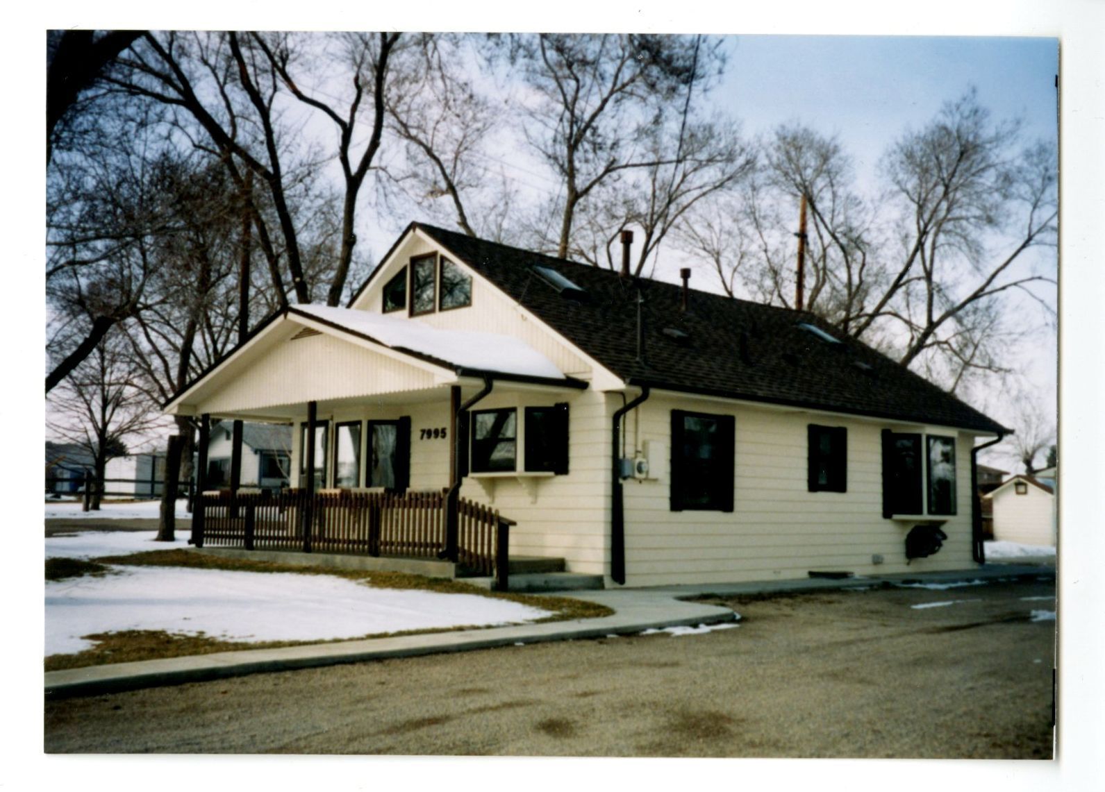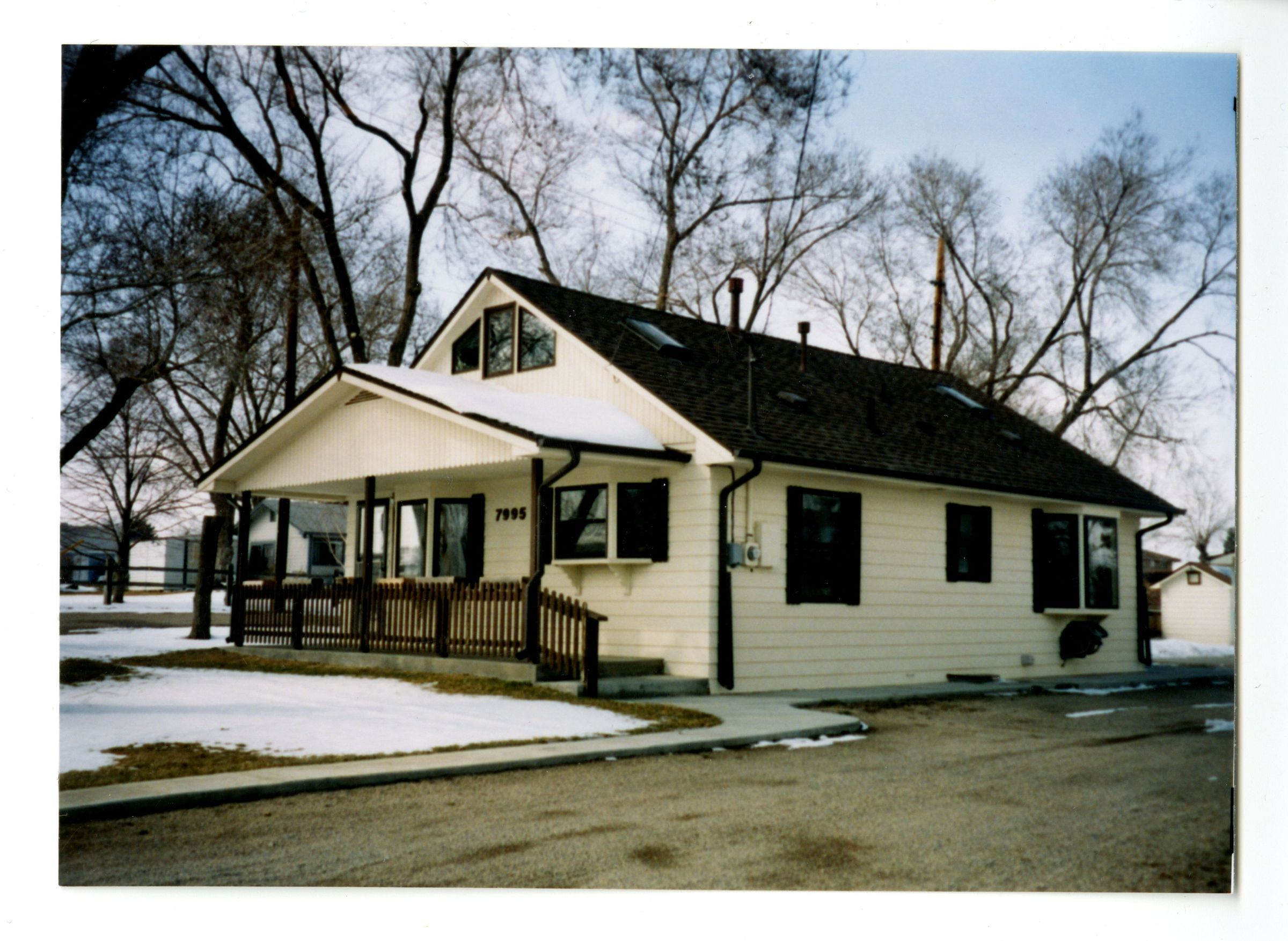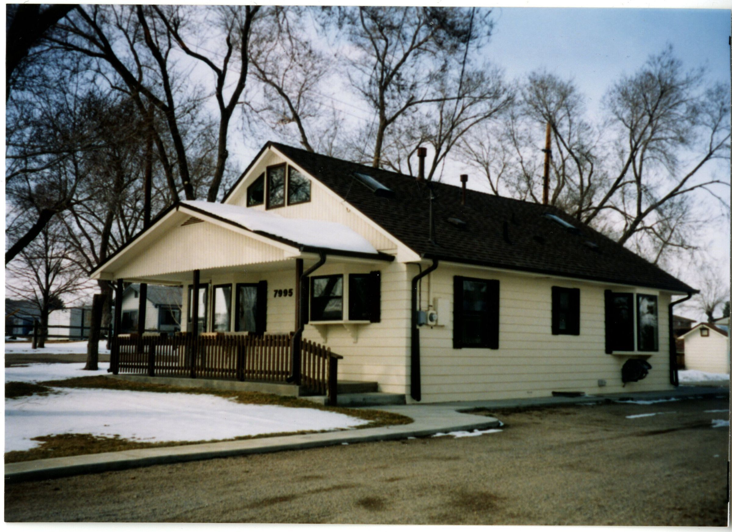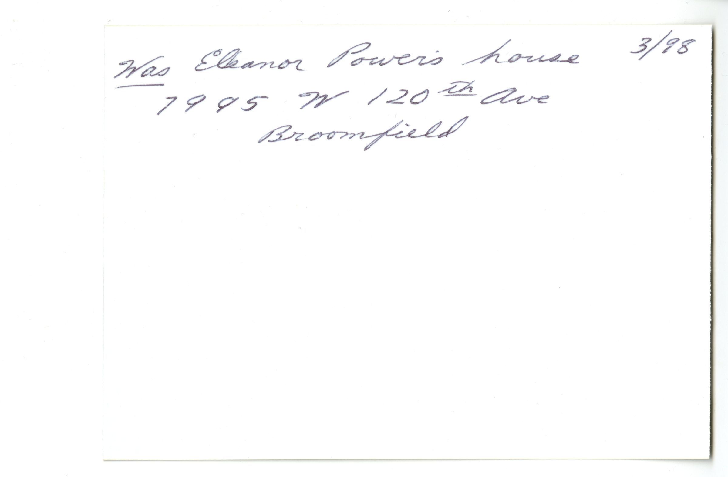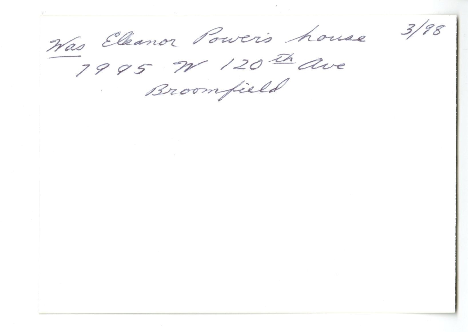 Scanned color photograph of a house formerly belonging to Ellenor Brown Powers at 7995 West 120th Ave, Broomfield, Colorado, 1998. The house is white with a front porch with part of the roof overhanging, dark roof, two stories. Backside of the photograph has an inscription showing the house address and date the photo was taken.Collection