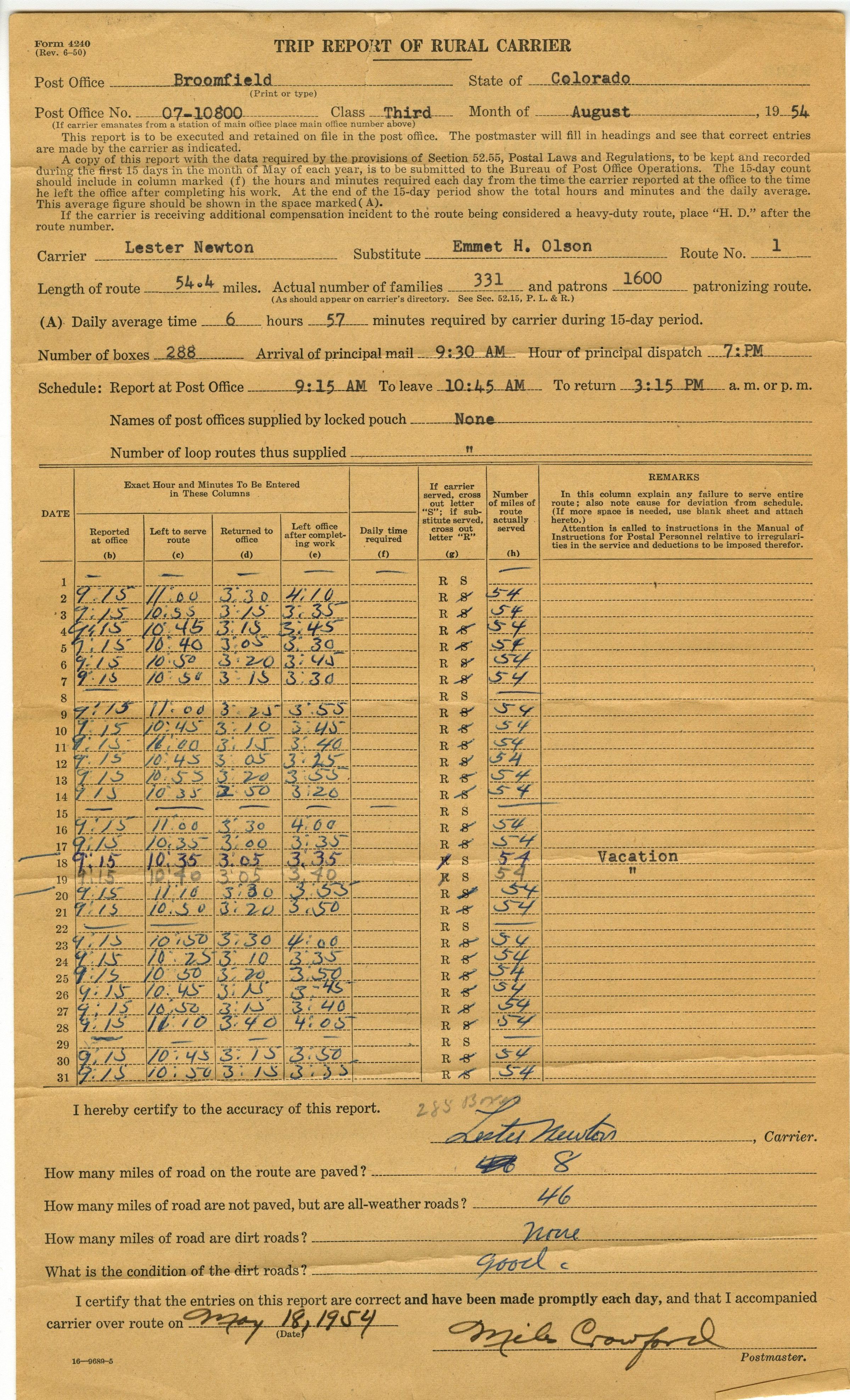 Dated August, 1954. Carrier: Lester Newton, Substitute: Emmet H. Olson, Route No.: 1.