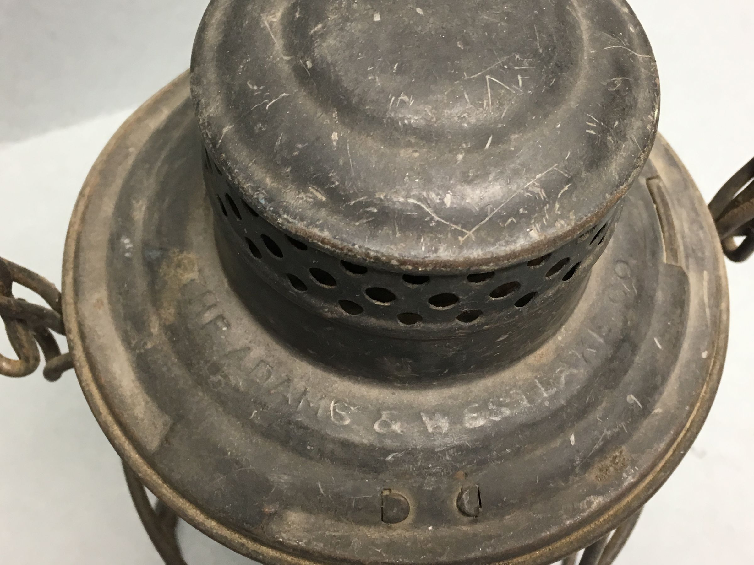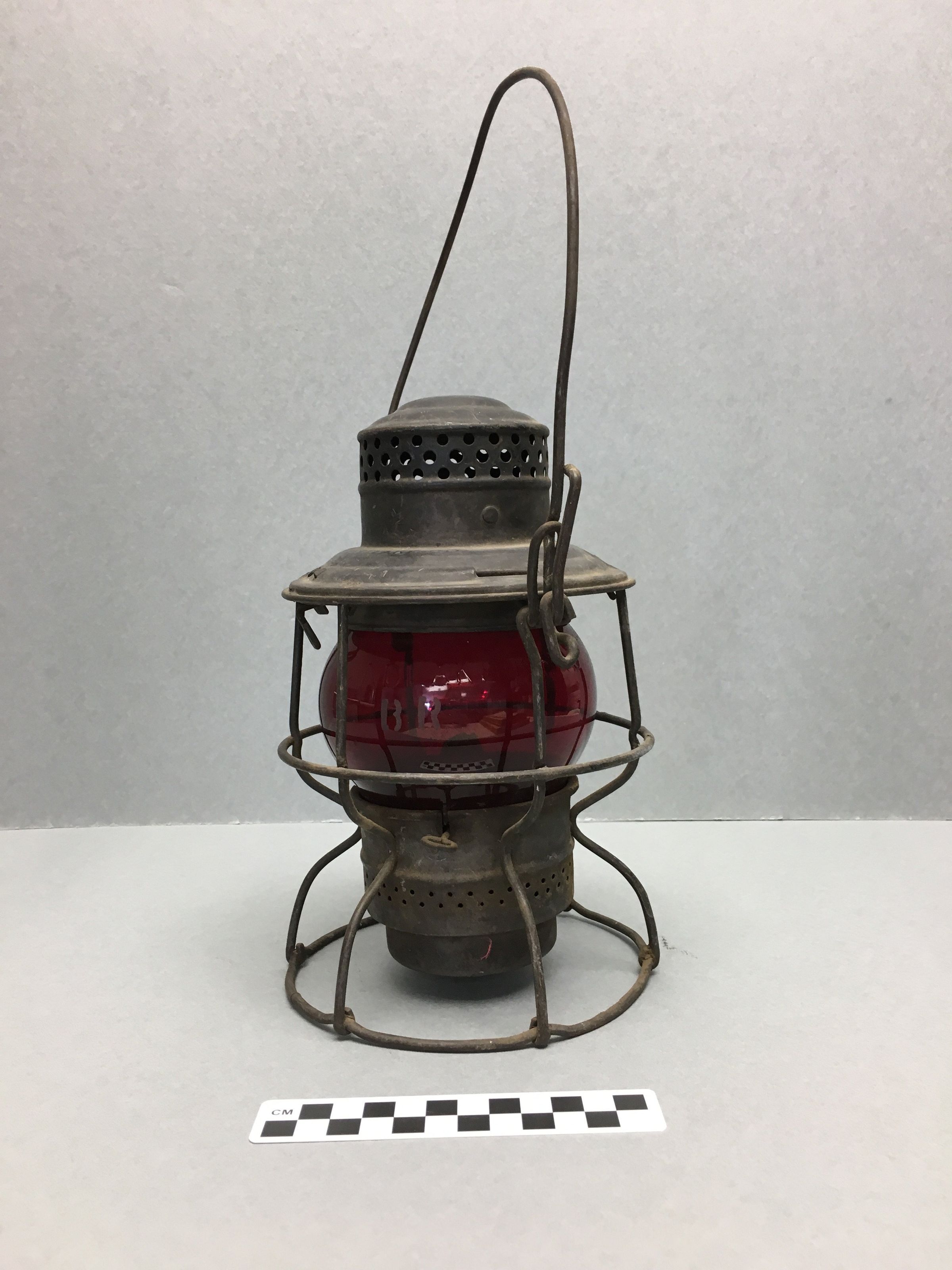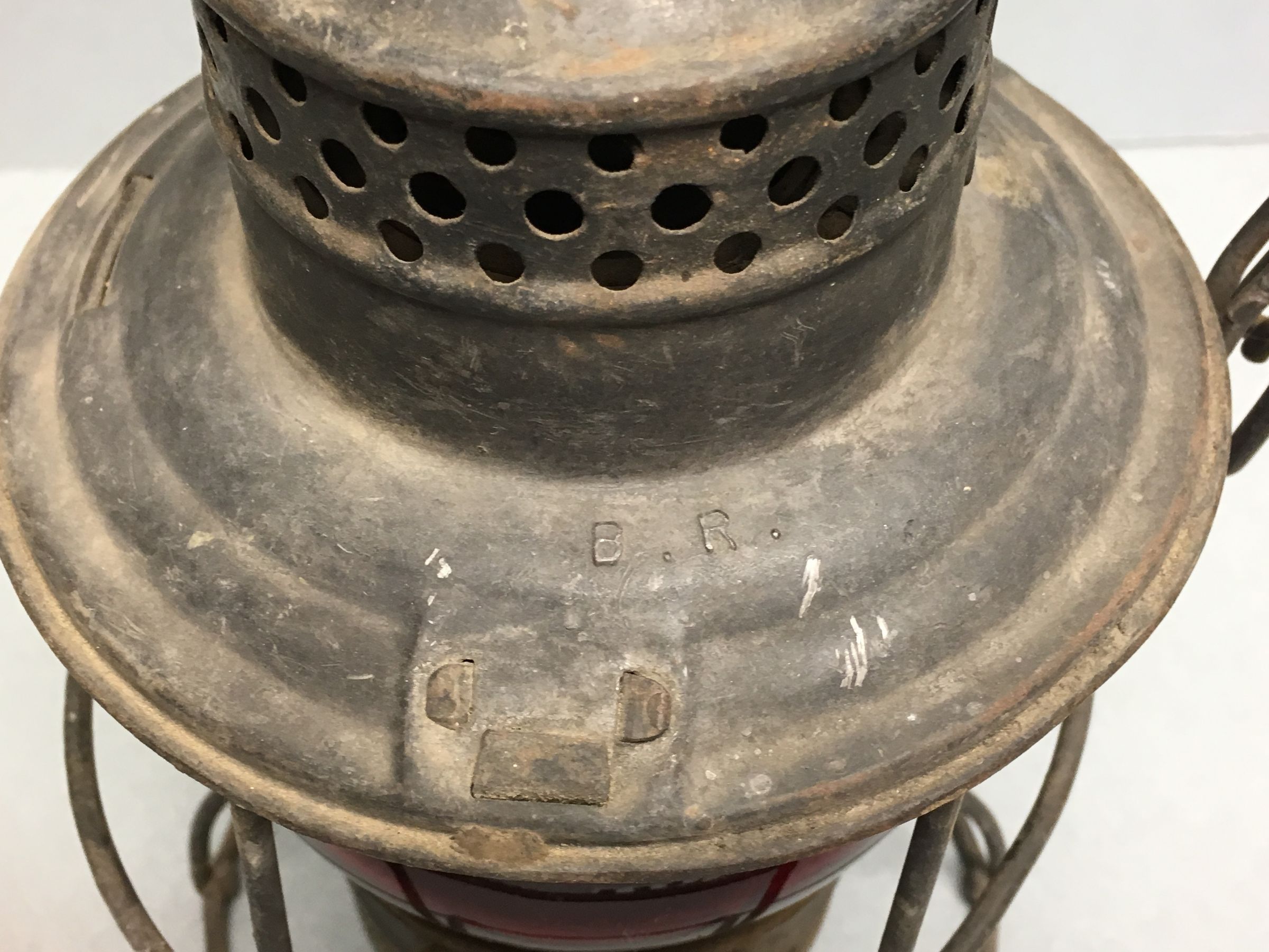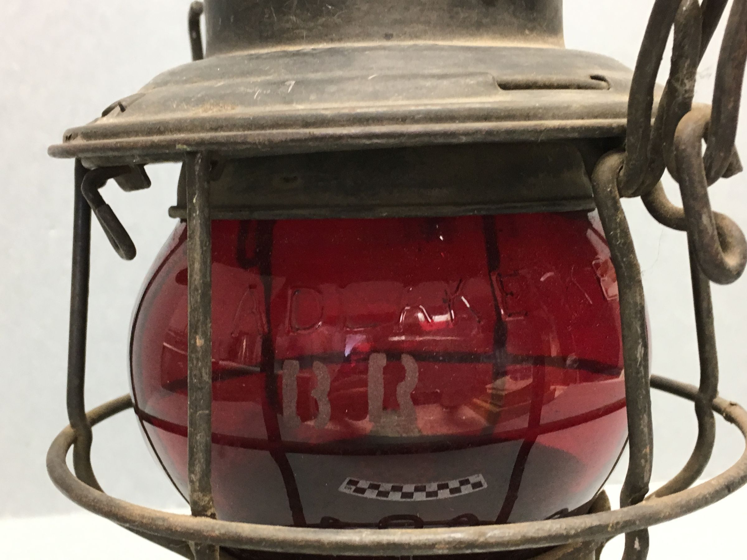 Adams and Westlake short globe lantern. Has BR, the Burlington Route logo, and Adams and Westlake Co. stamped on the brim. Globe of red glass has BR etched and Adlake Kero embossed into side. Bottom is printed with: Adlake – Kero 2–43/ USA/ Canada/ 1921–1923/ Patent pending. There are also several numbers on the bottom that are not discernible. The lantern measures 9.5"(h) x 6" (dia).
