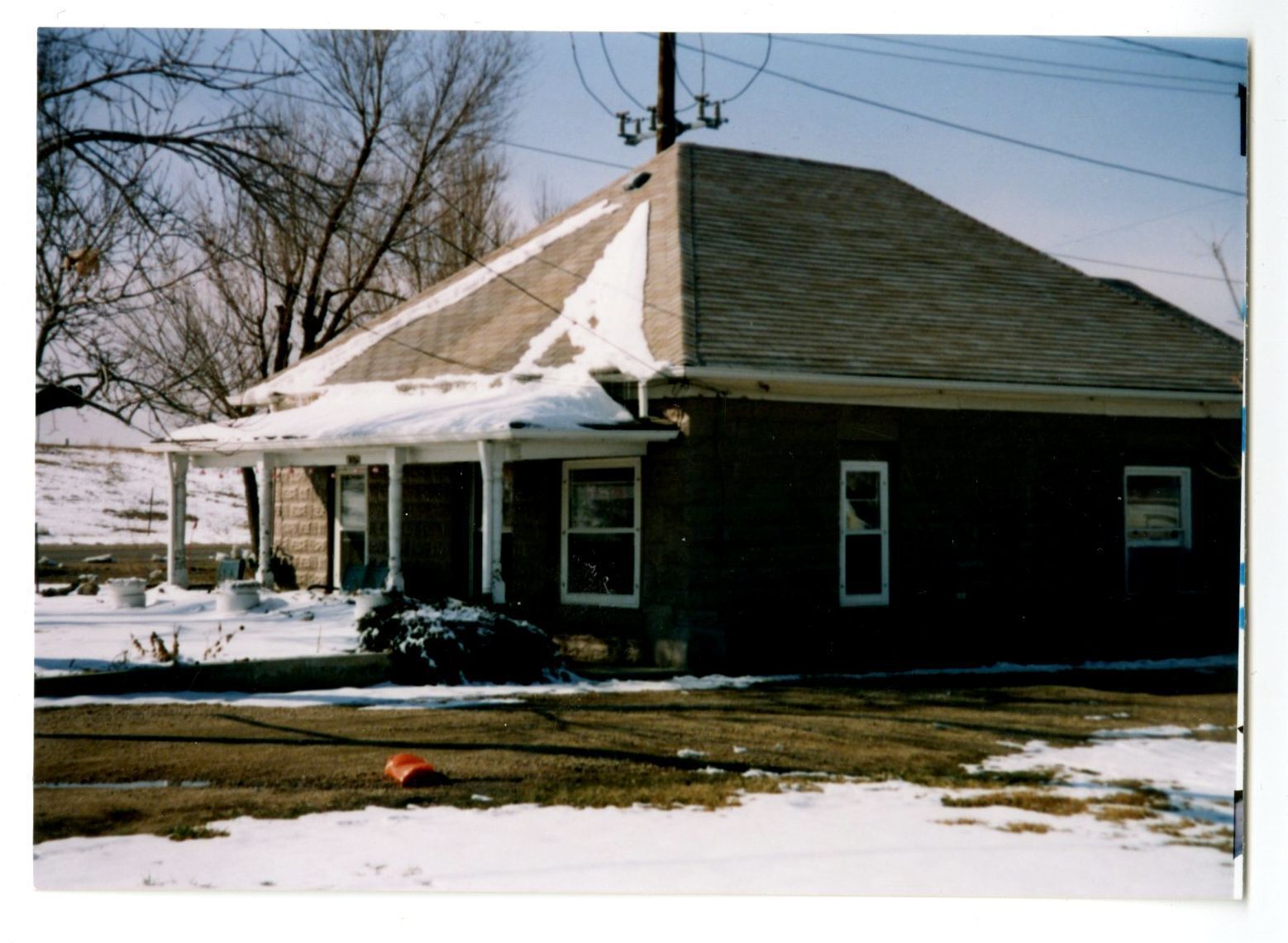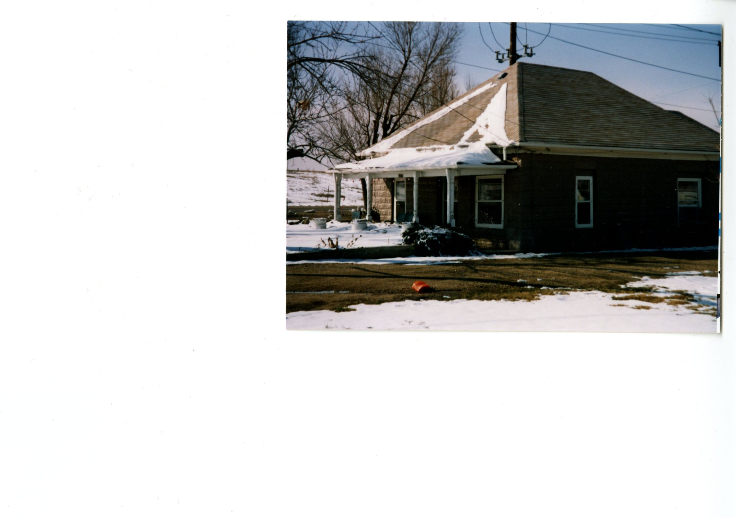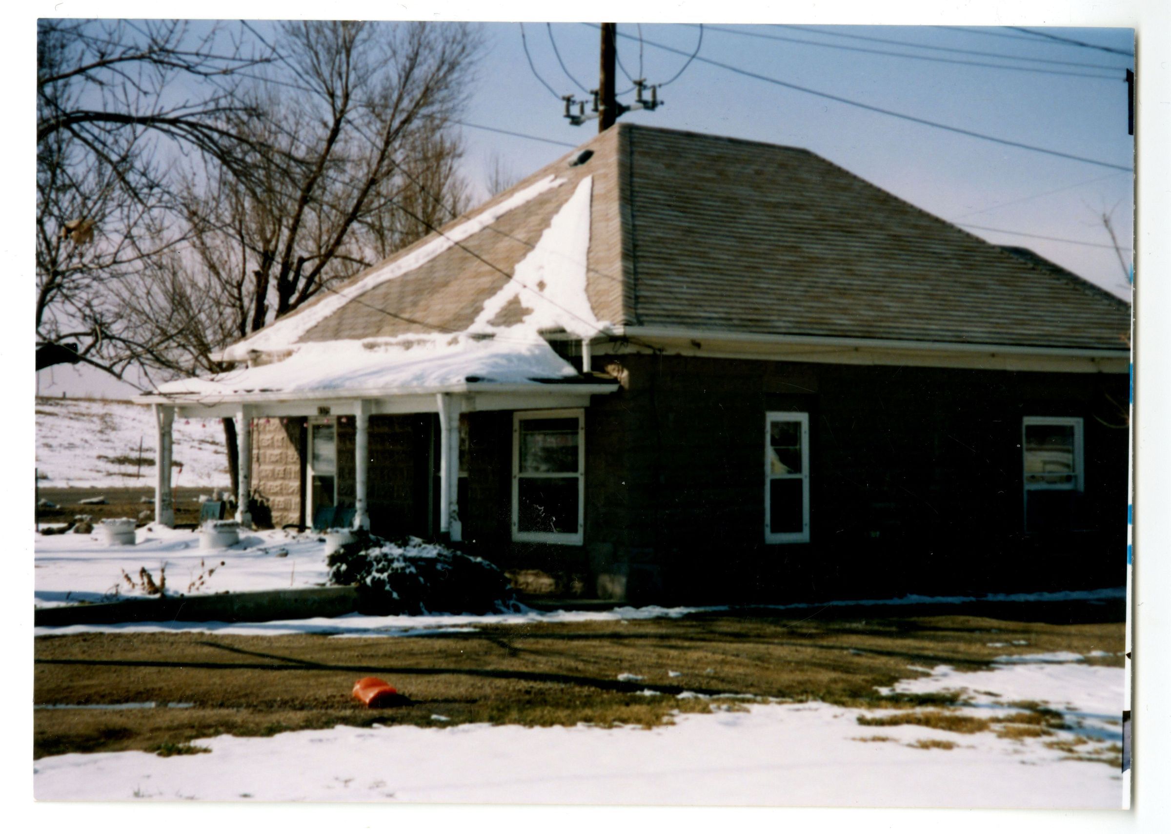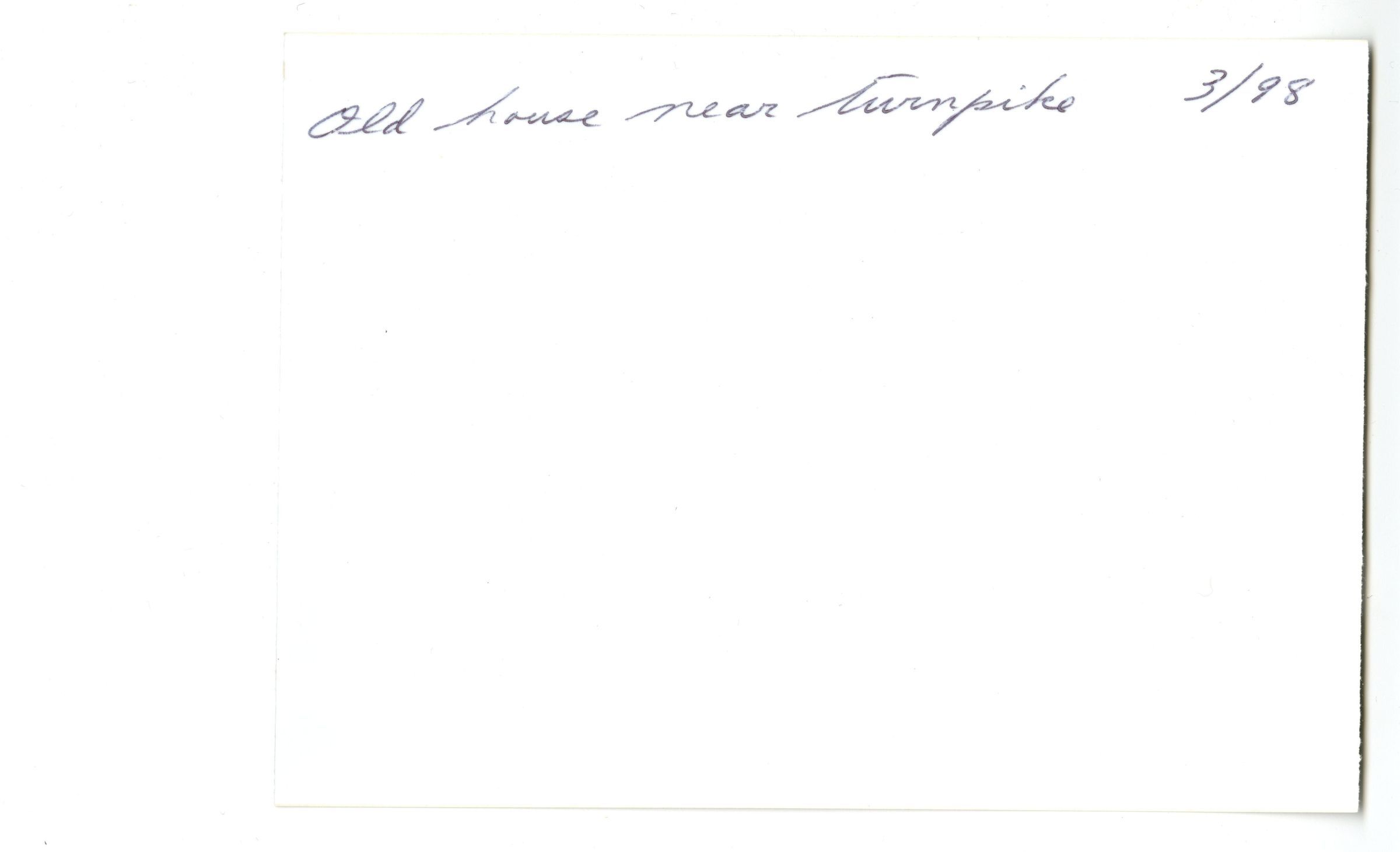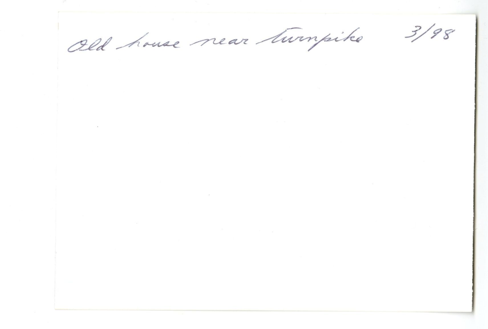 Scanned color photograph of an old house by the Denver-Boulder Turnpike, 1998. The house is brown, square at the base with tan roof. A power pole is seen partially hidden behind the house. The backside is inscribed with the photograph's label and date that the photo was taken, "Old house near Turnpike 3/98."Collection