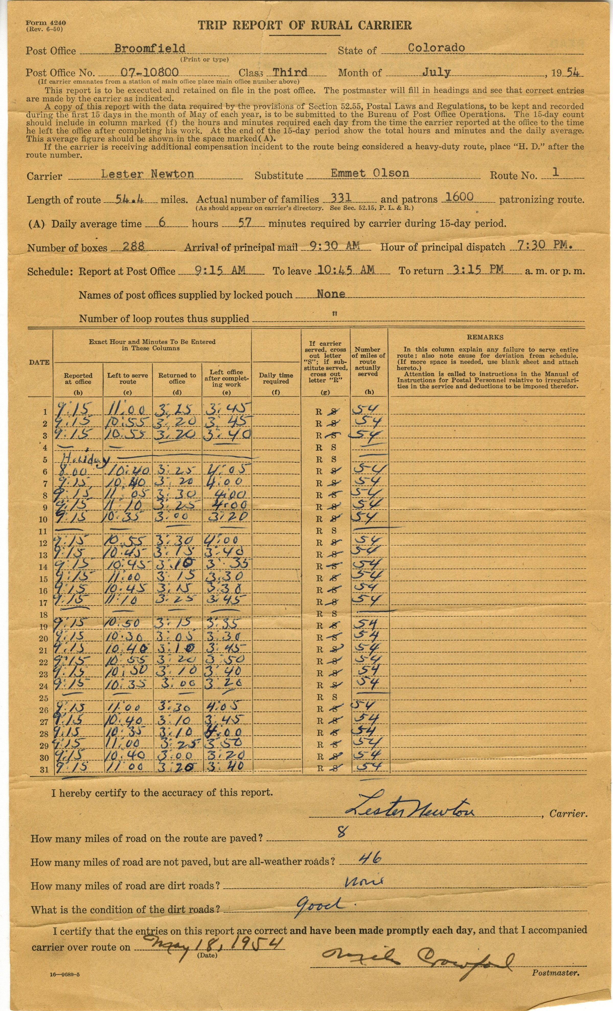 Dated July, 1954. Carrier: Lester Newton, Substitute: Emmet Olson, Route No.: 1.