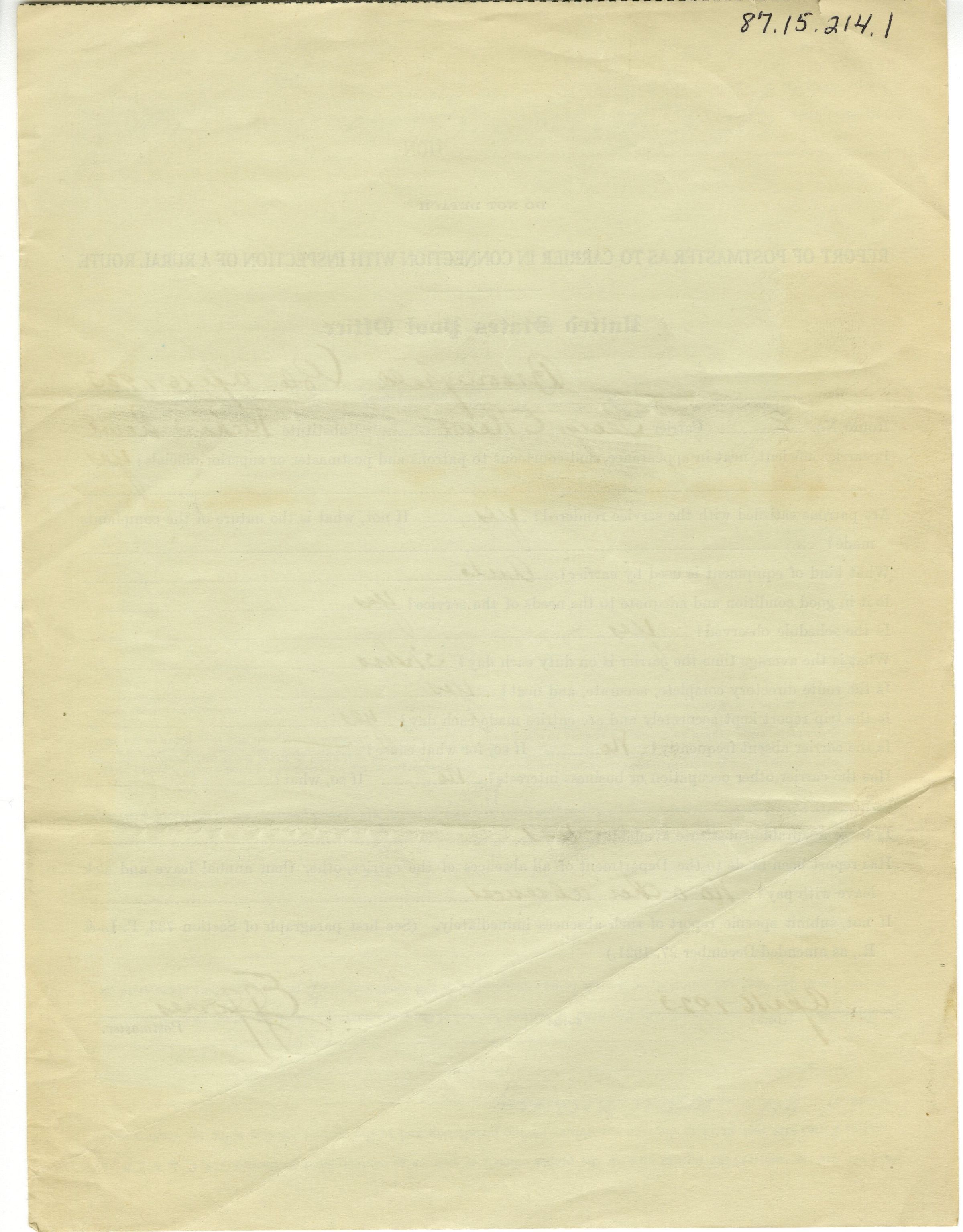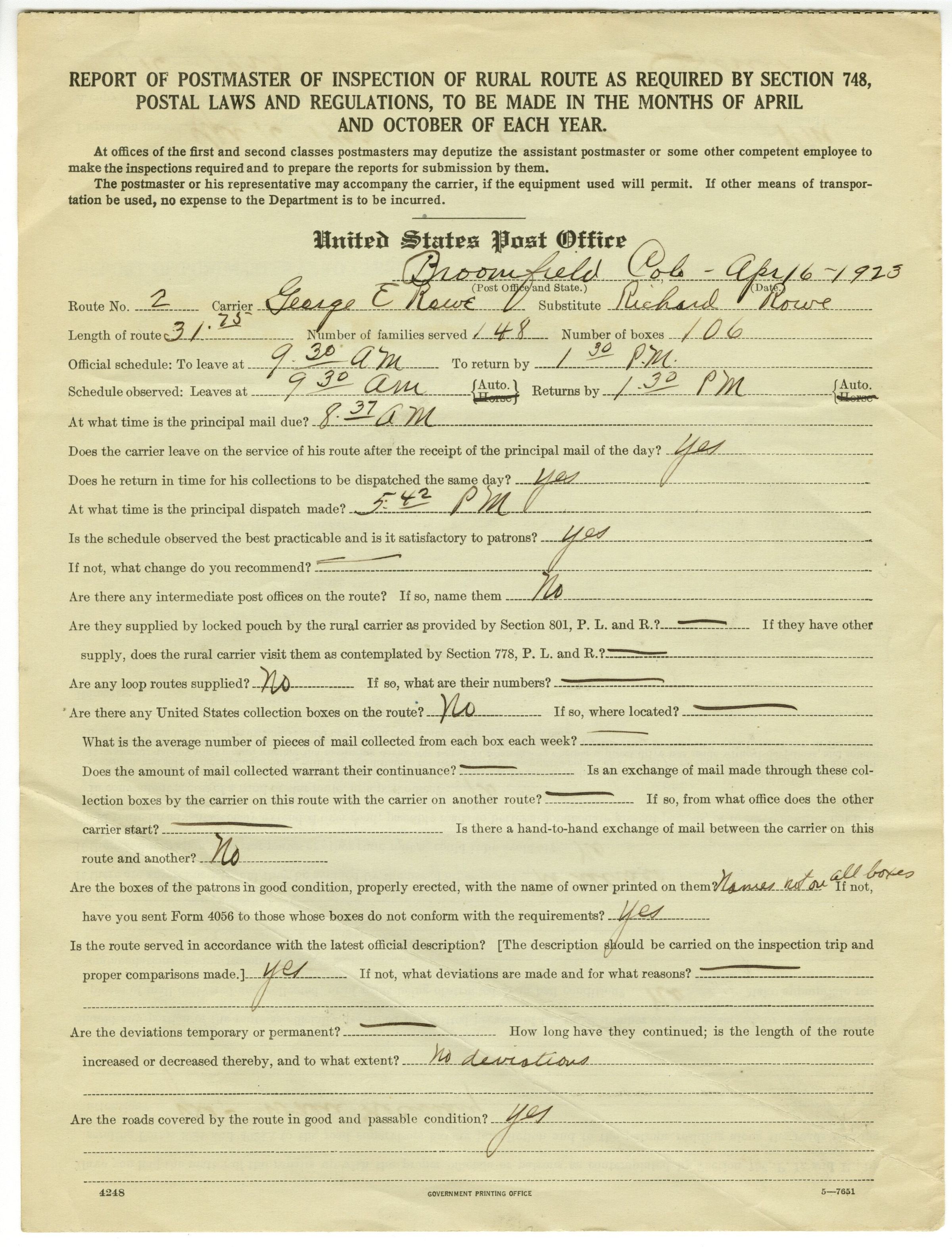 Report of Postmaster of Inspection of Rural Route as Required by Section 748, Postal Laws and Regulations, to be Made in the Months of April and October of Each Year. Dated April 16, 1923.Collection