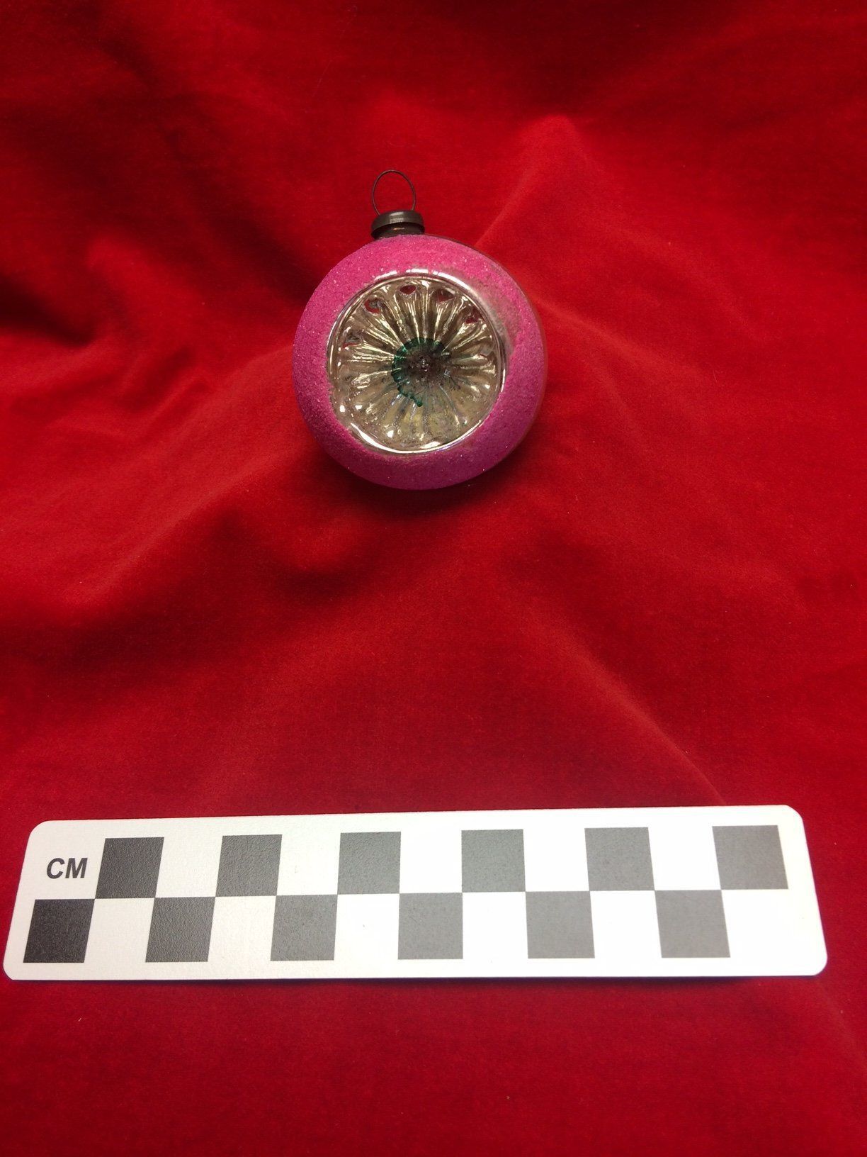 Silver molded glass holiday or Christmas ornament. Semi-sphere with faceted indent on one side. Indent has green over mirrored silver. Pink mica/glitter band around indent. Metal cap attached with thin wire loop inserted into top. No mark. The ornament measures 2" (dia) x 6" (circ).