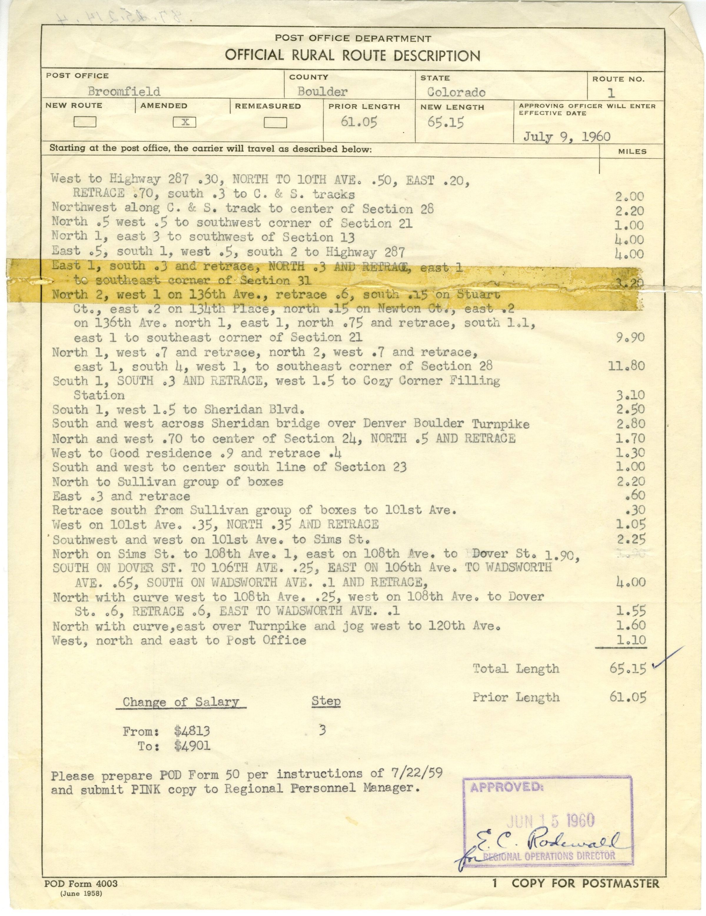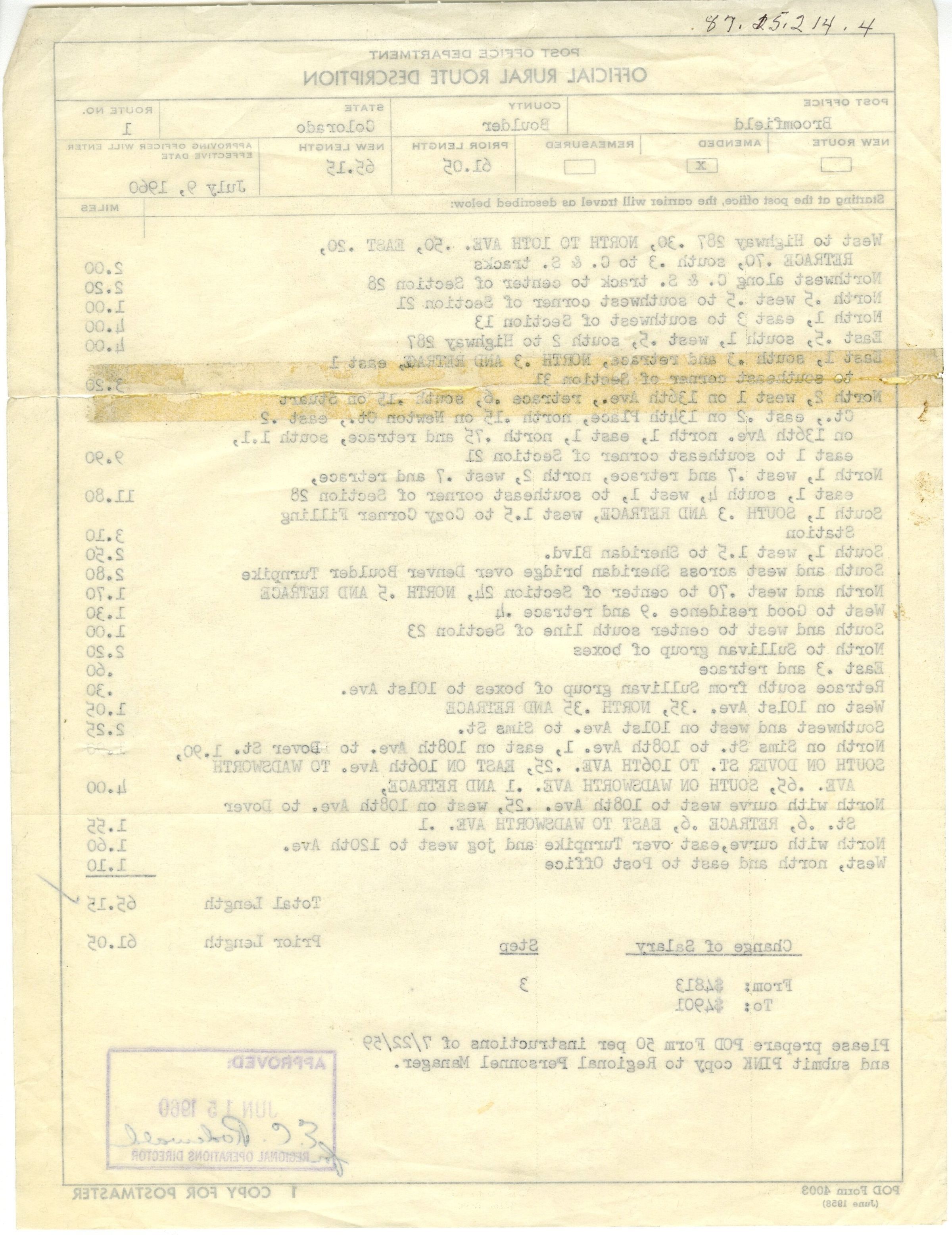 Post Office Department, Official Rural Route Description. Effective date: July 9, 1960.
