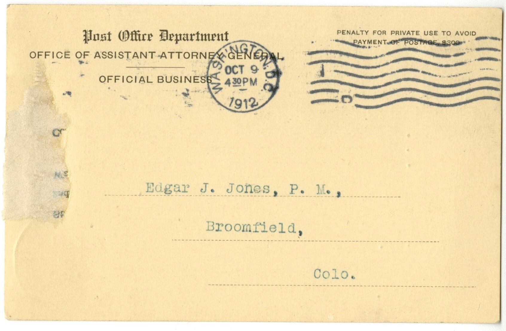 Postcard addressed to Edgar J. Jones, P.M., Broomfield, Colo. From the Post Office Deparmtent. Postal stamp from Washington D.C., Oct 9, 1912.