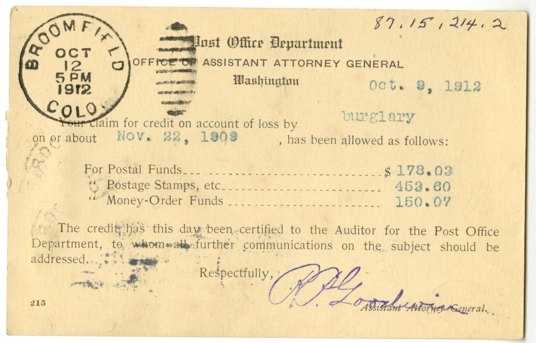 The credit has this day been certified to the Auditor for the Post Office Department, to who all further communications on the subject should be addressed." Includes postal stamp from Broomfield, Colo. Oct 12, 1912.Collection