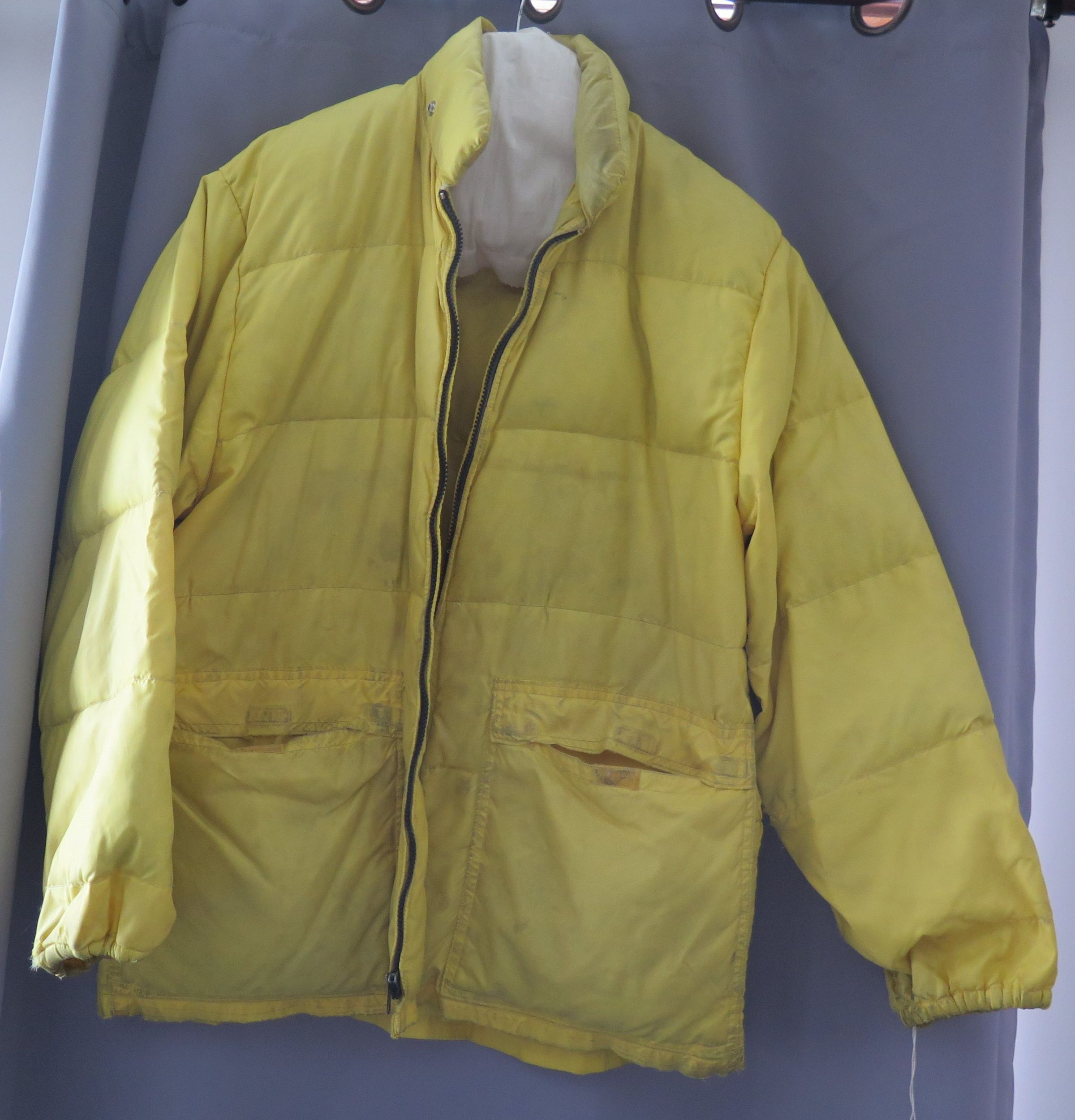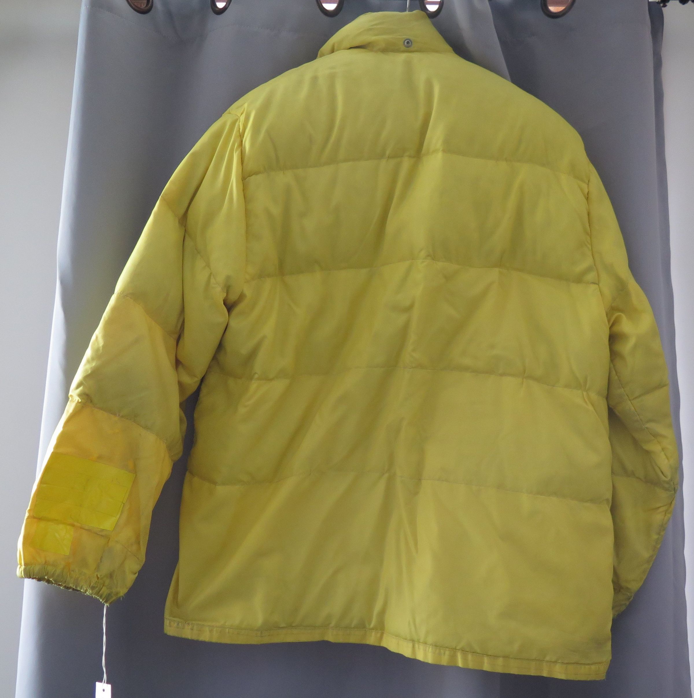 This is a yellow parka in size XL made from a Frostline Kit. The parka is filled with down and has a zipper closer up the front. There are three buttons around the collar on the outside, where a hood could have been attached. The parka has a large pocket on either side of the zipper. These pockets are lined with down and have velcro closures. The left sleeve has several holes in it that do not go through both layers of fabric. The down is no longer present in this sleeve, but the holes have mostly been covered with yellow tape. The parka measures 37" (w) x 34.5" (l).