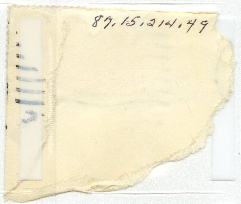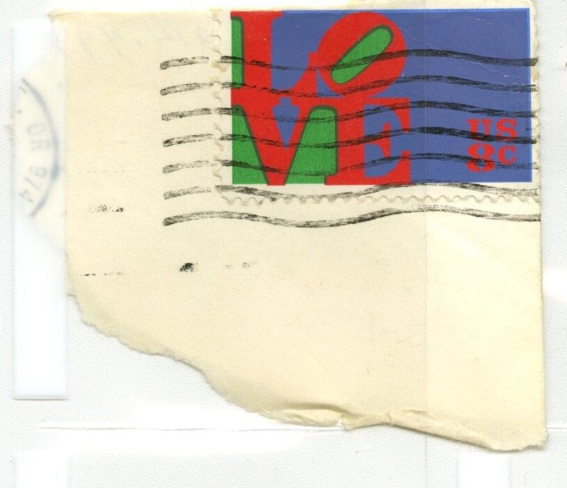 Stamp. LOVE, US, 8c. Blue stamp, red letters with green shadow. Still attached to the torn corner of a white envelope. Covered with the wavy lines of a postal stamp. Edge of postal stamp still visible.Collection