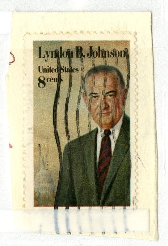 Stamp. Portrait of Lyndon B. Johnson, his name on top. Capitol building in background. United States, 8 cents. Covered by wavy lines of postal stamp. Still attached to the corner of a white envelope.Collection