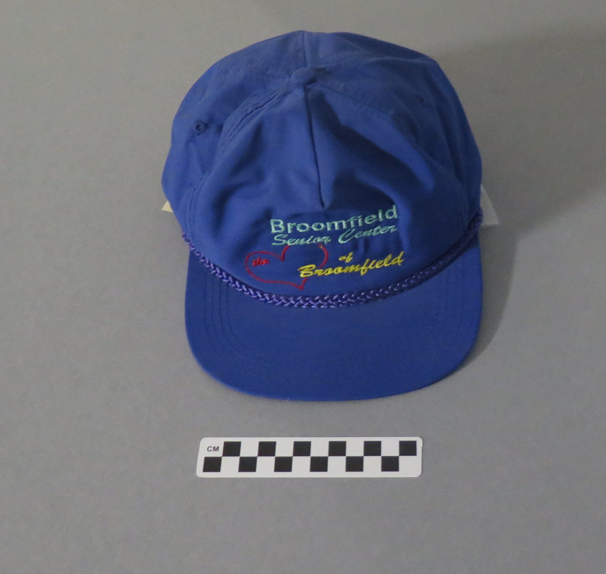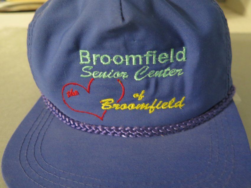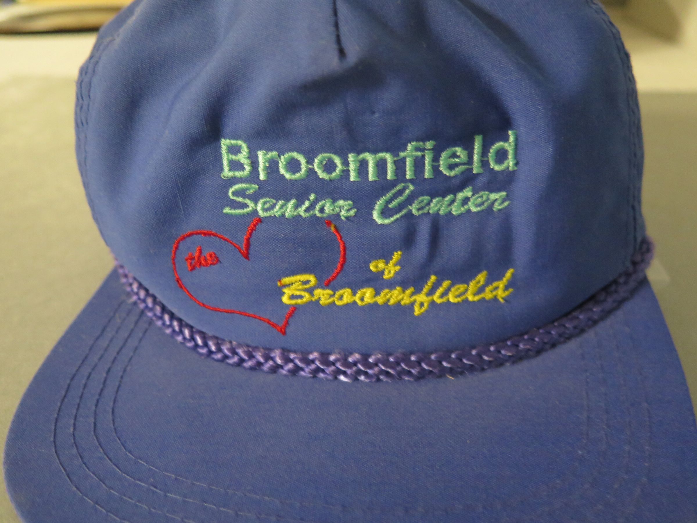 This is a dark blue baseball style cap with an adjustable strap in the back. The cap has "Broomfield/ Senior Center" embroidered on the front in light blue thread. Below this is a red heart with the word "the" inside of it and then to the right of this is "of/ Broomfield" in yellow thread. The white tag inside the cap indicates that it was made by Sportcap, and one size fits all. The cap has been flattened so that the bill is not curved. The cap measures 5" (h) x 8" (w) x 11" (d).