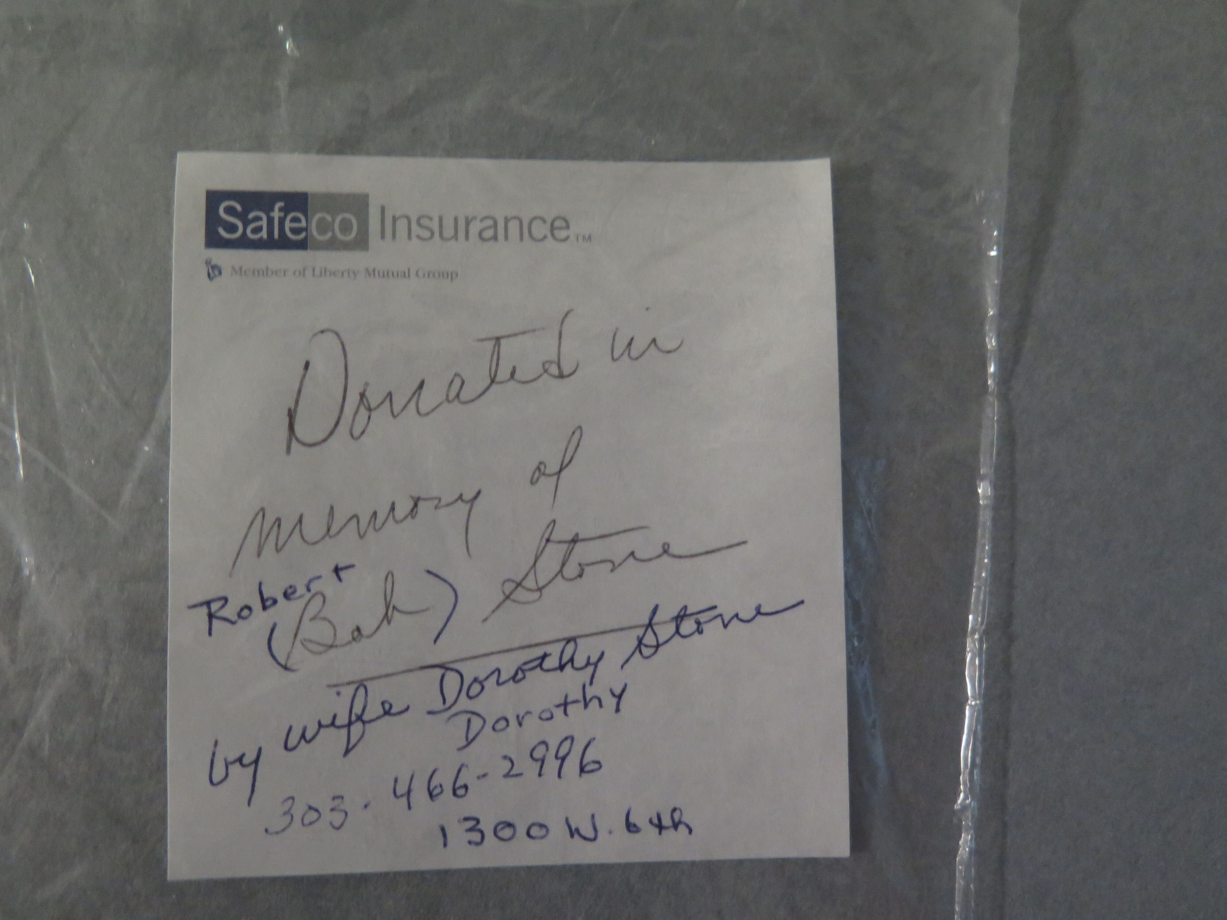 Sticky note attached to the hat reads, "Donated in memory of Robert (Bob) Stone by wife Dorothy Stone Dorothy 303-466-2996 1300 W. 6th".