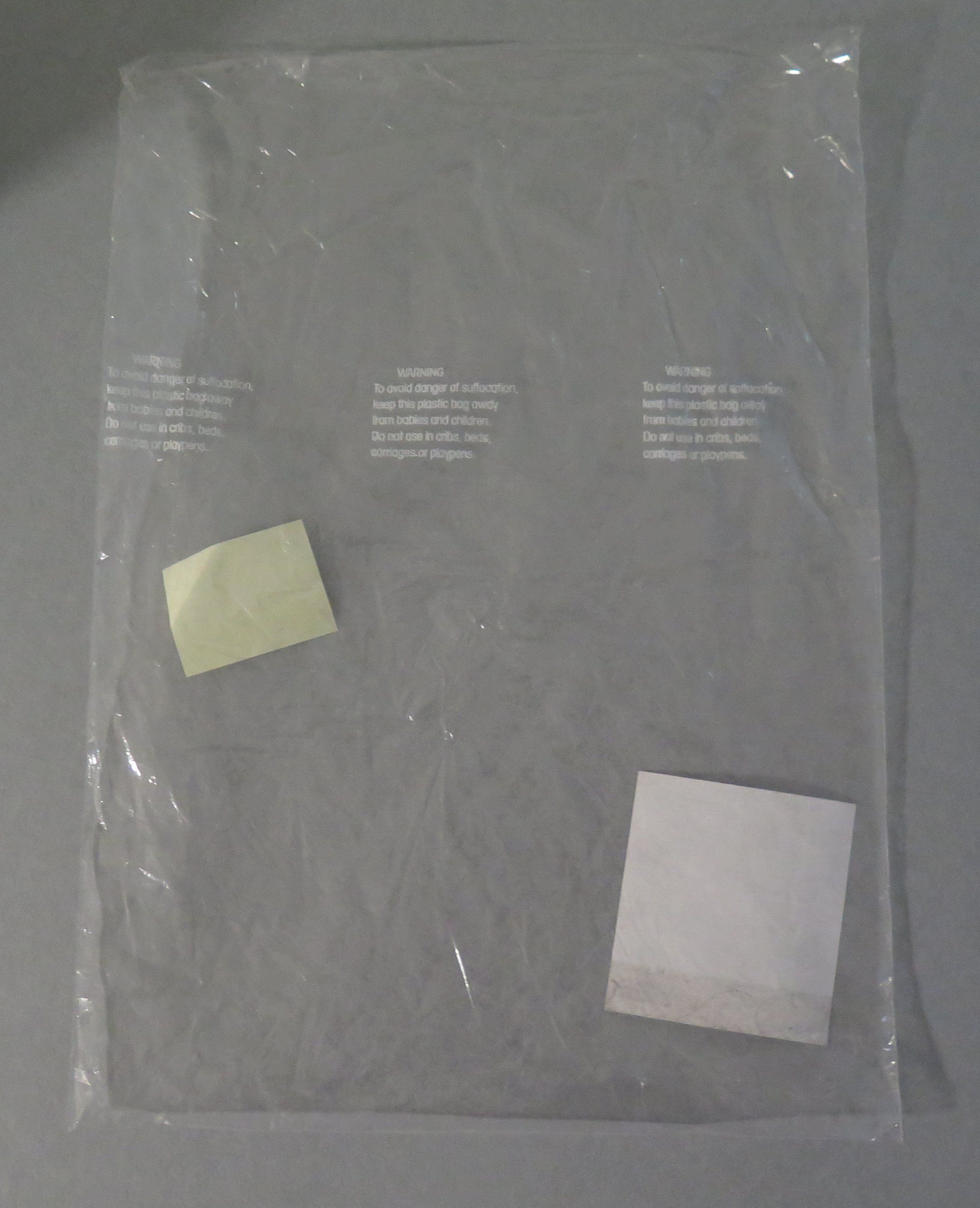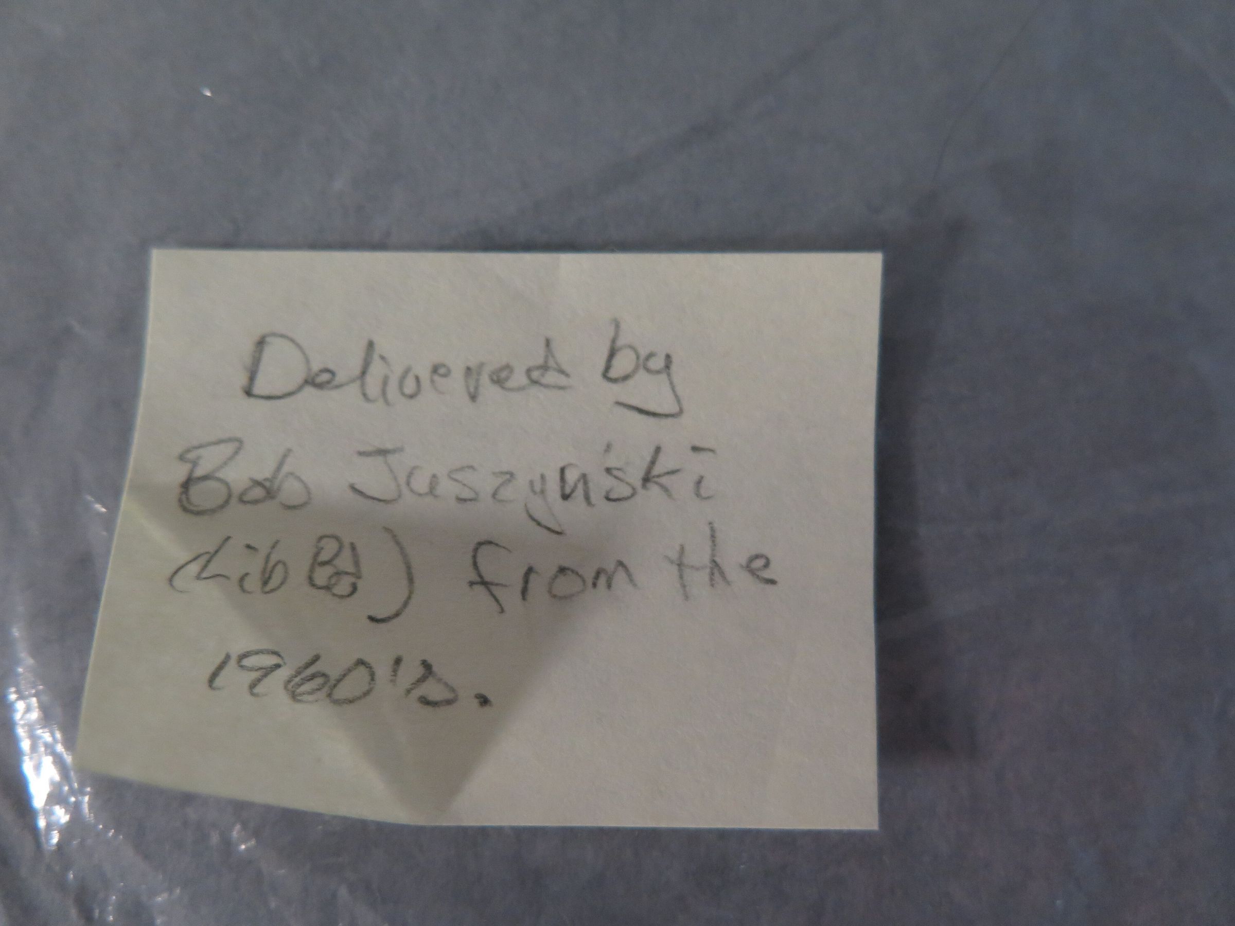 Sticky note attached to the bag reads, "Delivered by Bob Juszyhiski (Lib Bd) from the 1960's."