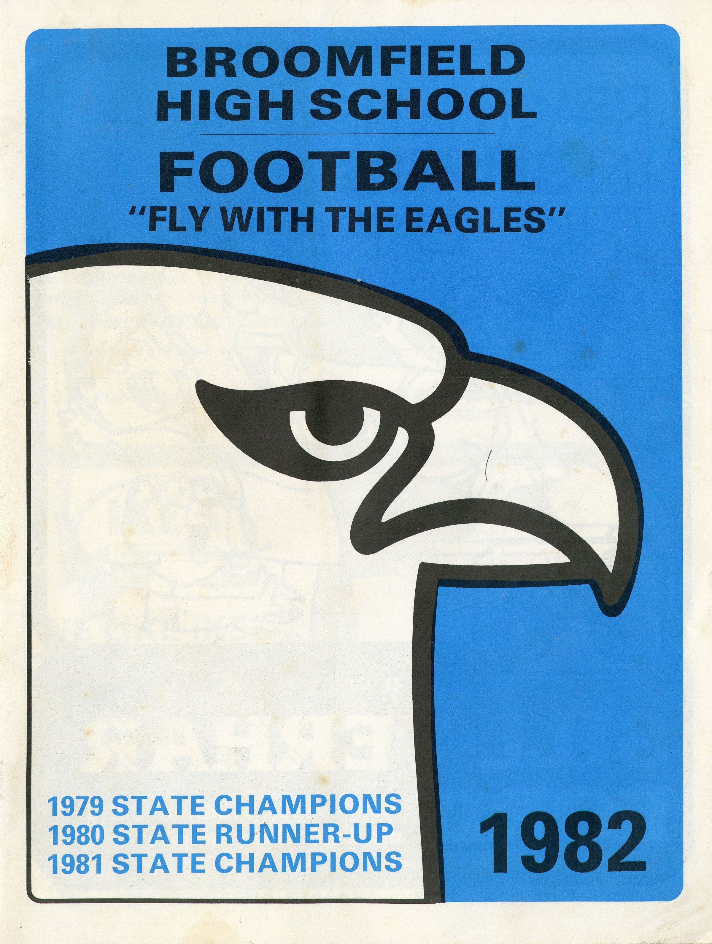 A paperback booklet titled "Broomfield High School Football "Fly With The Eagles'" entirely in capital letters. It's of the year 1982 and in the corner it reads "1979 STATE CHAMPIONS, 1980 STATE RUNNER-UP, 1981 STATE CHAMPIONS" in blue text. The cover features a simple and graphic drawing of an eagle's profile in bold, thick lines without color on a blue background.