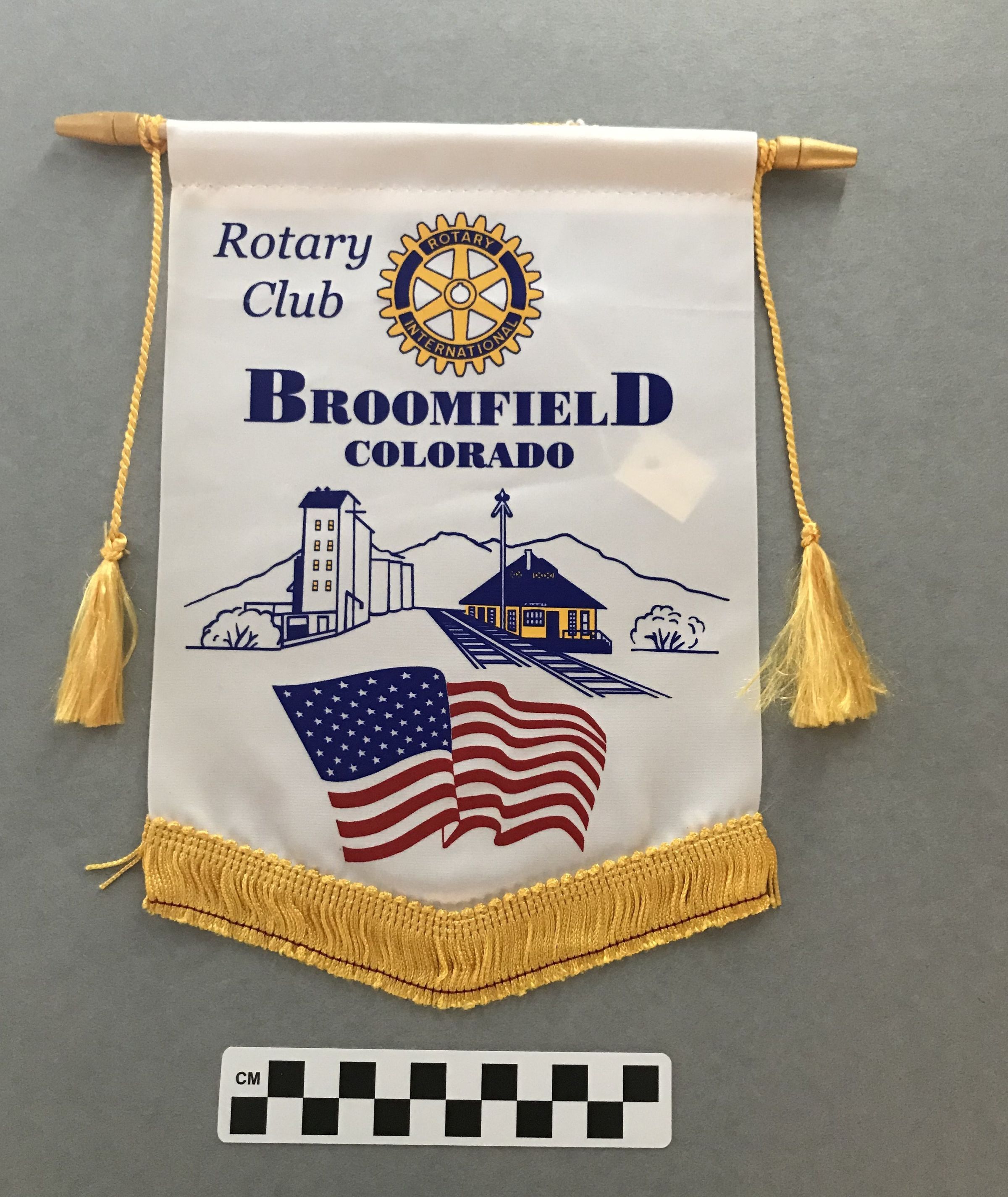 This is a banner made by the Rotary Club and depicting the Broomfield Depot in the original location. The banner is a white piece of fabric looped over a wood rod with pointed wooden ends attached to either side. The banner has yellow fringe at the bottom and a yellow fabric rope tied across the top and ending in a tassel on either side of the banner. In the middle of the banner is the text "Rotary/ Club", the Rotary International logo, the text "BROOMFIELD/ COLORADO", an image of the Broomfield Depot in the original location along the tracks, and an American flag. The text on the back of the banner near the top reads, "Russell Hampton Company/ New Century, Kansas/ 1-800-877-8908/ www.ruh.com". The banner measures 9.5" (w) x 10.25" (l).Lexicon
