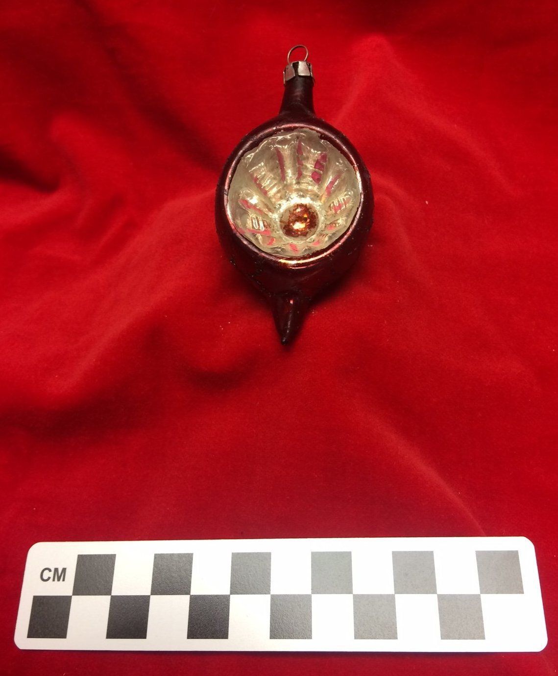 Glass Christmas tree ornament with an ellipsoidal shape, pointed at top and bottom, and one indent. The ornament is silver with a red-brown garnet-colored finish. The indent is silver and has a red-brown dot in the center and pink stripes on the sides. The ball has a scalloped pattern of glue that may have been covered in glitter/mica at one time. Metal cap attached with bent metal loop inserted for hanging. Metal cap has text, "Poland." Poland began exporting silver indented ornaments in the mid-1930s. The ornament measures 2" (dia) x 6" (circ).