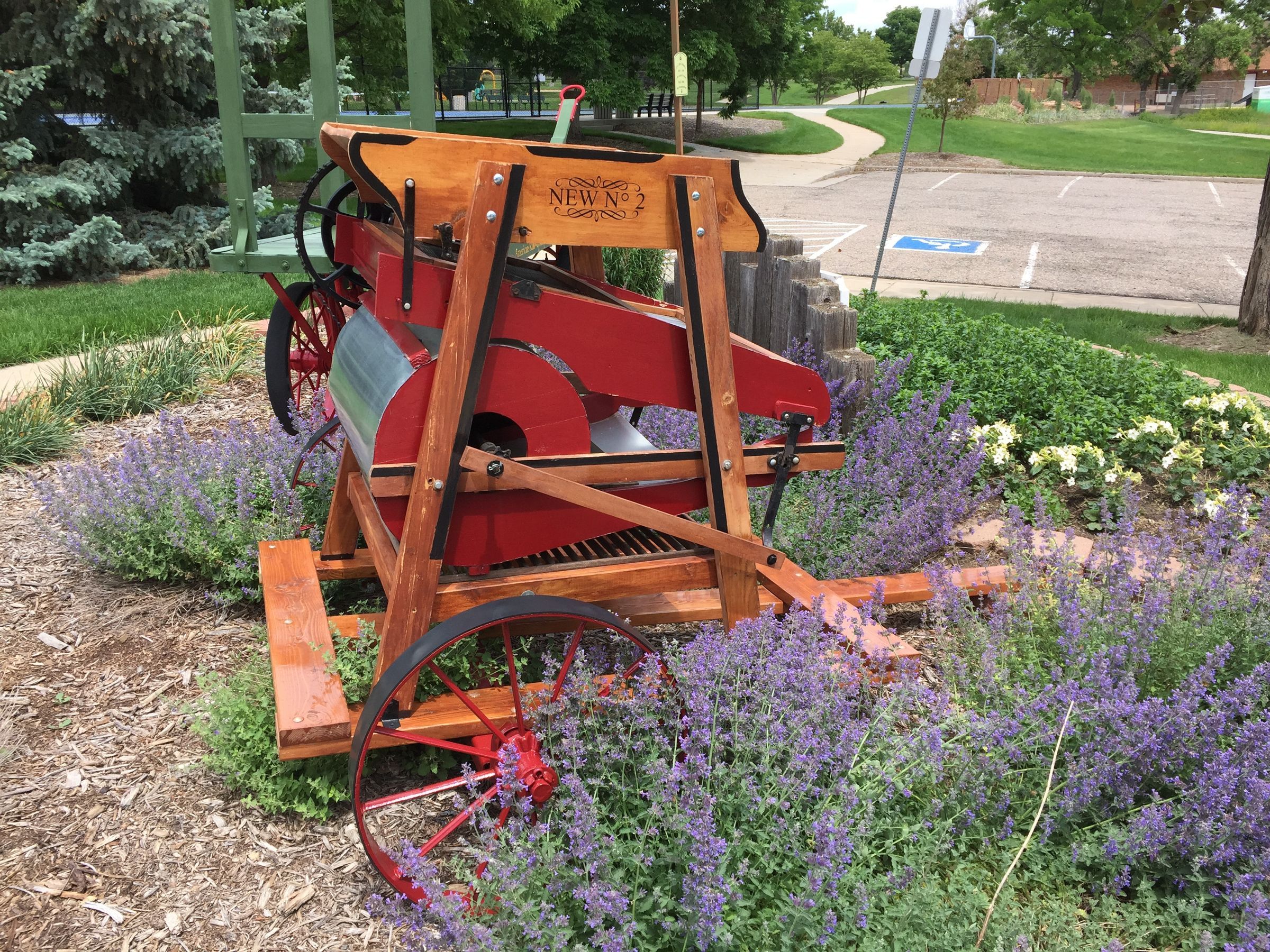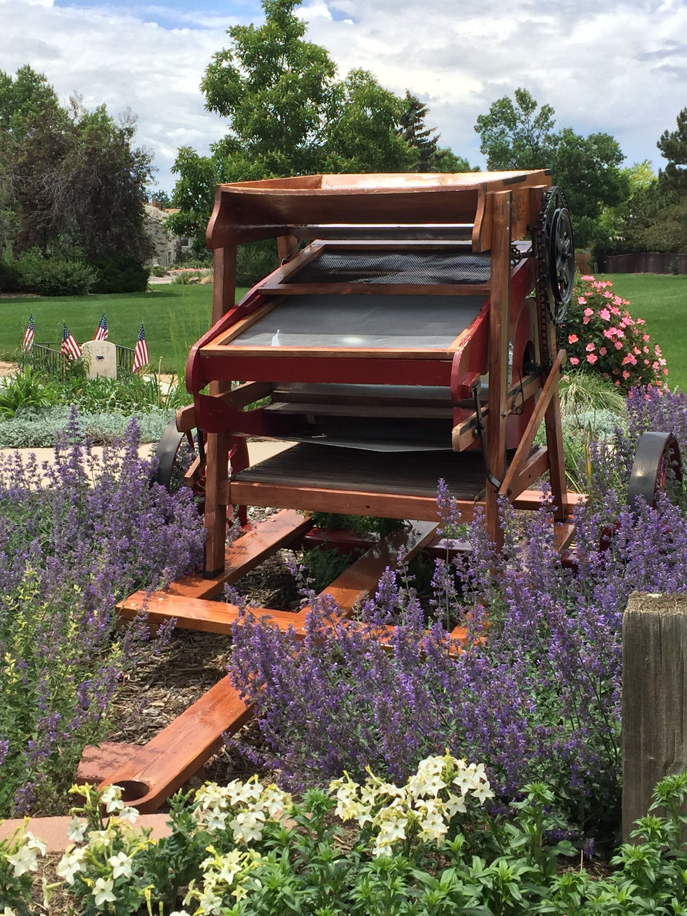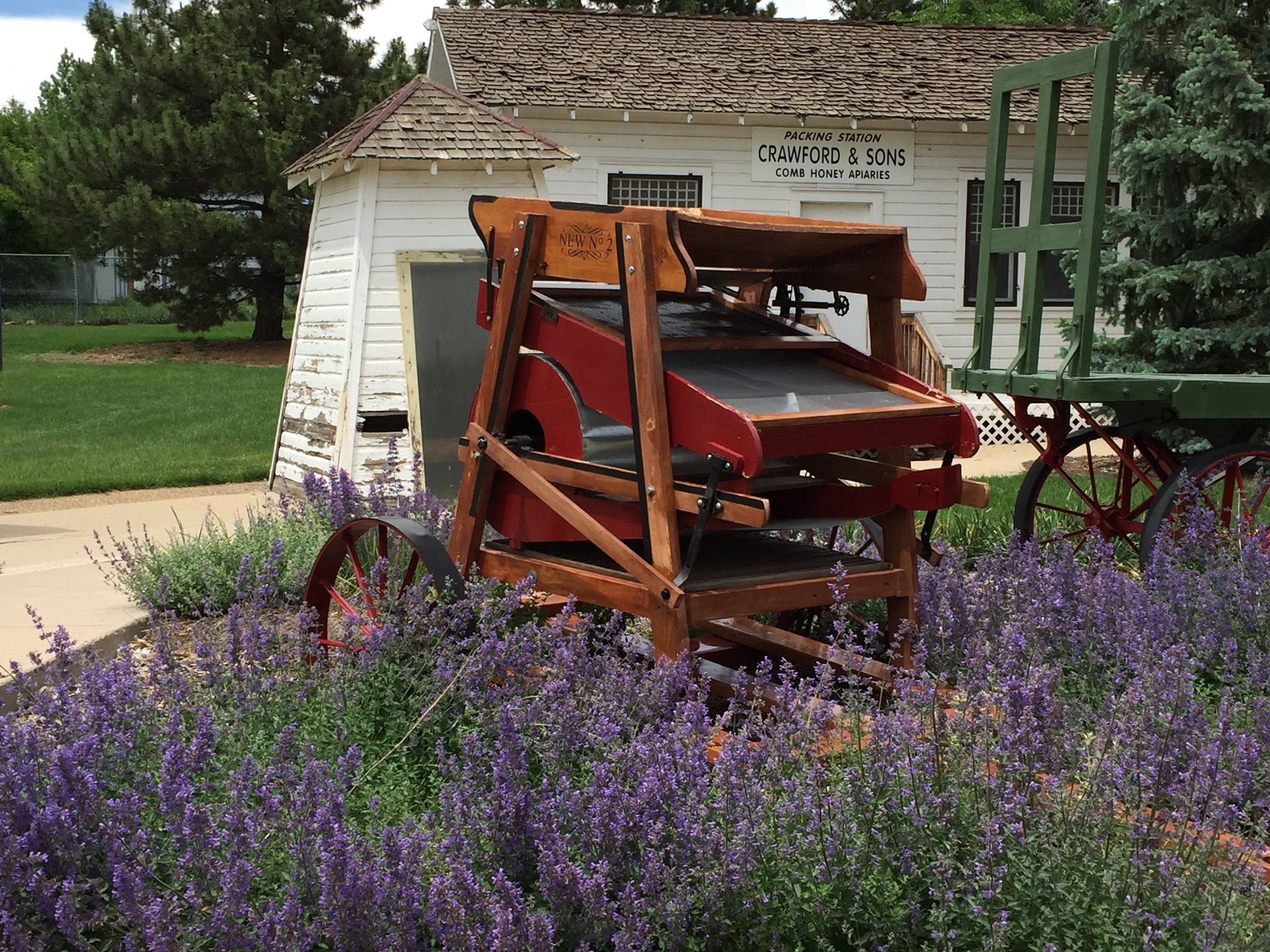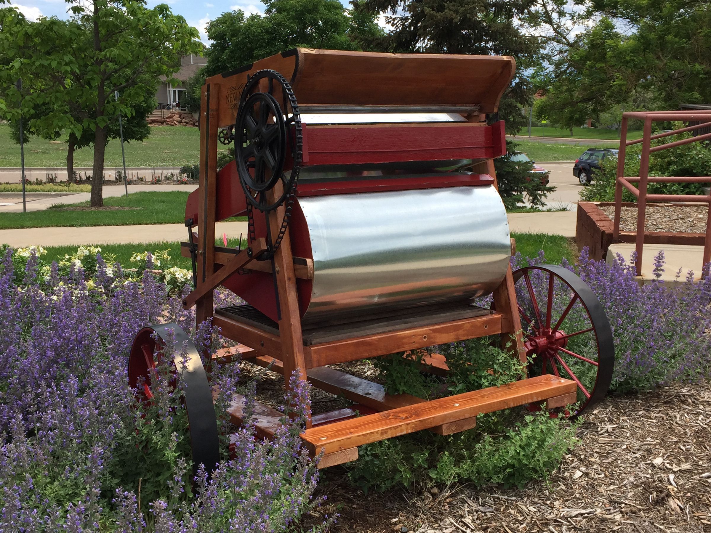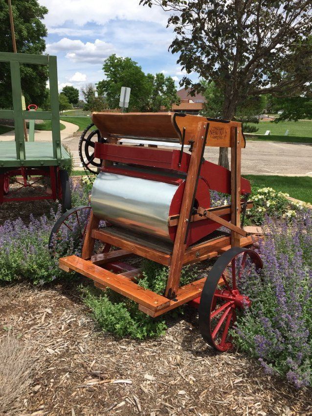 This is a fanning mill with a wood frame, metal screens and hardware, and metal wheels attached to the base to make it mobile. The fanning mill is a winnowing machine that separates the chaff, dust, weed seeds, dirt, stones, etc. from the grains that can be eaten. By removing the contaminents, the grains would preserve better.