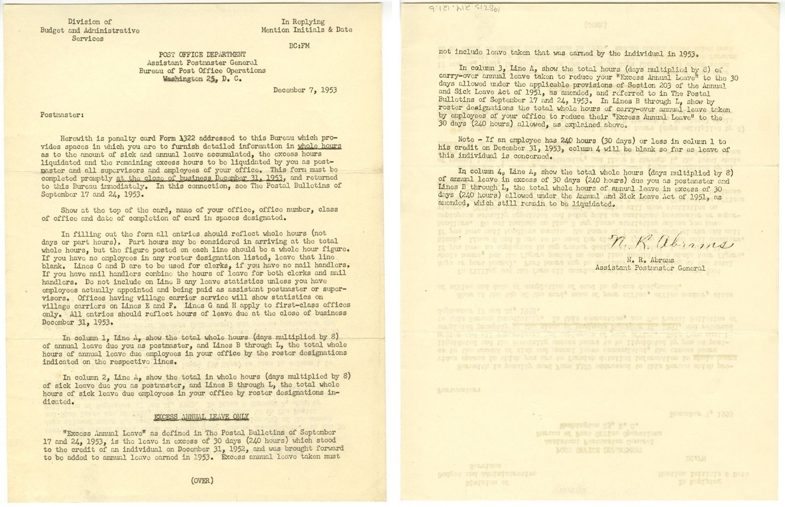 B: Letter regarding annual leave and hours from N.R. Abrams, Assistant Postmaster General. December 7, 1953. (inside front cover)