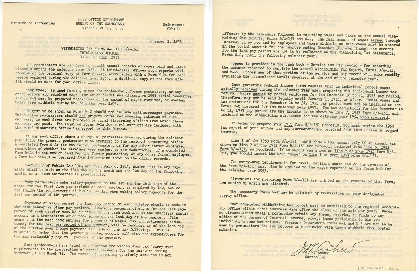 C: Letter titled "Withholding Tax Forms W-2 and B/A-151 Third-Class Offices Calendar Year 1953. December 1, 1953. (inside front cover)
