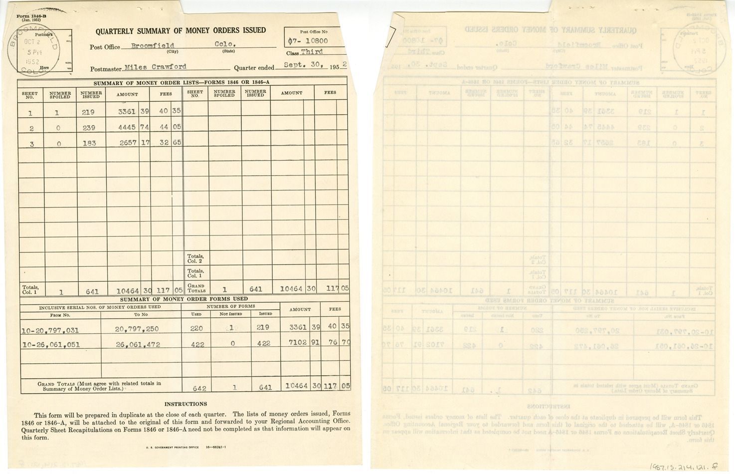 S: Qarterly Summary of Money Orders Issued, dated Sept. 30, 1953.