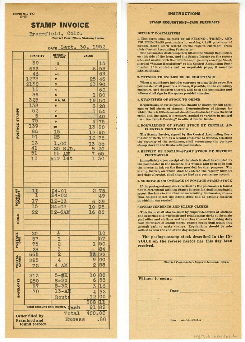 X: Note from United States Post Office, purple stamp: Broomfield Colo. Dec 28, 1953.