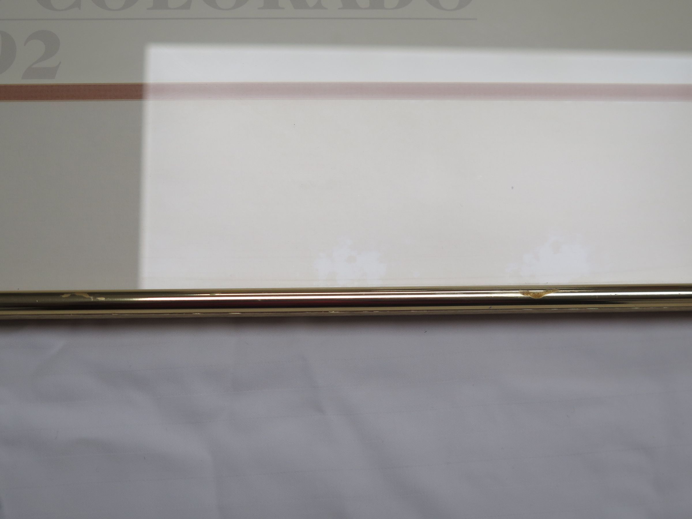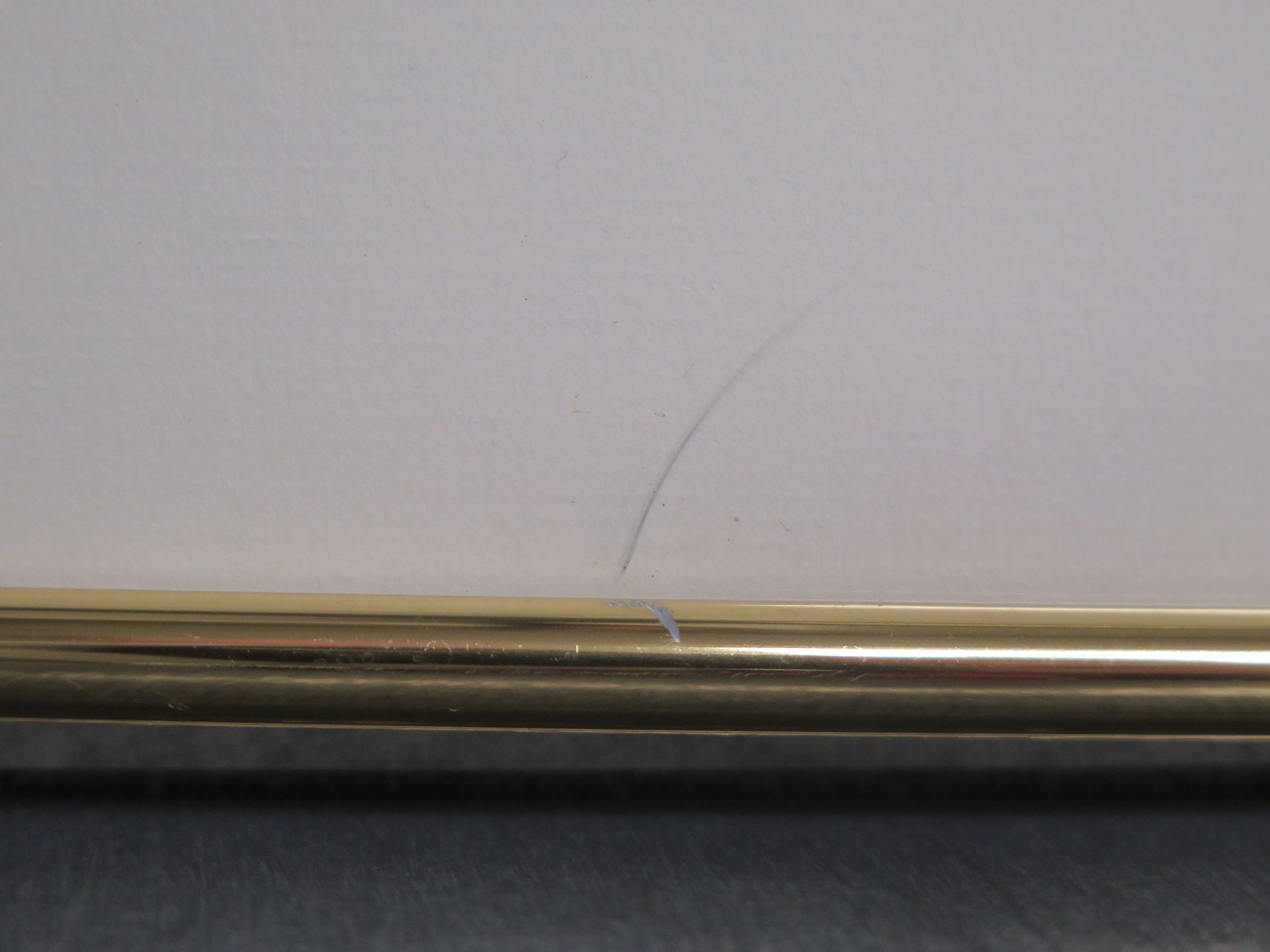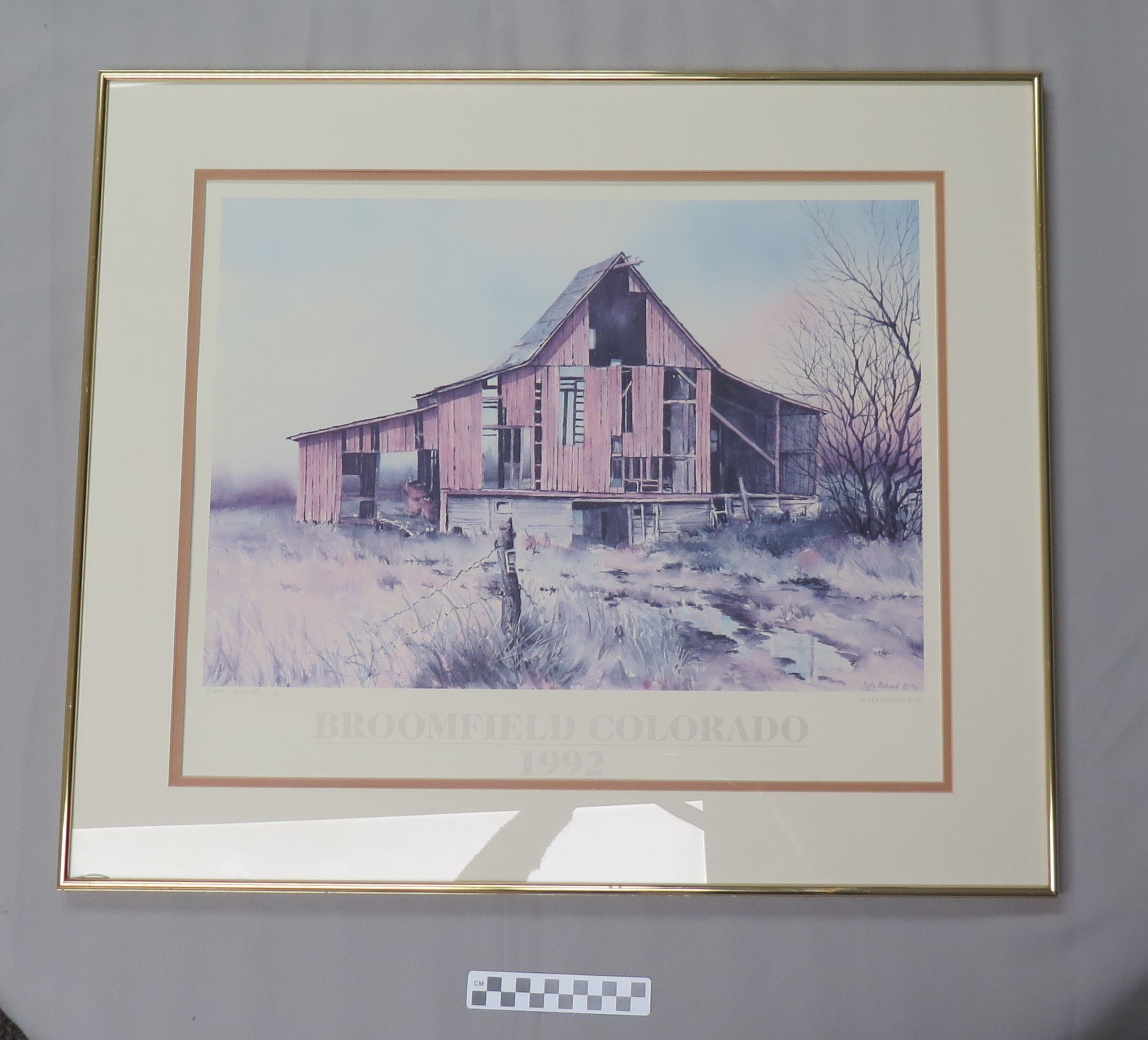 This is a framed print of an illustration of an abandoned structure in a field. The frame is gold colored metal, and the painting is done in muted tones. There is a barren tree on the PL side of the illustration, and a fence post with barbed wire in the foreground.Collection