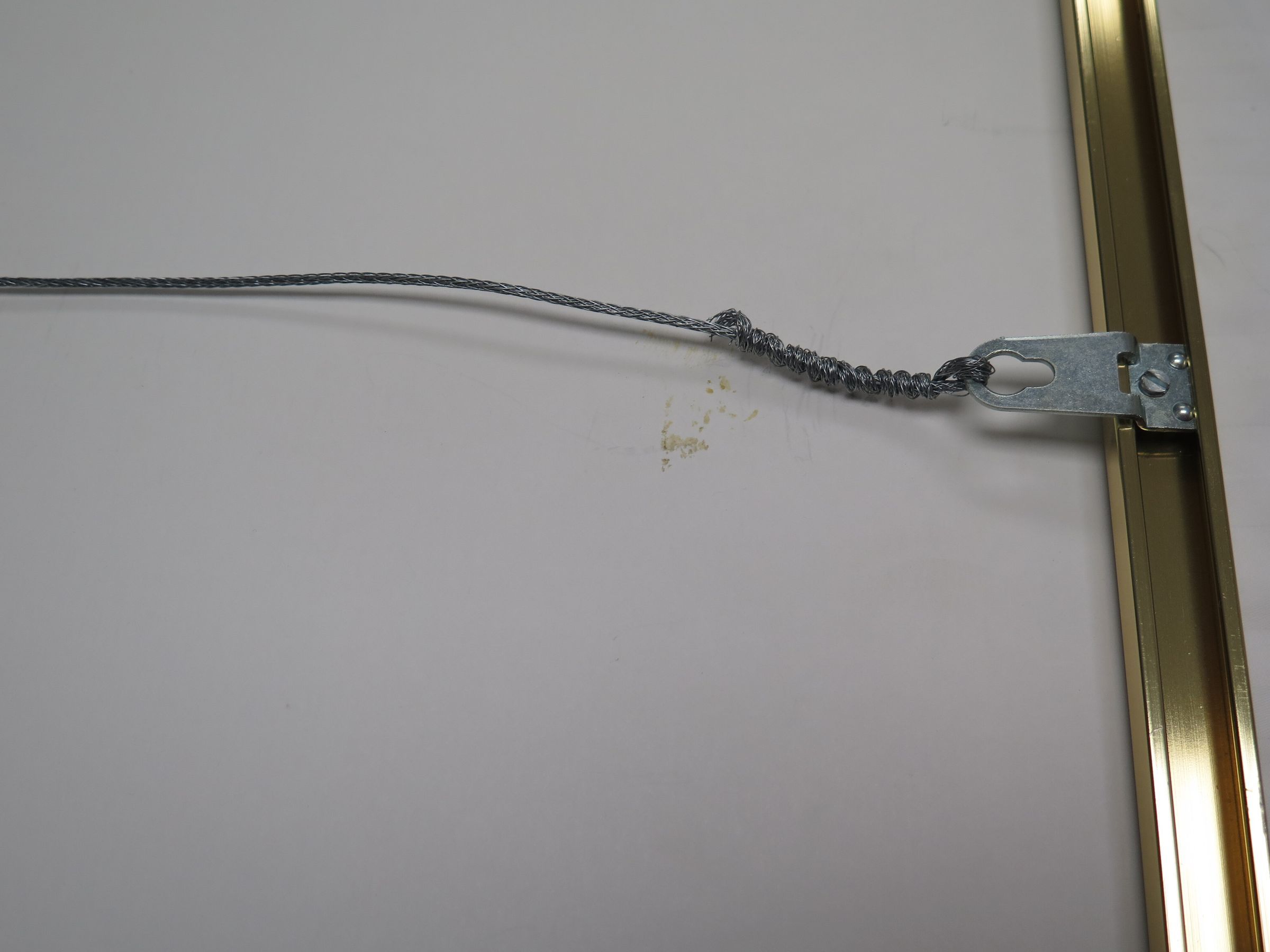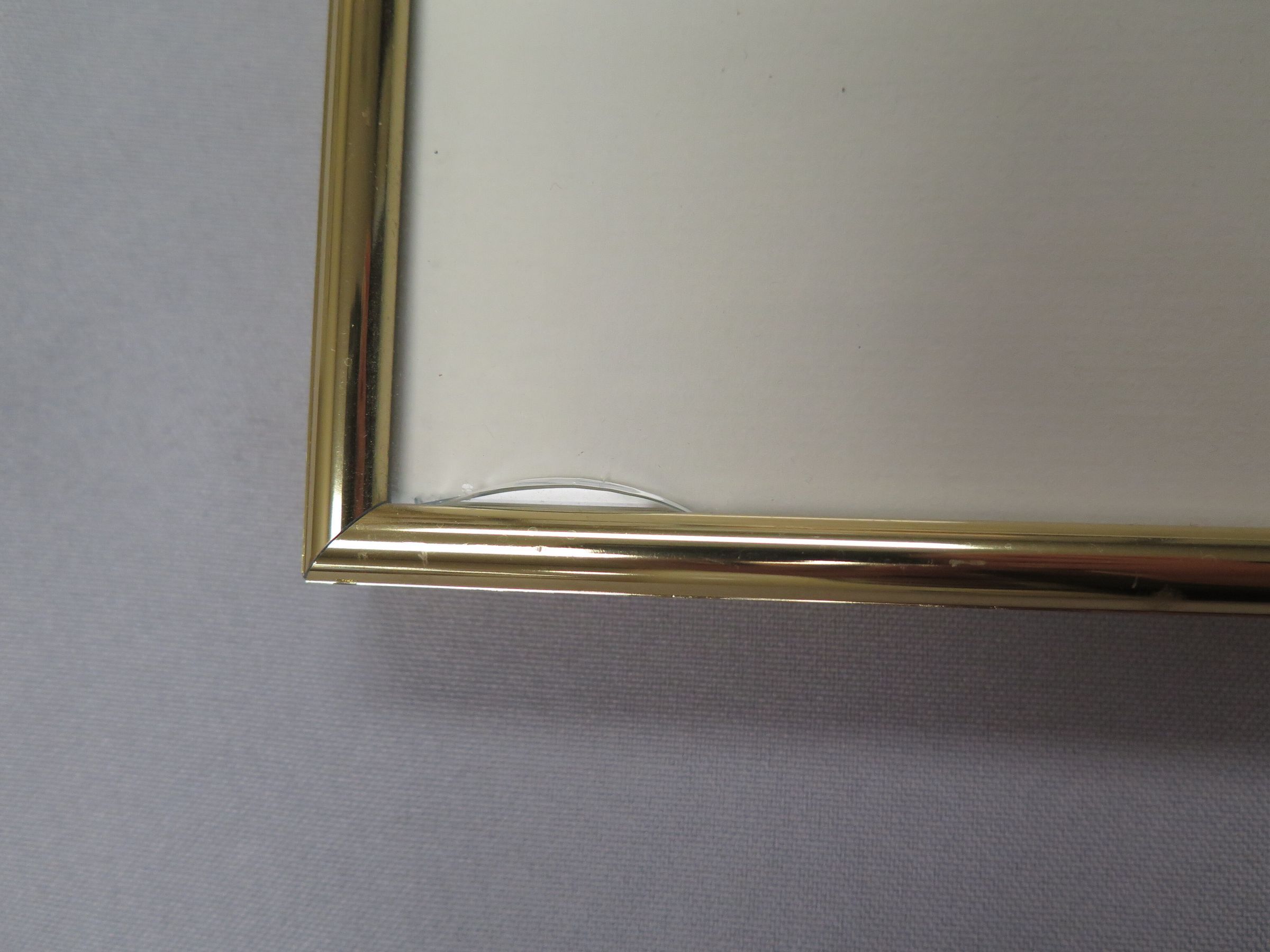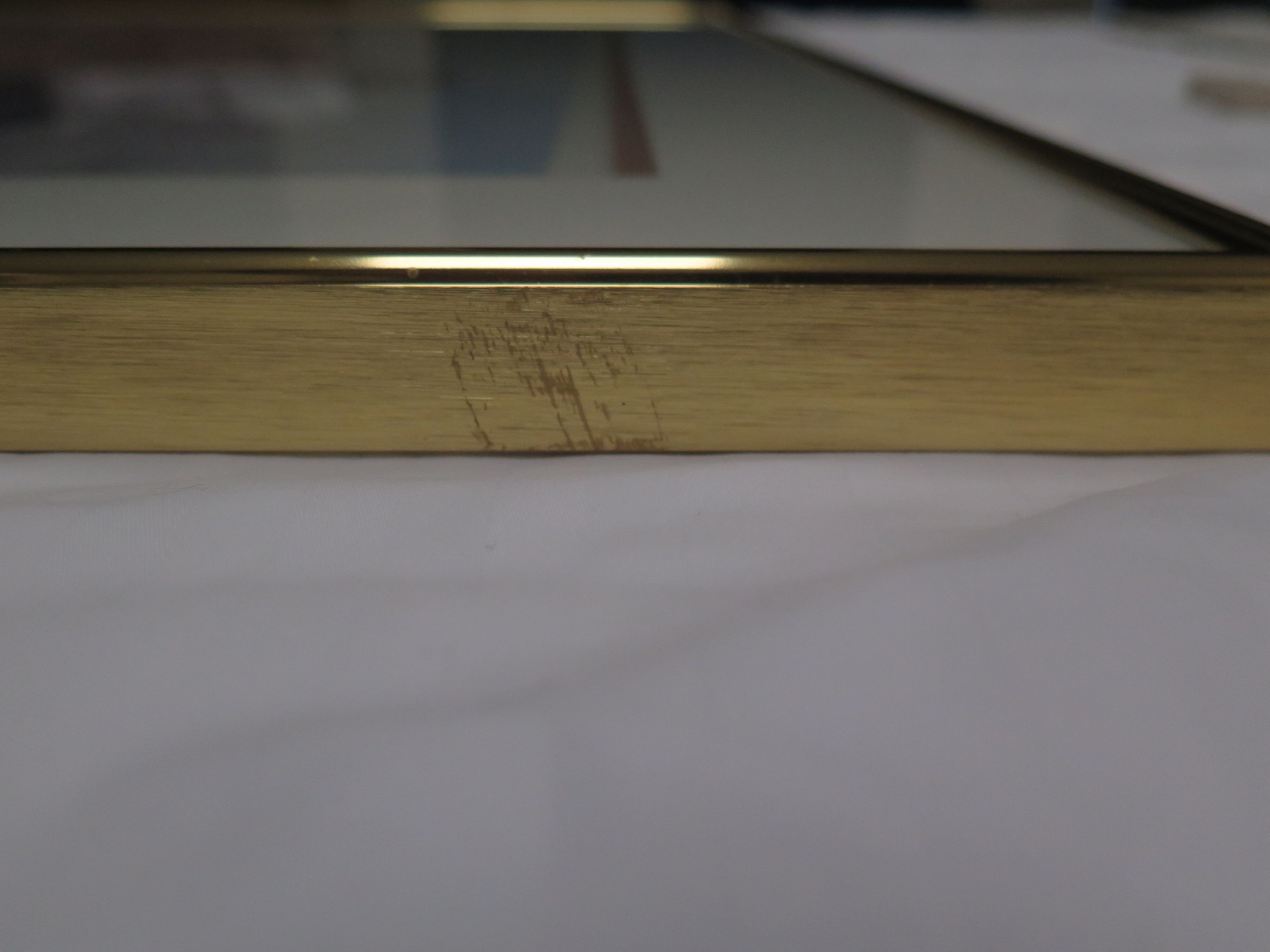 This is a framed print of an illustration of an abandoned structure in a field. The frame is gold colored metal, and the painting is done in muted tones. There is a barren tree on the PL side of the illustration, and a fence post with barbed wire in the foreground.Collection