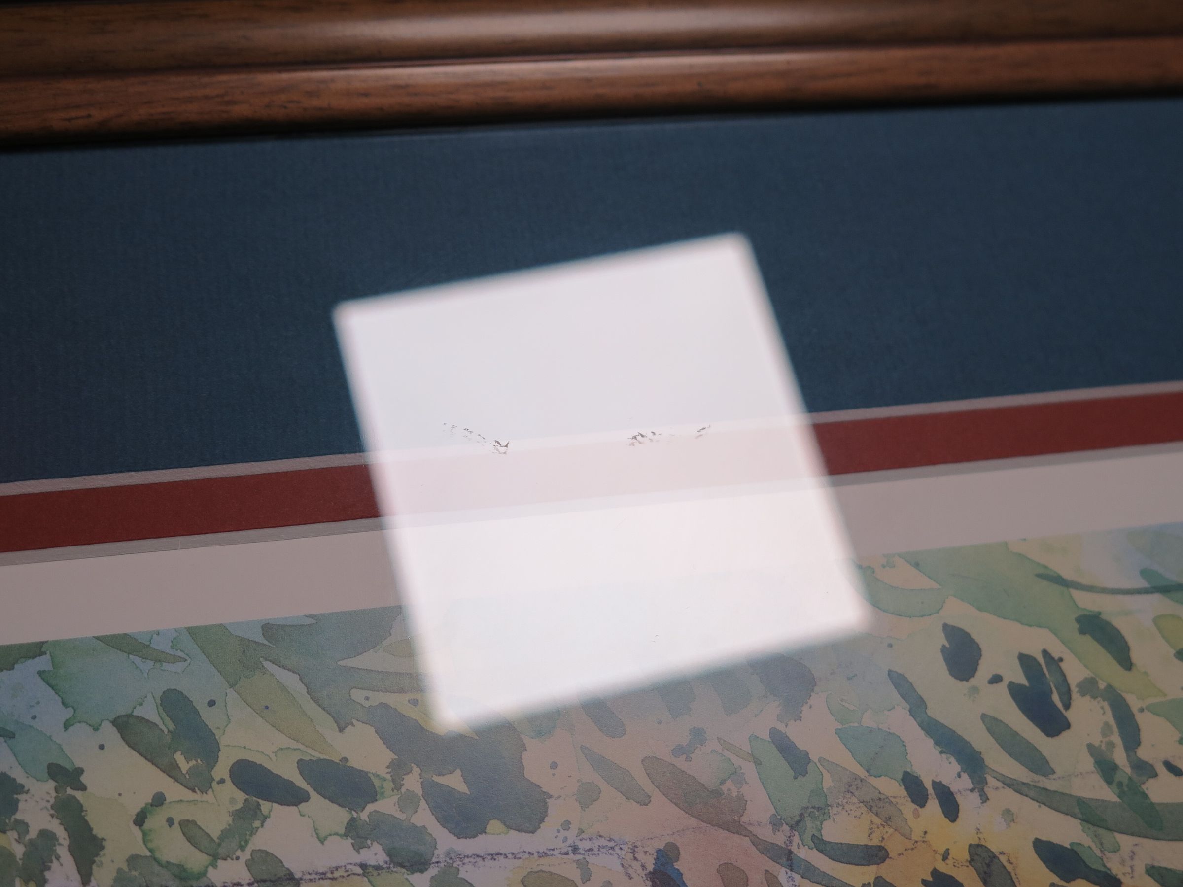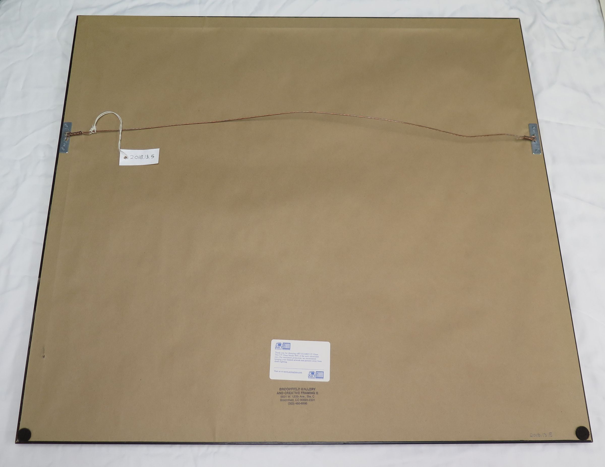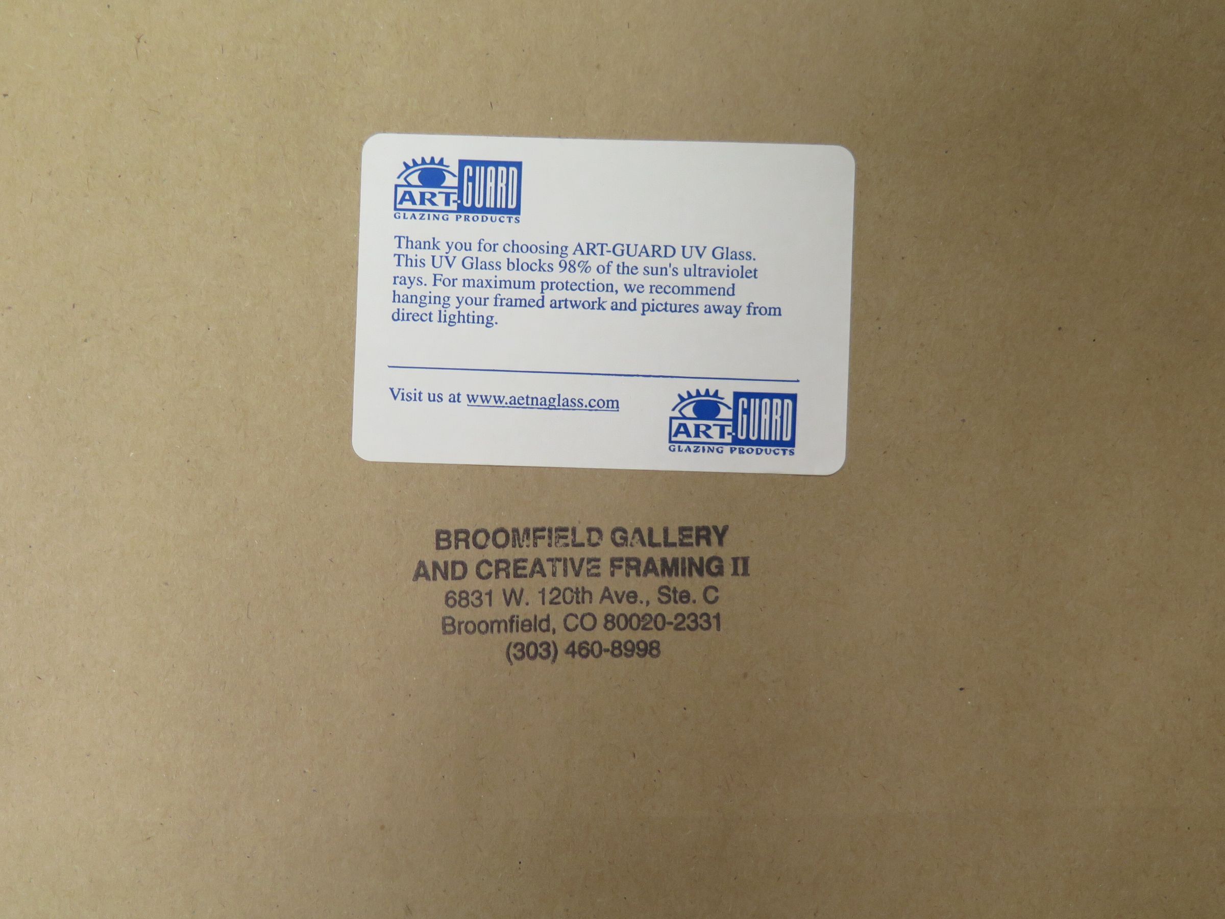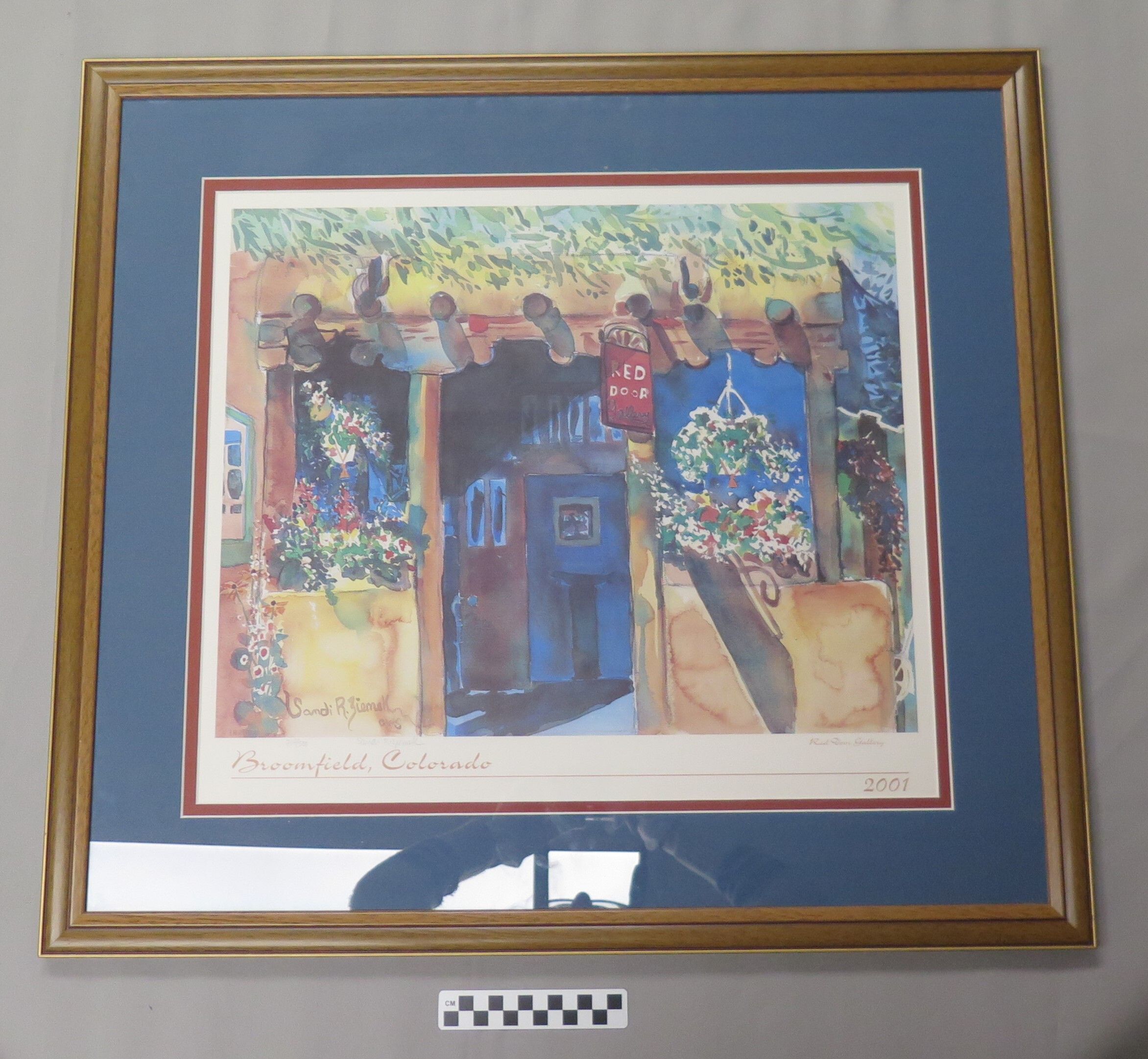 Framed print of a watercolor an adobe style structre with a red sign that reads "Red Door Gallery". There are green leaves across the top of the composition, and two openings two either side of the middle archway. In each of the openings there are hanging planters and planters on each of the ledges. At the PL of the illustration there is a bundle of chili peppers hanging from the side of the building. In the bottom PR cornerthere is the artists signature "Sandi R. Zeimek CWS". Below this, in pencil is written "214/500 Sandi R Zeimek" and below this in tan printed script reads "Broomfield, Colorado. In the bottom PL corner under the illustration in the same tan printed script reads "Red Door Gallery/ 2001".Collection