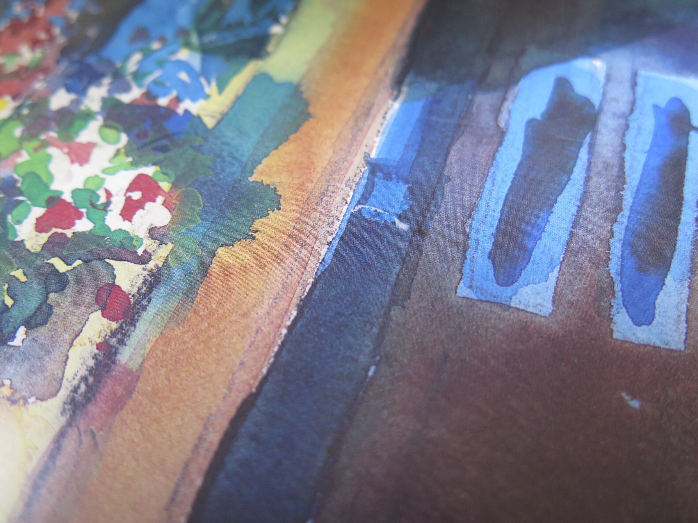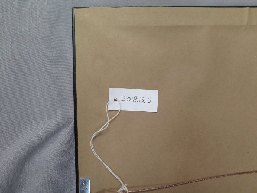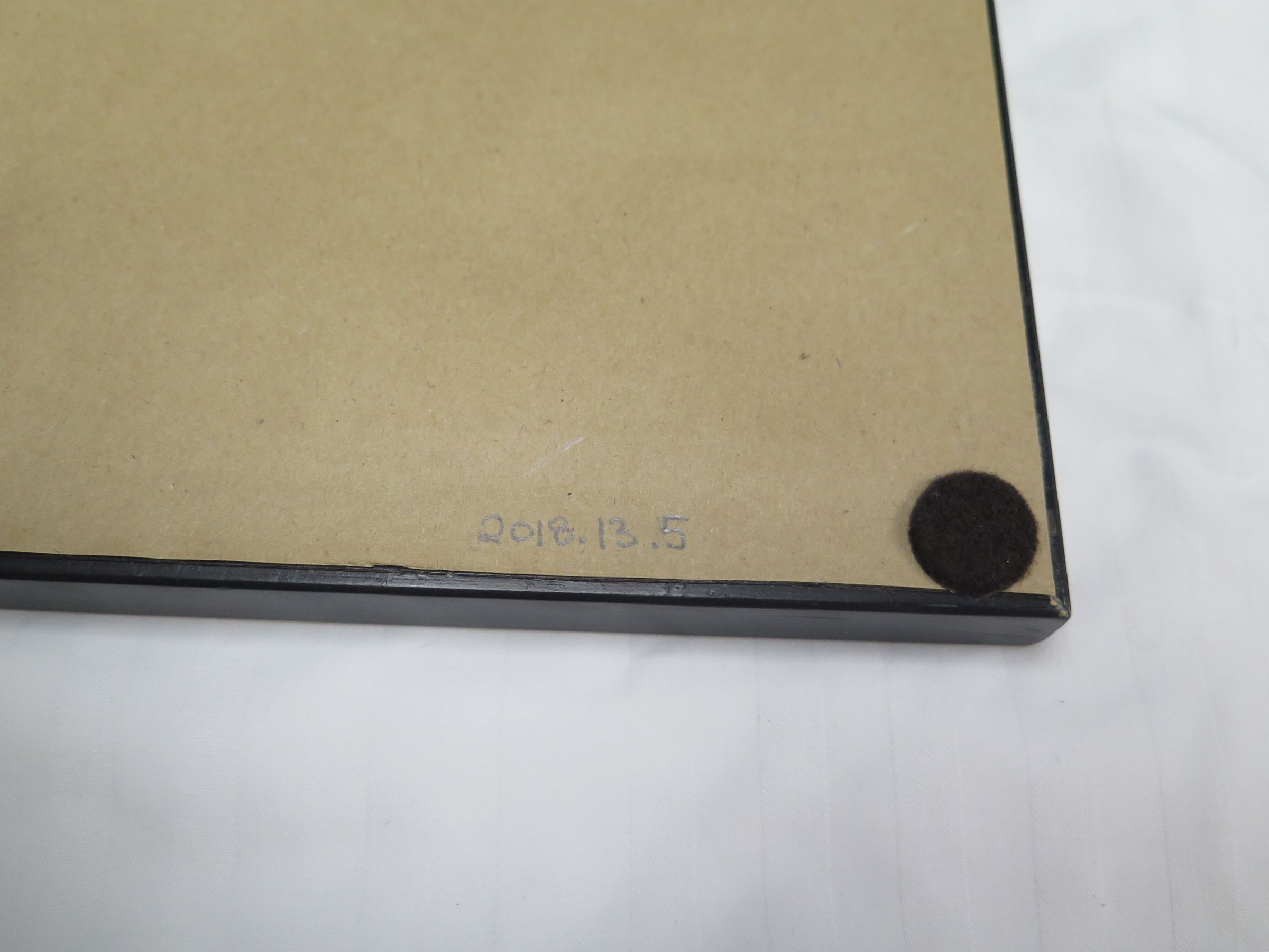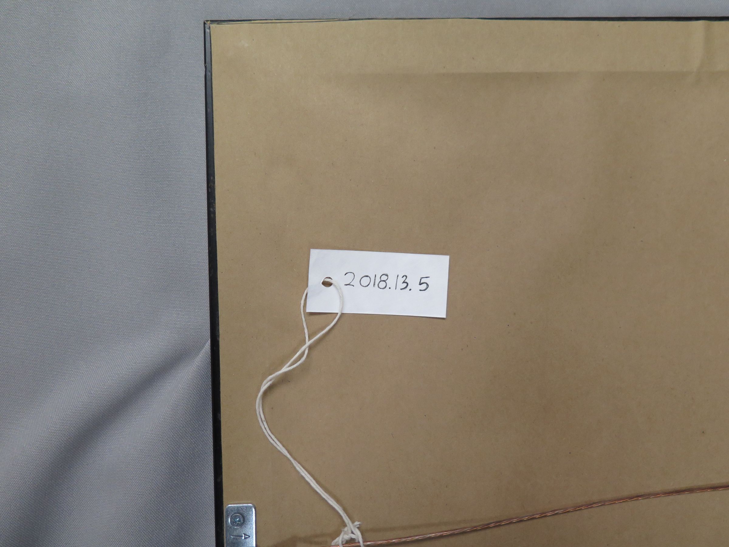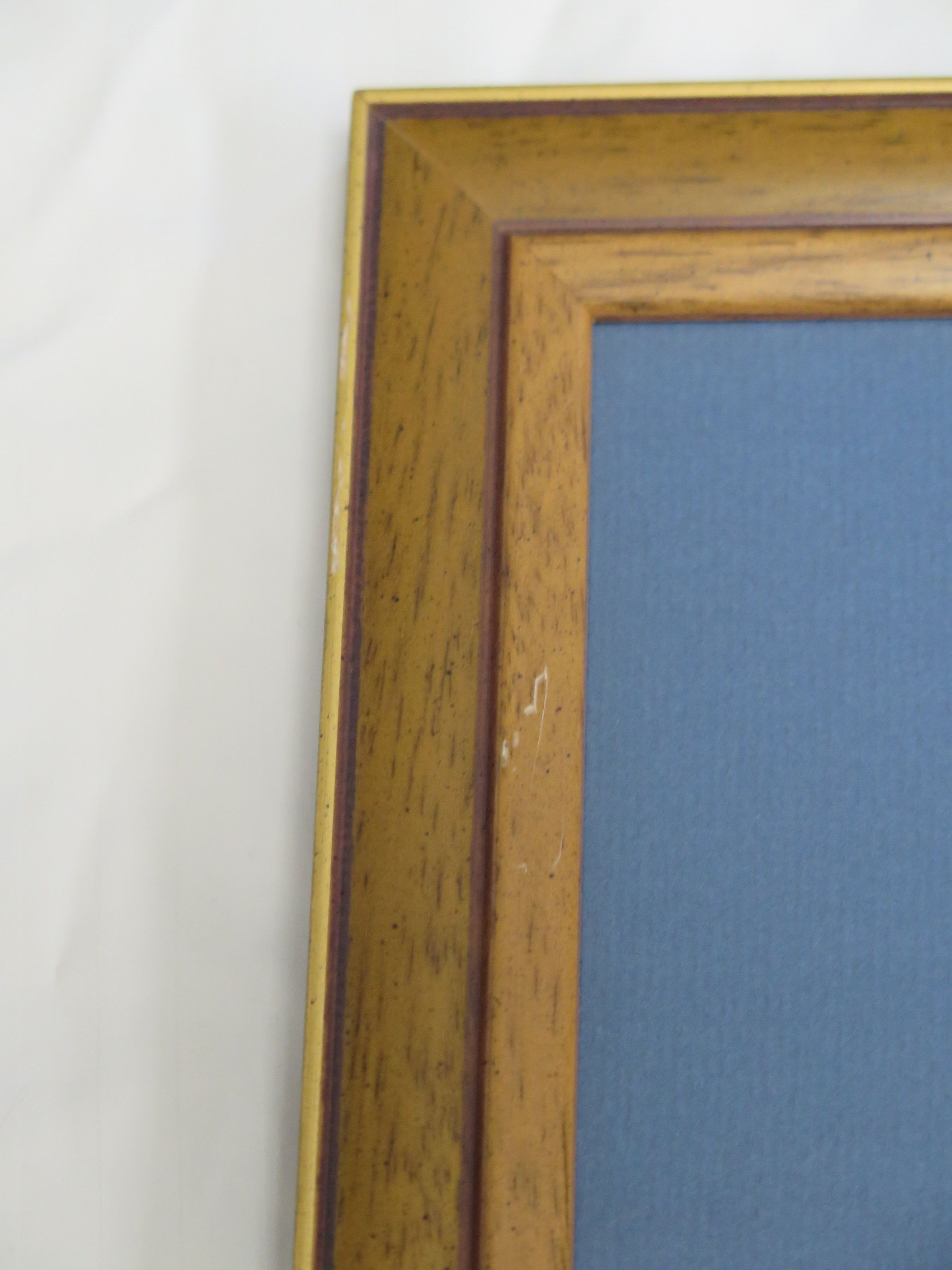 Framed print of a watercolor an adobe style structre with a red sign that reads "Red Door Gallery". There are green leaves across the top of the composition, and two openings two either side of the middle archway. In each of the openings there are hanging planters and planters on each of the ledges. At the PL of the illustration there is a bundle of chili peppers hanging from the side of the building. In the bottom PR cornerthere is the artists signature "Sandi R. Zeimek CWS". Below this, in pencil is written "214/500 Sandi R Zeimek" and below this in tan printed script reads "Broomfield, Colorado. In the bottom PL corner under the illustration in the same tan printed script reads "Red Door Gallery/ 2001".Collection