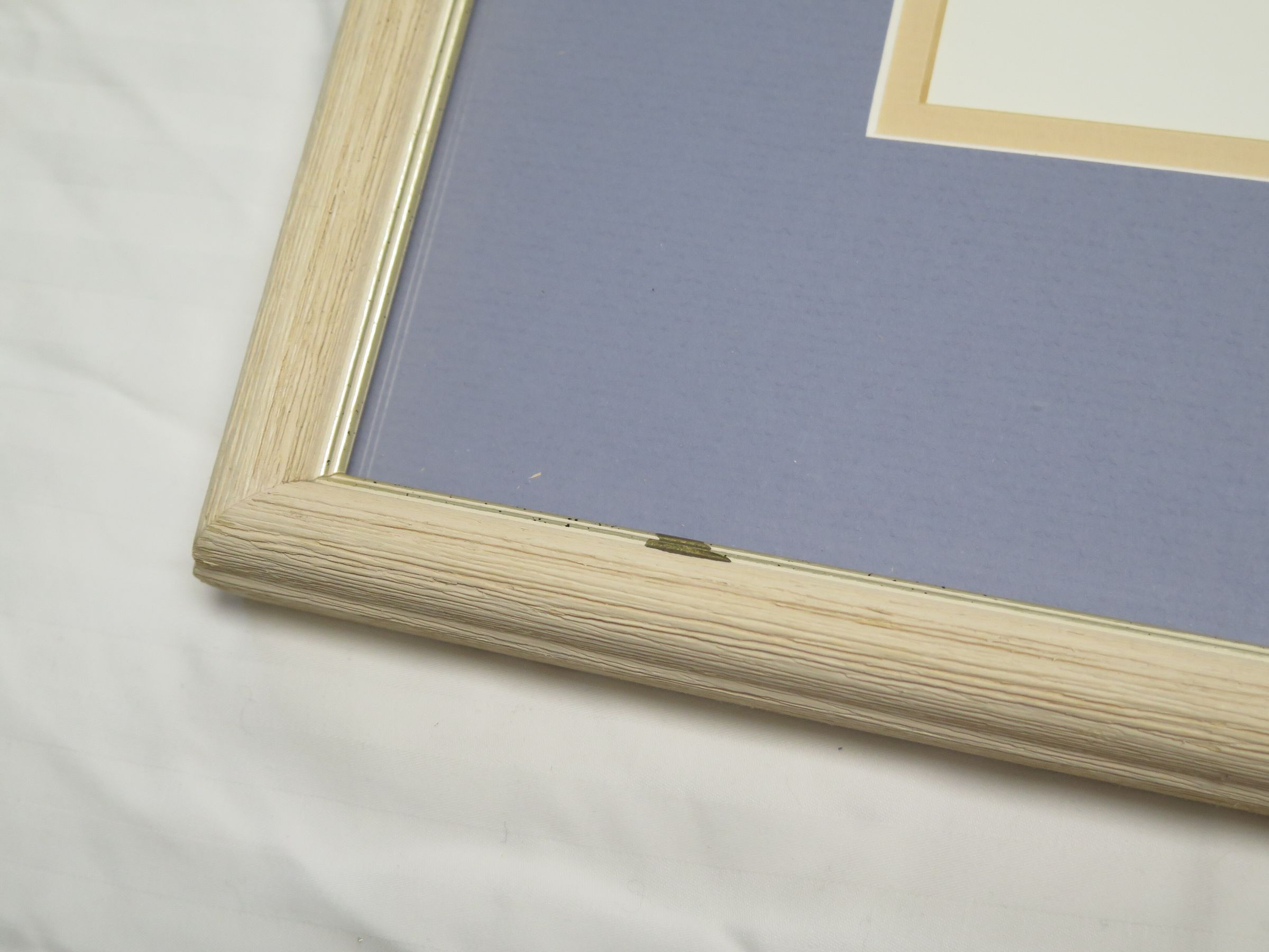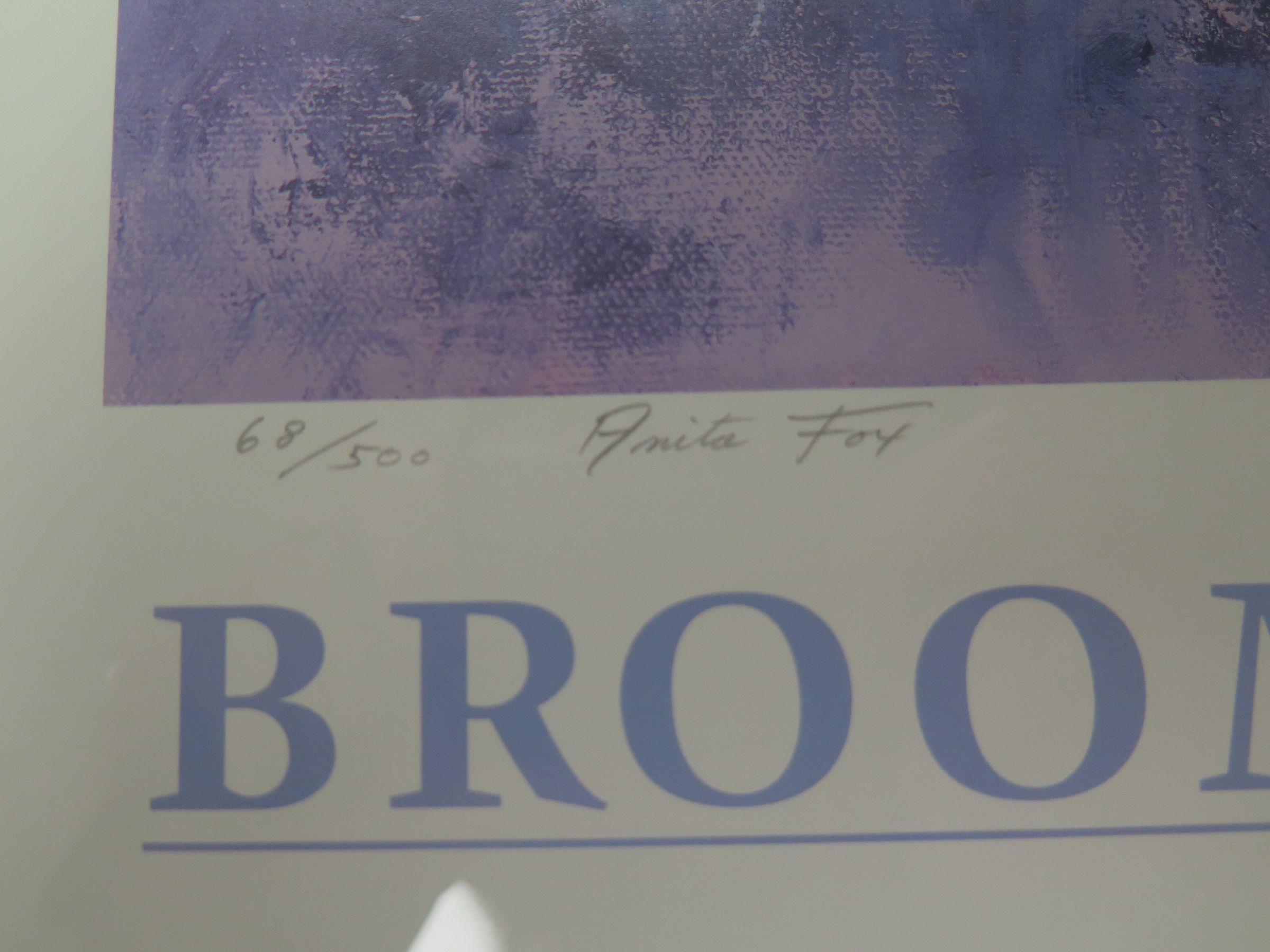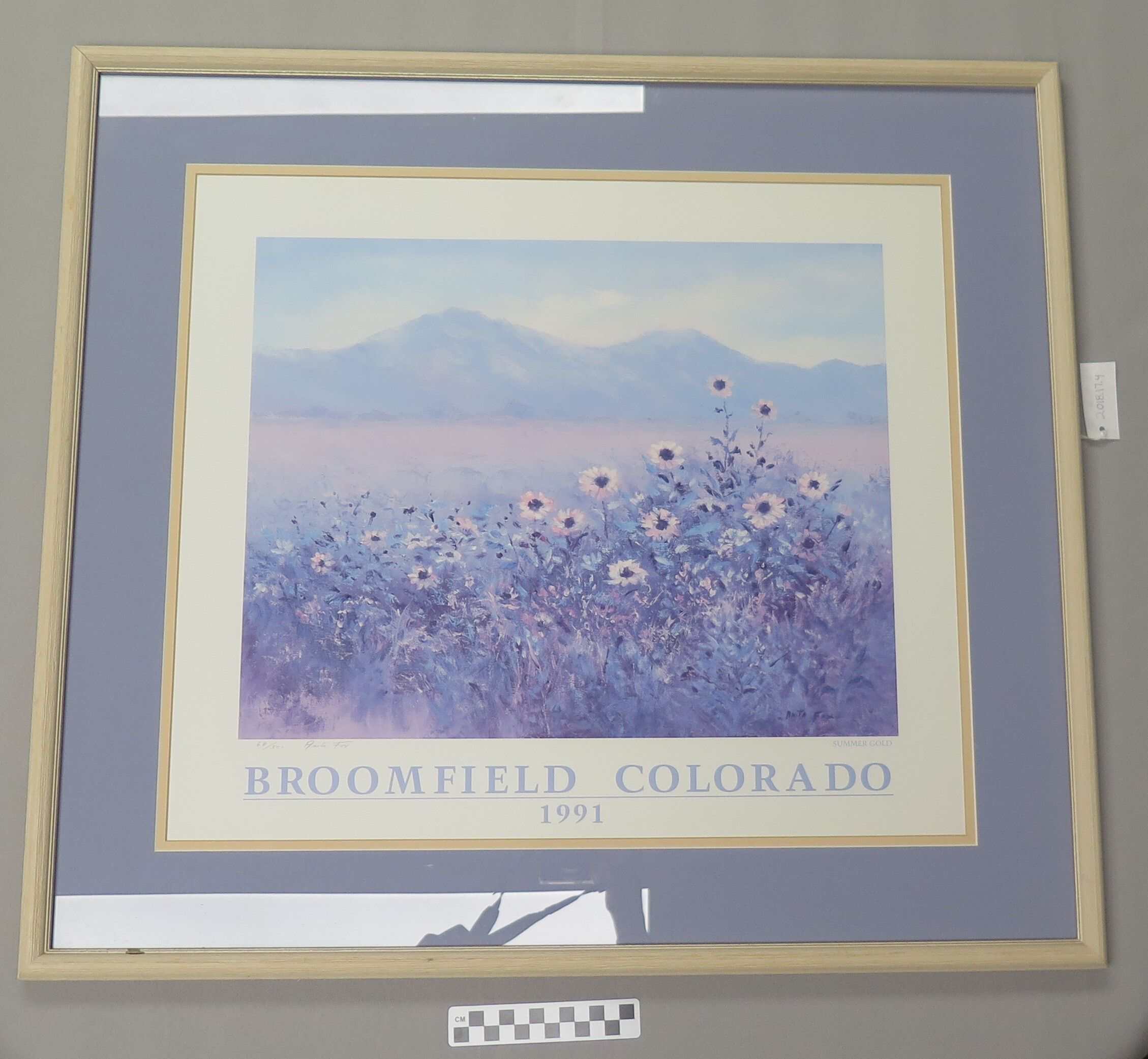 Framed print of an illustration of mountains with flowers in the foreground. The artwork is done in muted purples, blues, pinks, and white. There are 11 flowers clustered in the PL half of the artwork that are facing the viewer head on. In the bottom PL corner of the illustration is the artist's signature "Anita Fox". Below the illustration near the PR corner reads "68/500 Anita Fox", and near the PL corner reads "Summer Gold". Across the bottom reads "Broomfield Colorado 1991".Collection