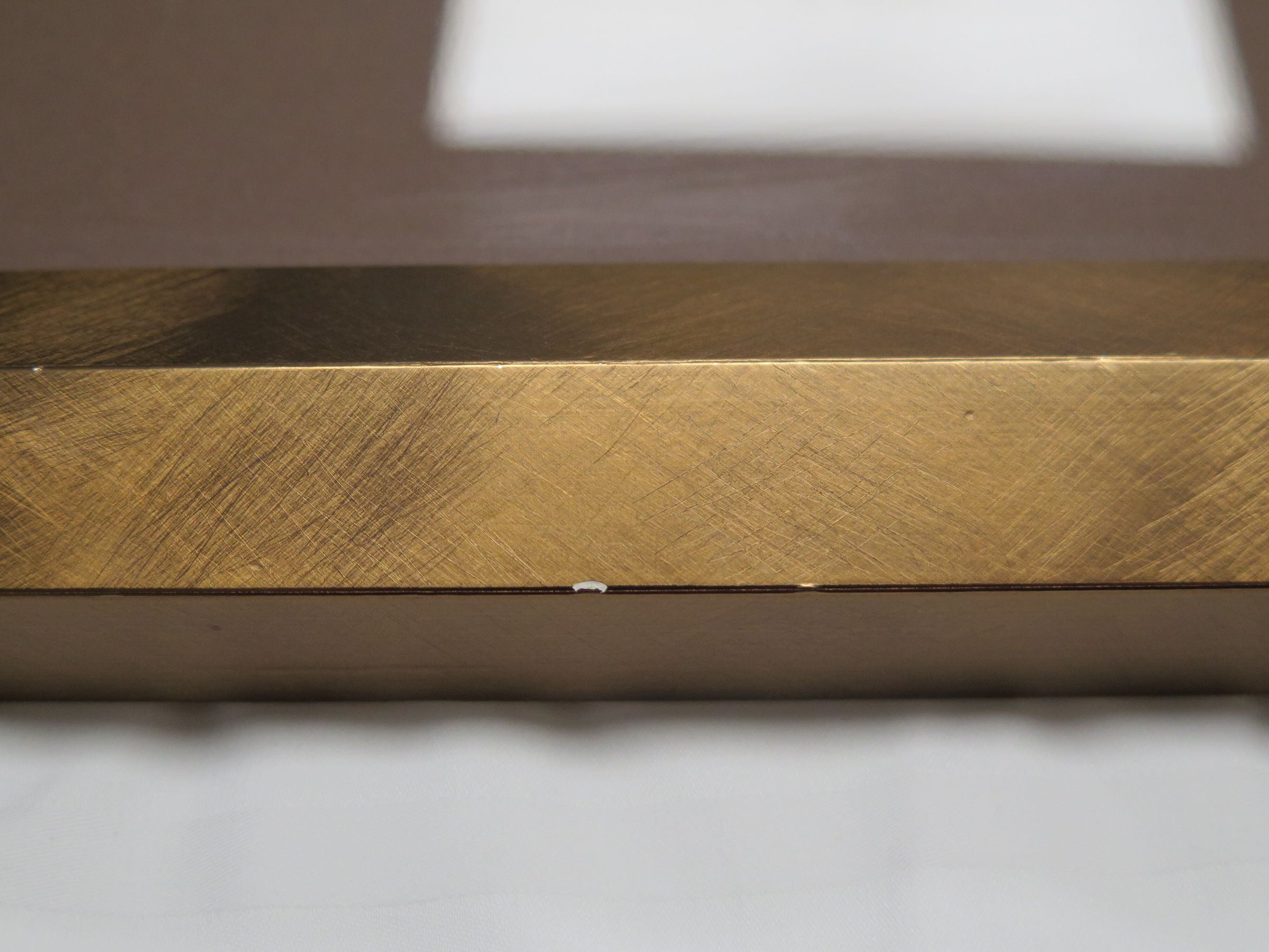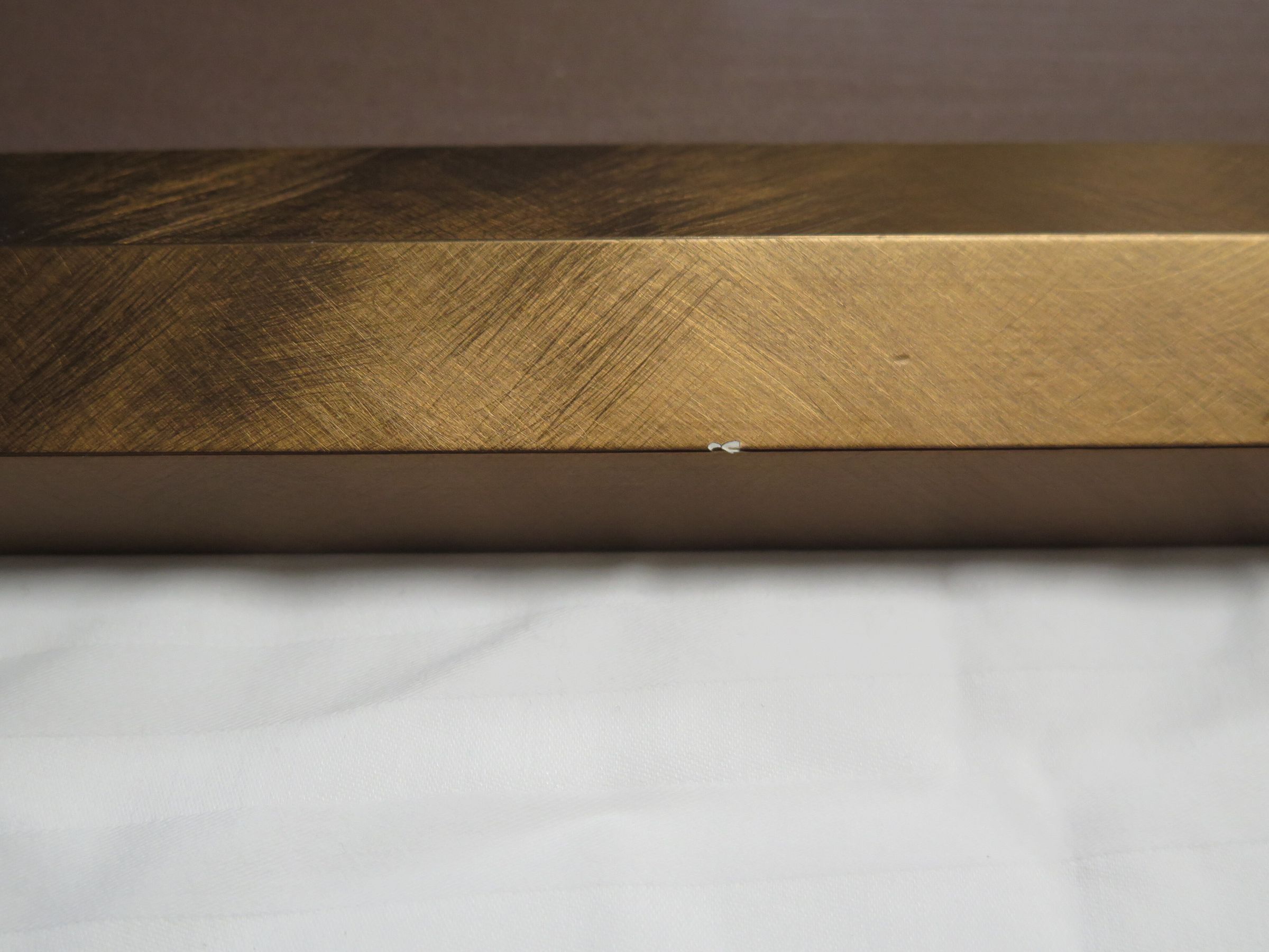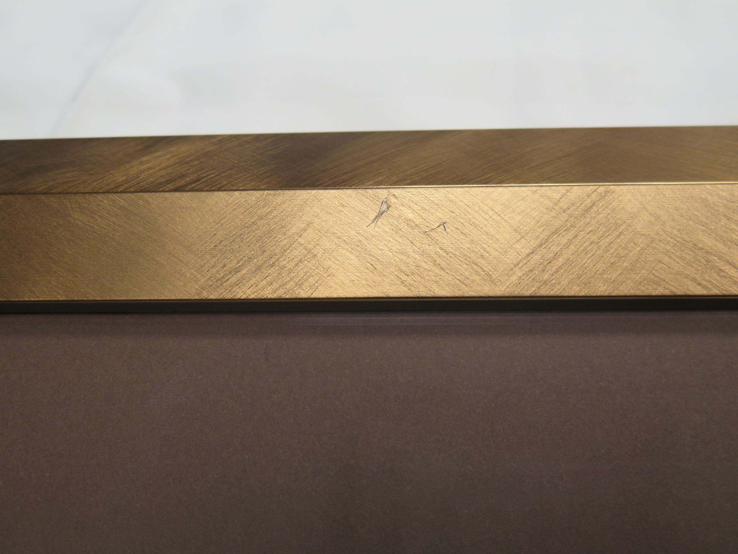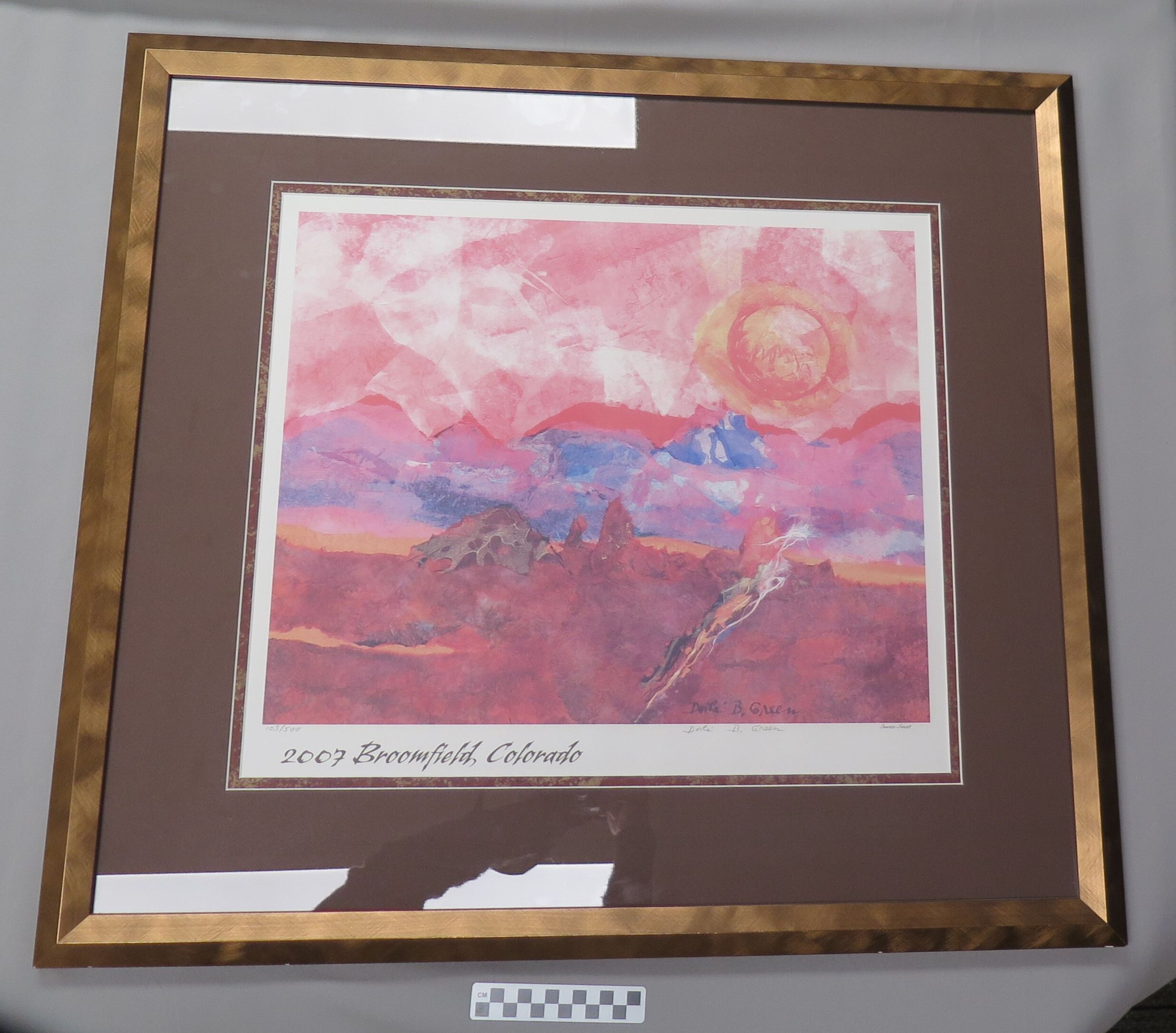 Framed print of an abstracted landscape illustration. The image is of a sunset/sunrise over mountains and is done in primarily warm colors, with the "sky" a pinkish red and the bottom primarily a deeper red/maroon. At the bottom, near the PL corner is the artist's signature "Dorle B. Green." Below the illustration from PR to PL reads "103/500 Dorle B. Green Sunrise-Sunset" and at the bottom starting at the PR corner reads "2007 Broomfield, Colorado". The window mat is brown and the frame is bronze colored.Collection