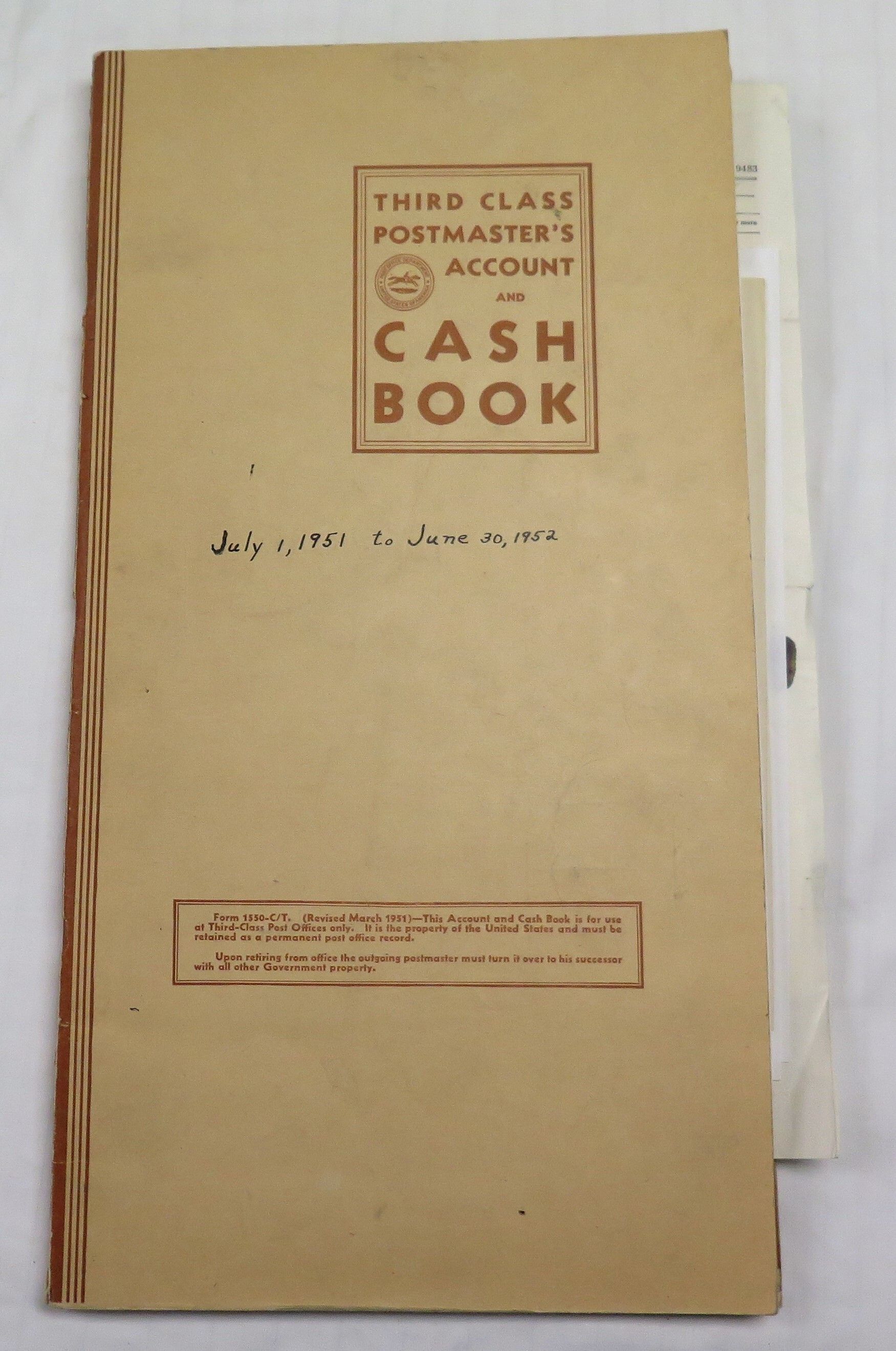 A: Third Class Postmaster's Account and Cashbook, July 1, 1951 to June 30, 1952.