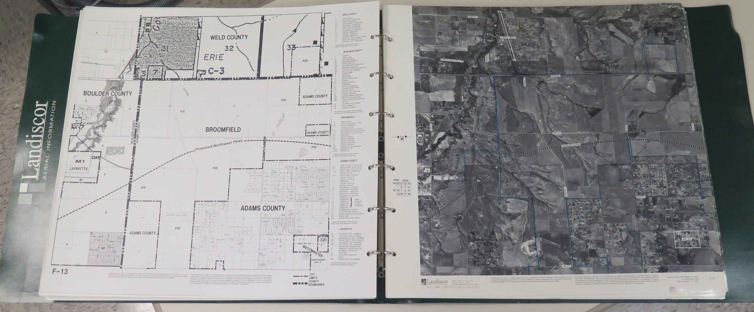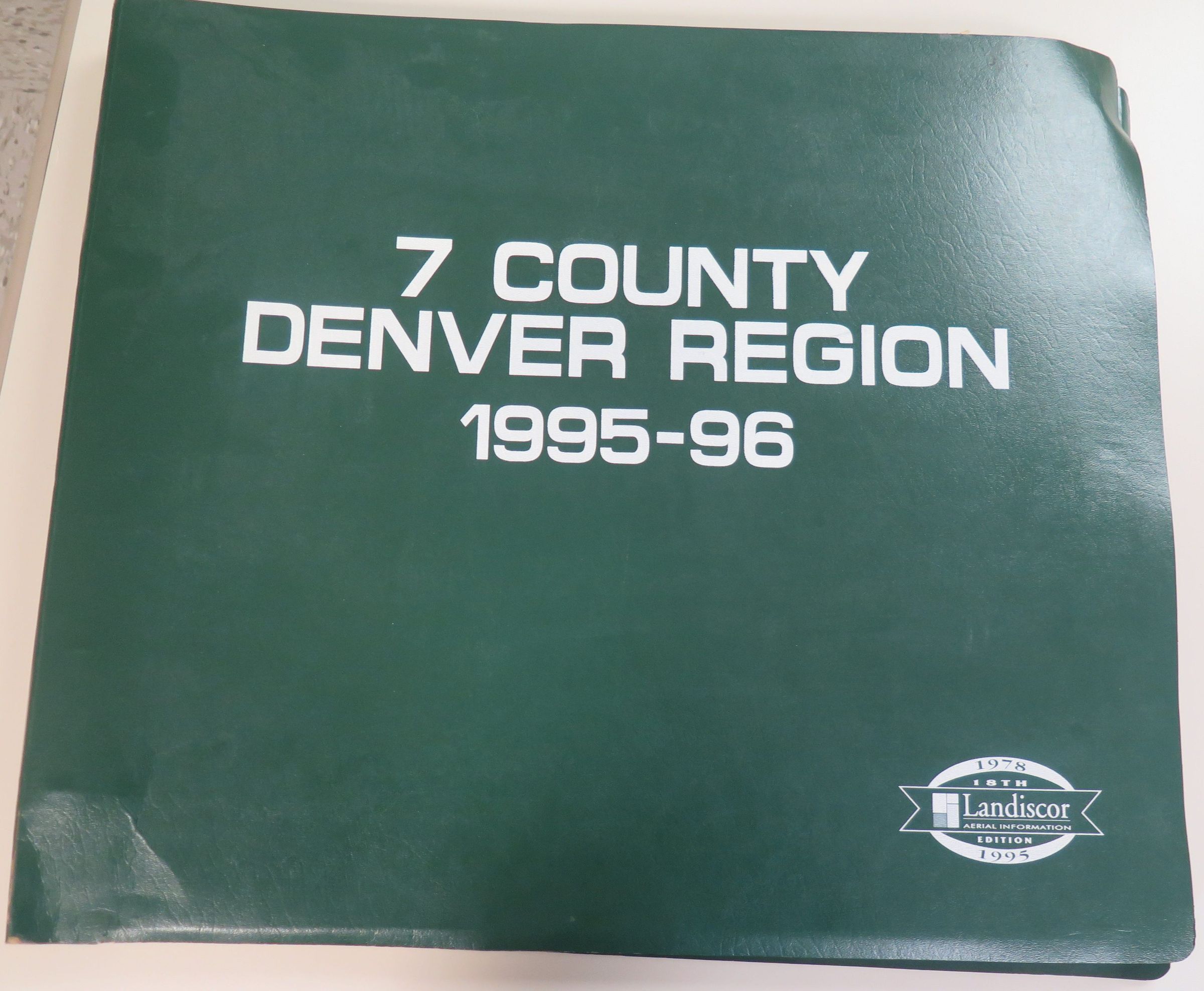 Item is a large photo atlas titled, "7 County Denver Region, 1995-96." This book is bound by 6 rings and has a forest green cover. The title of the atlas is centered on the front cover, while a logo is present in the bottom right corner, reading, "1978-1995, 18th Edition, Landiscor Aerial Information." This book contains many aerial photos and maps of different counties around the Denver area, including Broomfield. The atlas contains information from 1995-96, but many of the featured photos were taken in the early 2000s.Lexicon