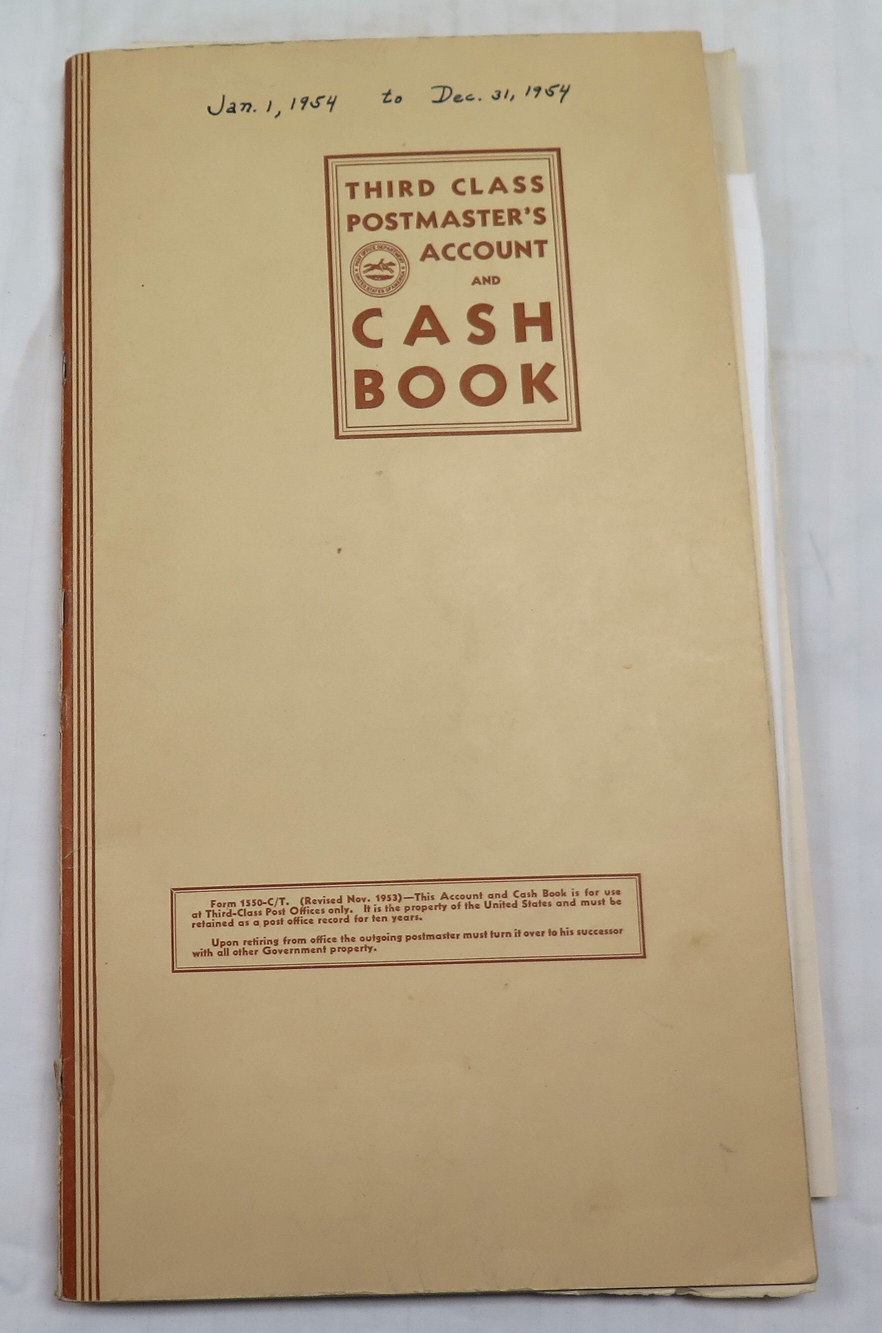 A: Third Class Postmaster's Account and Cashbook. Jan. 1, 1954 to Dec. 31, 1954.