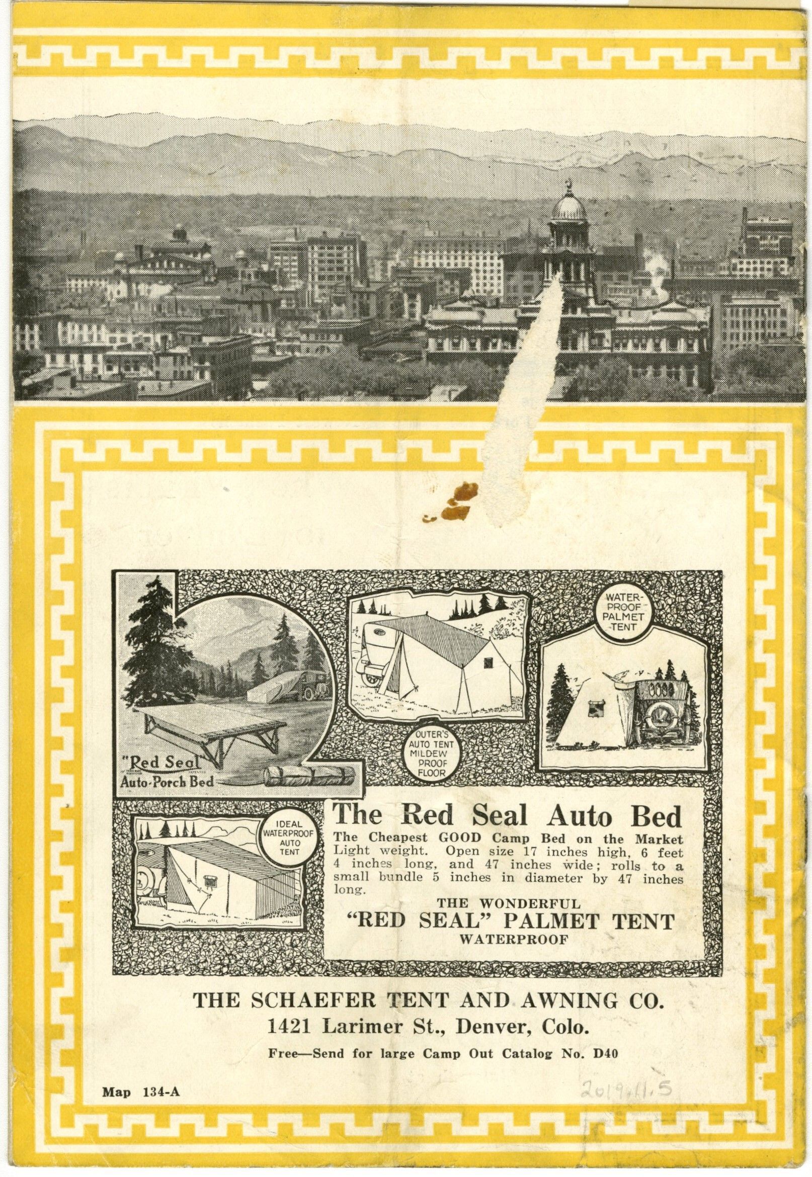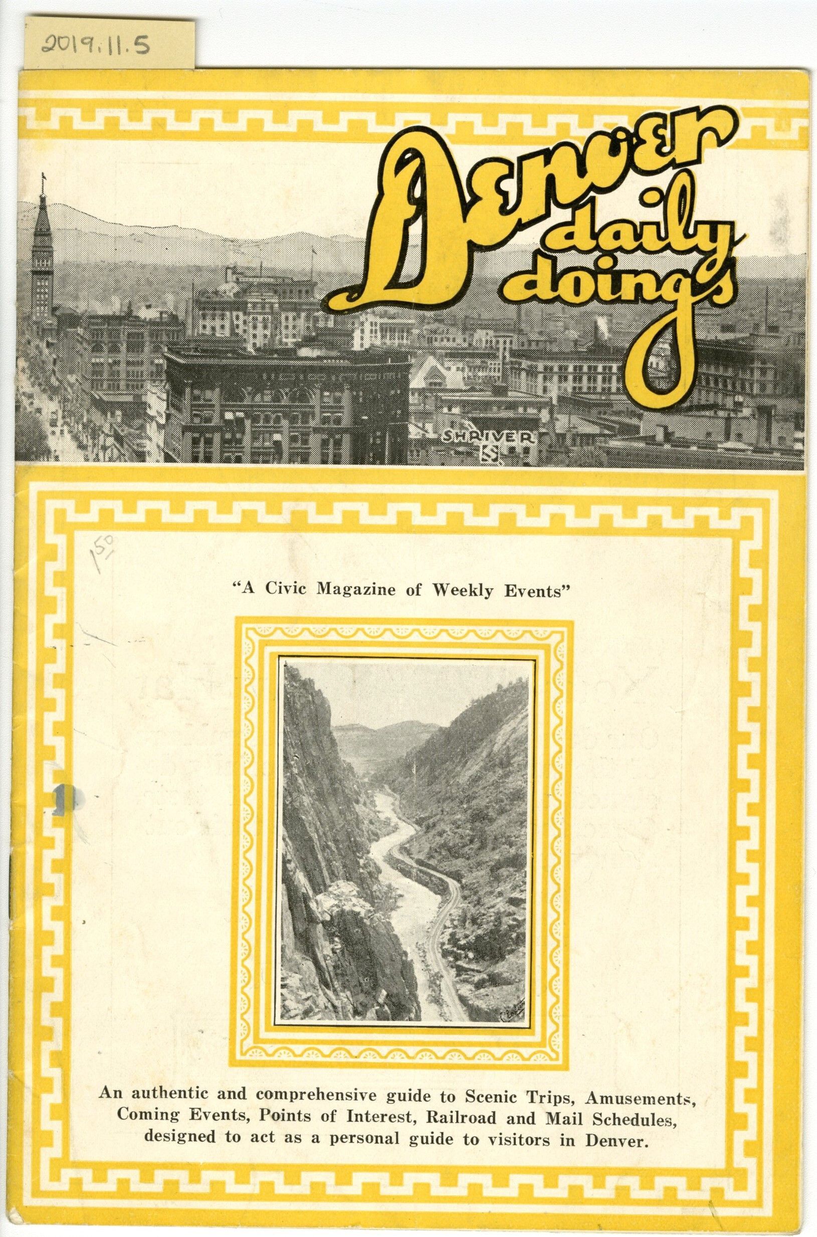 Small magazine, "Denver daily doings" from May 20, 1923. The cover shows a wrap around photo of Denver (going from the back cover to the front) at the top, and below an image of a canyon. Printed above this image reads "A Civic Magazine of Weekly Events" and below "An authentic and comprehensive guide to Scenic Trips, Amusements, COming Events, Points of Interest, Railroad and Mail Schedules, designed to act as a personal guide to visitors in Denver." There is a yellow geometric pattern bordering the top as well as around the ad on the back and the photo on the front. Also on the front is written "1.50" in pencil.