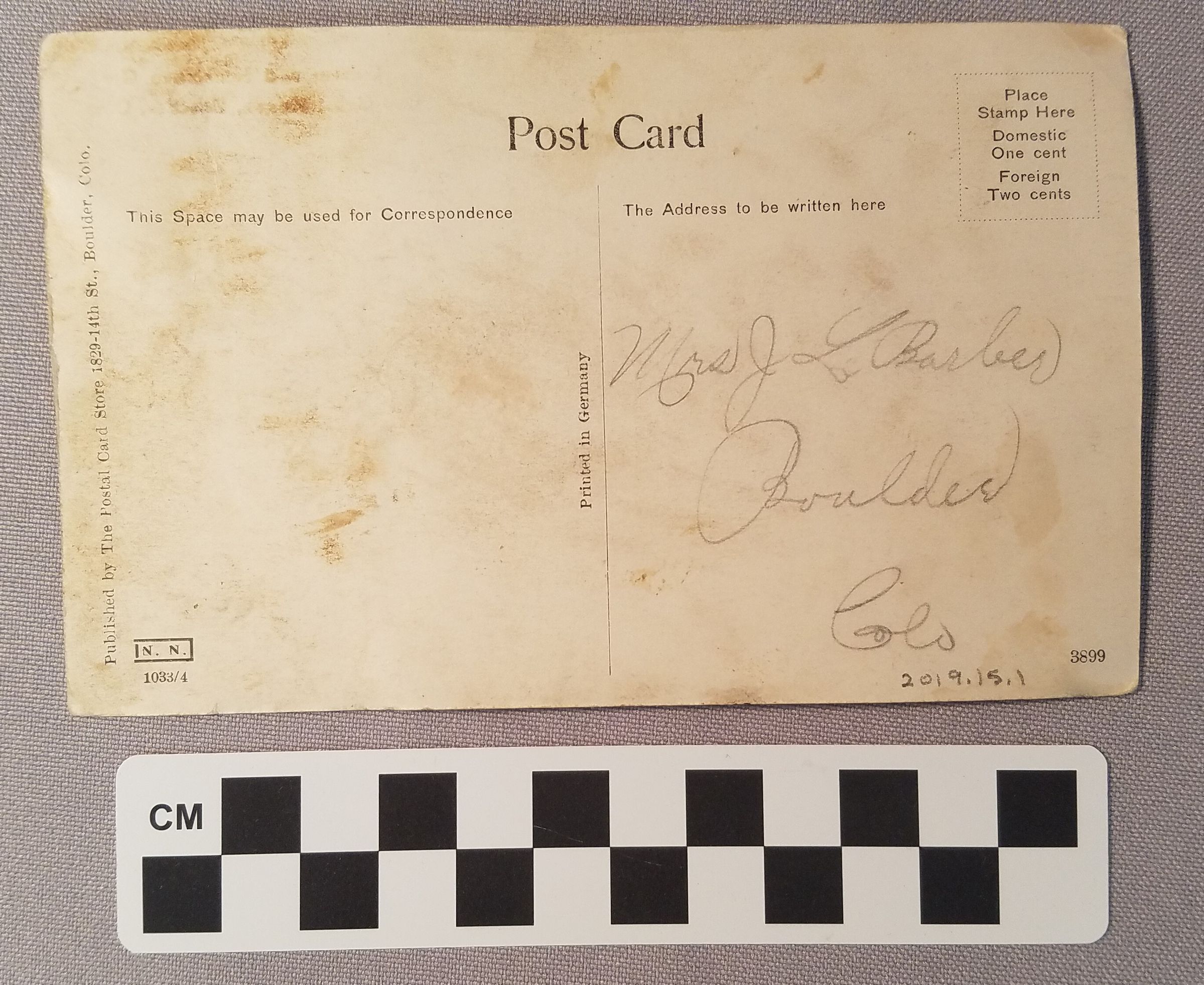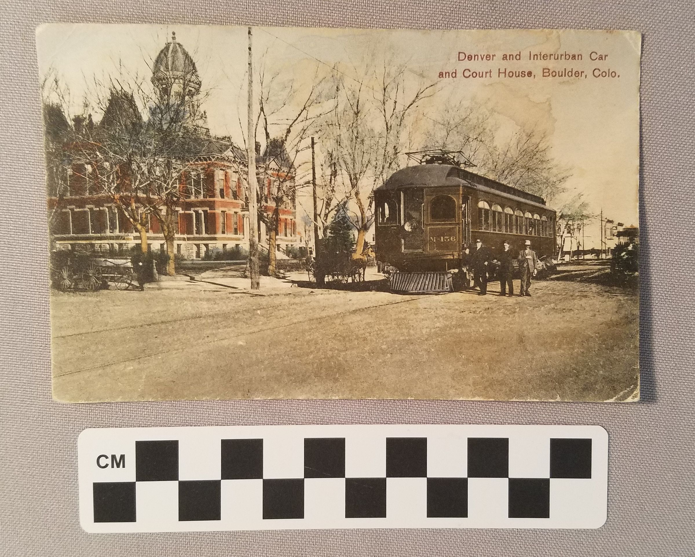Postcard showing a colored picture of the Denver and Interurban Car and Court House in Boulder, CO. On the back in pencil the postcard is addressed to "Mrs. J. L. Barber, Boulder, CO"
