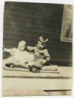 Black and white photograph of two children sitting on a blanket that is located on a porch. There is a pillow between the children and the siding of the house. The children are probably Gib and Clyde Brunner. Gib is on the left. The children are not looking at the photographer.