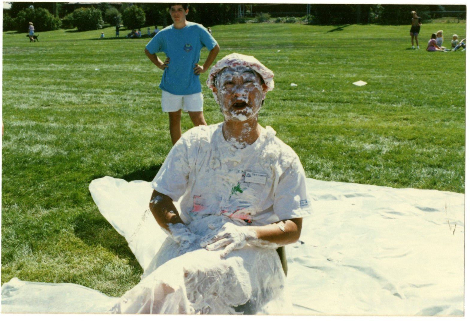 Item is a colored photograph taken during the 1990 Broomfield Days event. In the photo, Bob Sakaguchi is sitting on a white tarp in a grassy field. He is wearing a shower cap and white t-shirt and is covered in cream pie filling. A boy stands behind him wearing a blue shirt and white shorts with his hands on his hips. Other children are visible playing in the background of the field. Sakaguchi was a former Broomfield councilman.Photograph Details