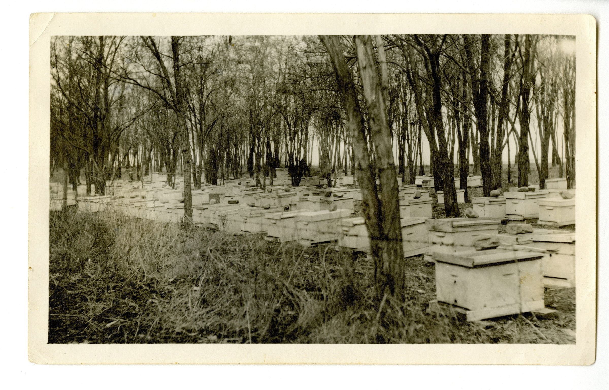 Photograph of the honey bee boxes at the Crawford farm. Original. There is a wire fence along the front of the image.