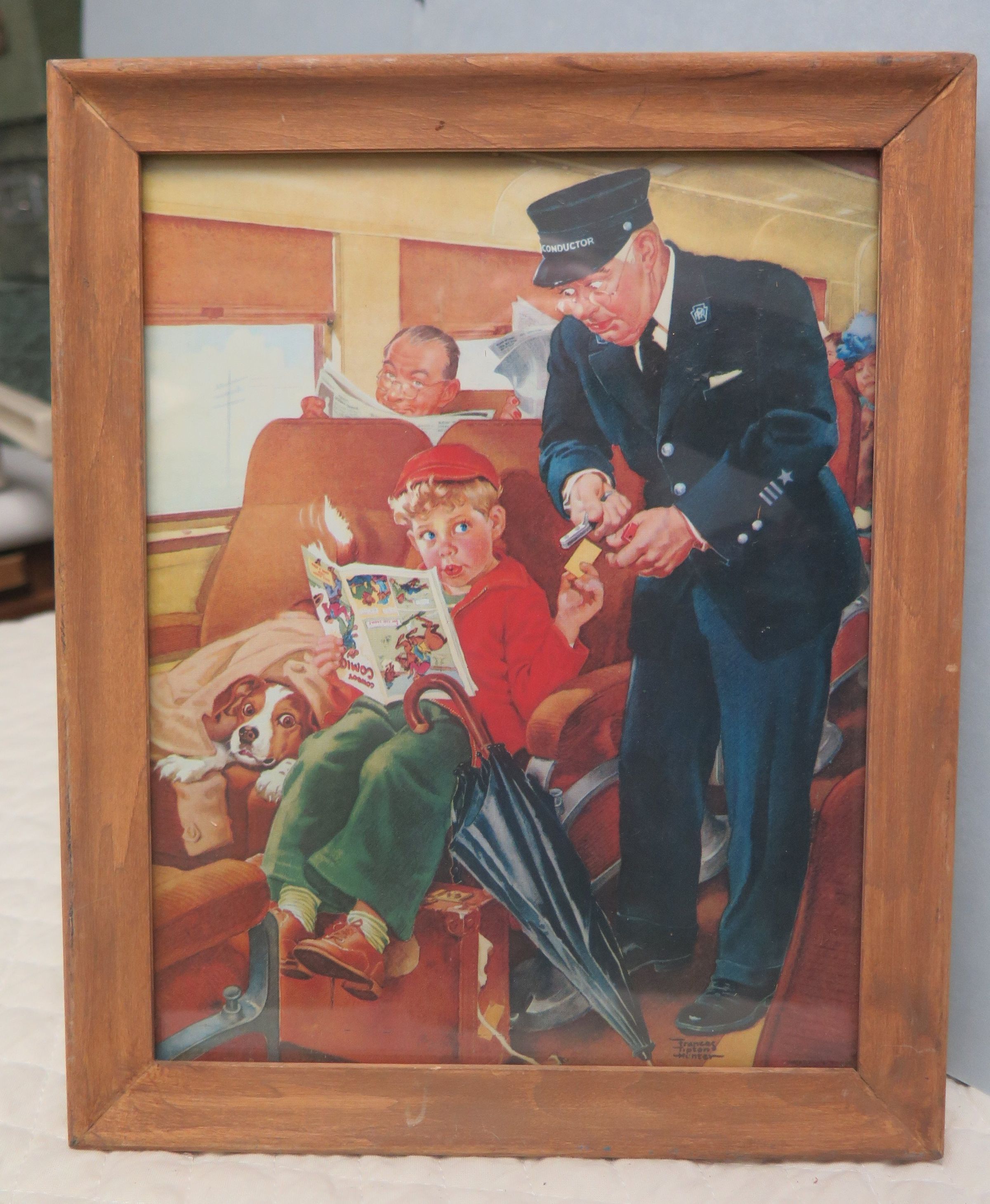 This is a framed copy of a print of a little boy on a train trying to hide a dog. The frame is wood. The artist name is difficult to read, but is probably Frances Tipton Hunter. The frame measures 10" (h) x 8" (w).