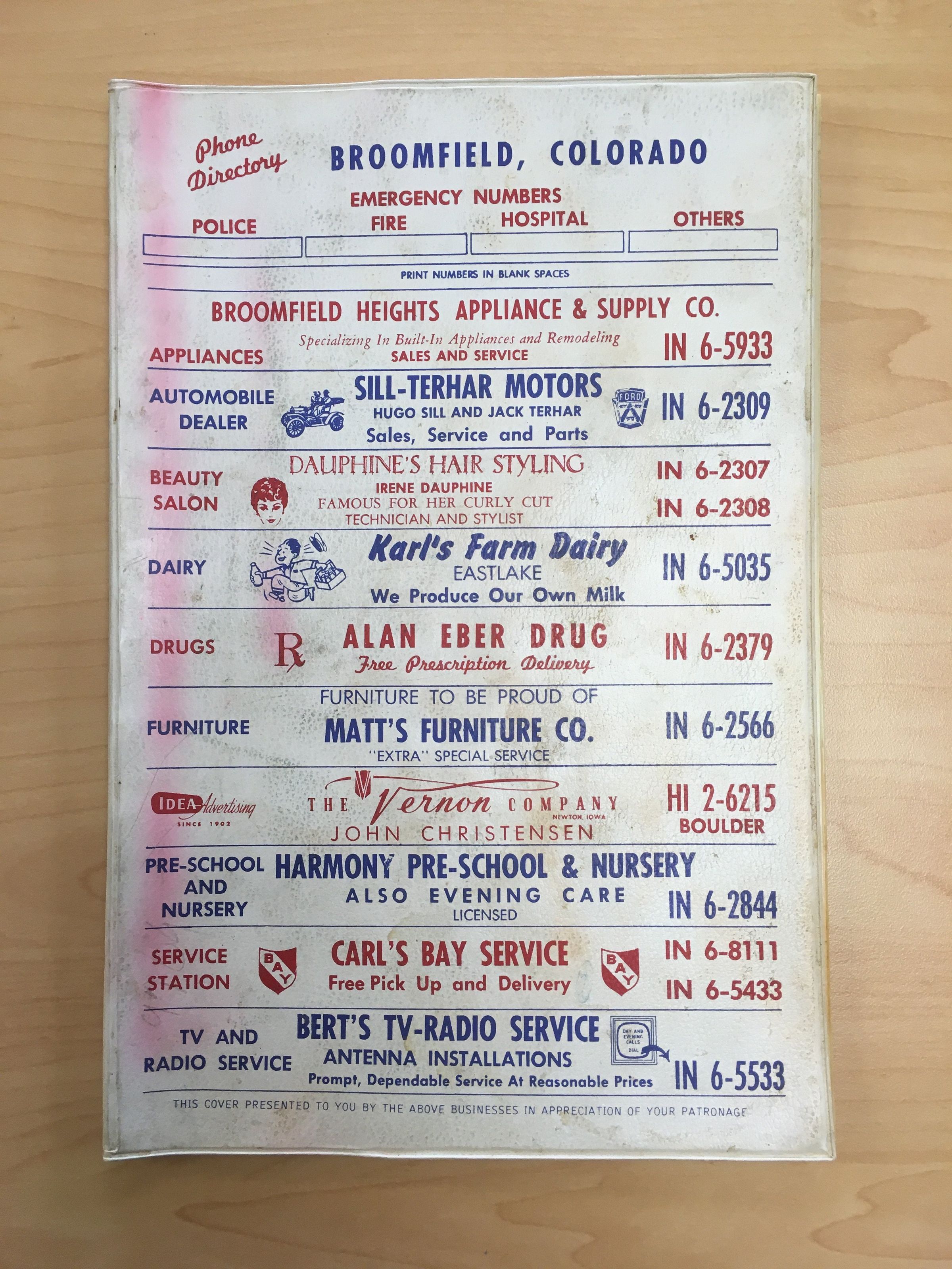 Cover ads include Broomfield Heights Appliance & Supply Co., Sill-Terhar Motors, Dauphone's Hair Styling, Karl's Farm Dairy, Alan Eber Drug, Matt's Furniture, The Vernon Company, Harmony Pre-School & Nursery, Carl's Bay Service, and Bert's TV-Radiob Service.Collection