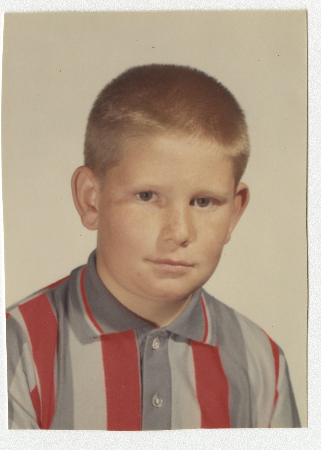 Color photograph of a boy possibly a school photo. Boy is wearing a red and grey striped polo shirt he has short blonde hair, blue eyes and freckles. Background of the photograph is a light tan color.