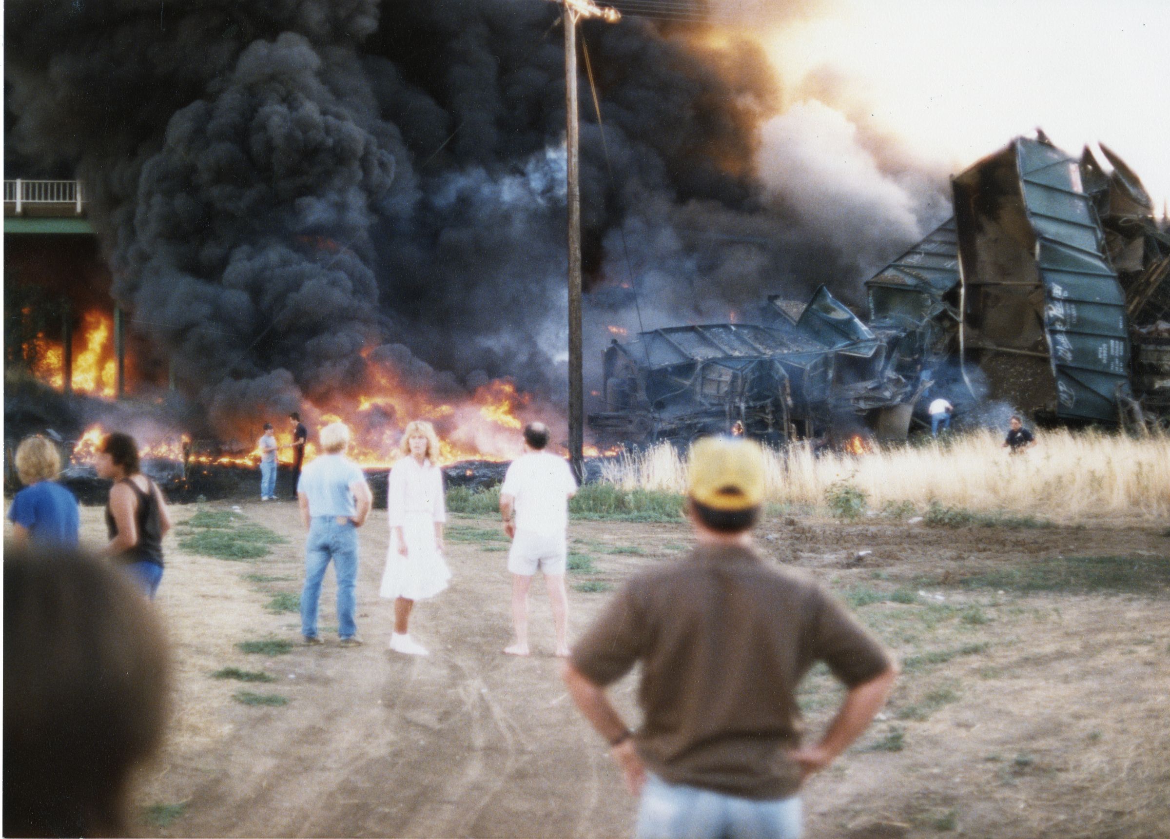 Color photograph print of onlookers at the site of a train wreck, near the US 36 bridge between 104th avenue and the Broomfield exit, 1985. A man in a brown shirt and yellow hat is seen facing the wreckage in the foreground. A woman in a white dress and tennis shoes is facing the camera. A police officer can be seen speaking with one onlooker closer to the wreckage. The wreckage itself is burning, with large billows of black smoke and burnt, piled up train cars. The US 36 bridge is just visible to the left in the image.Collection