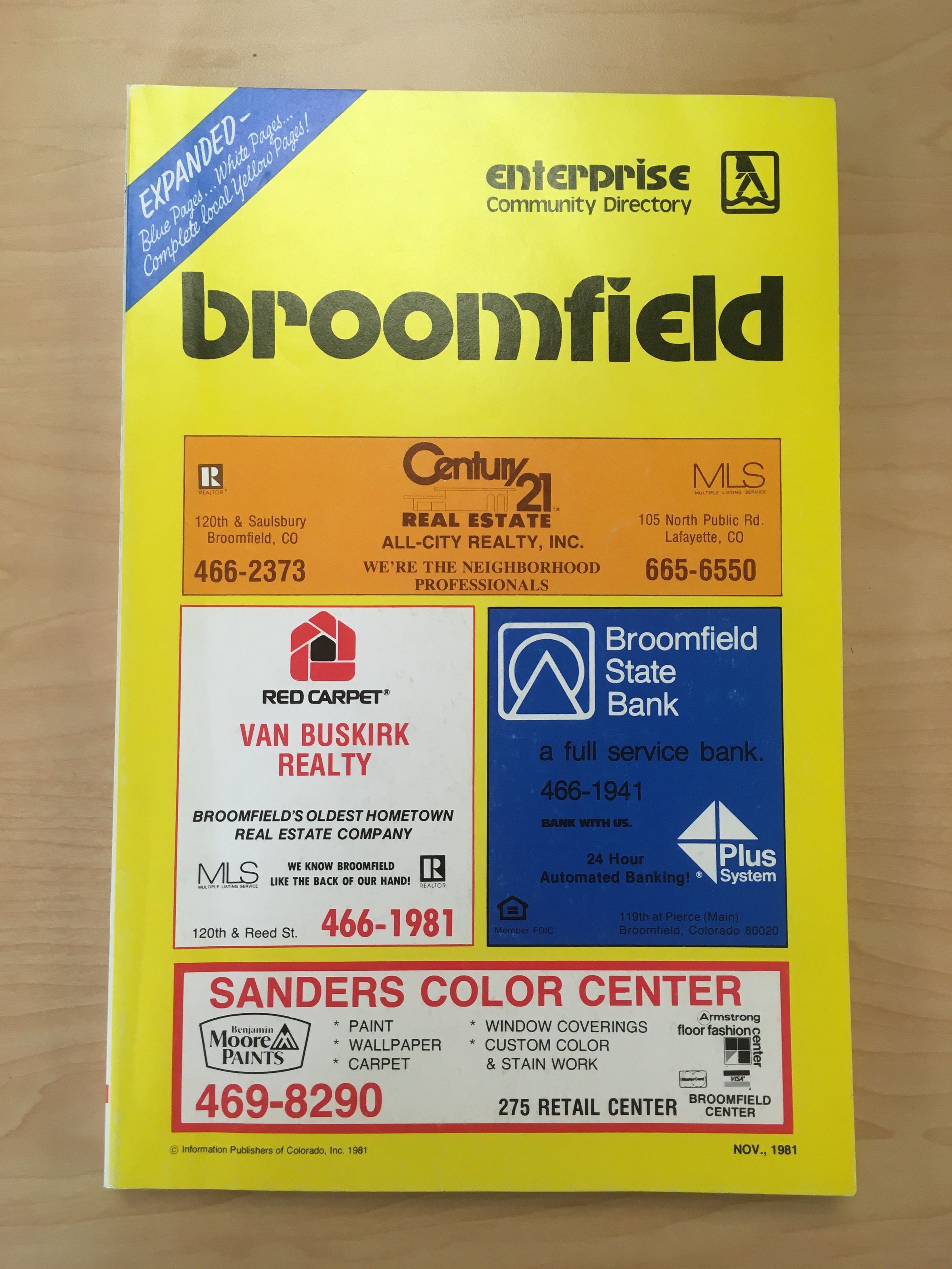 1981 Broomfield Telephone Book published by The Enterprise Community Directory. Nov. 1981. Yellow cover with local ads.