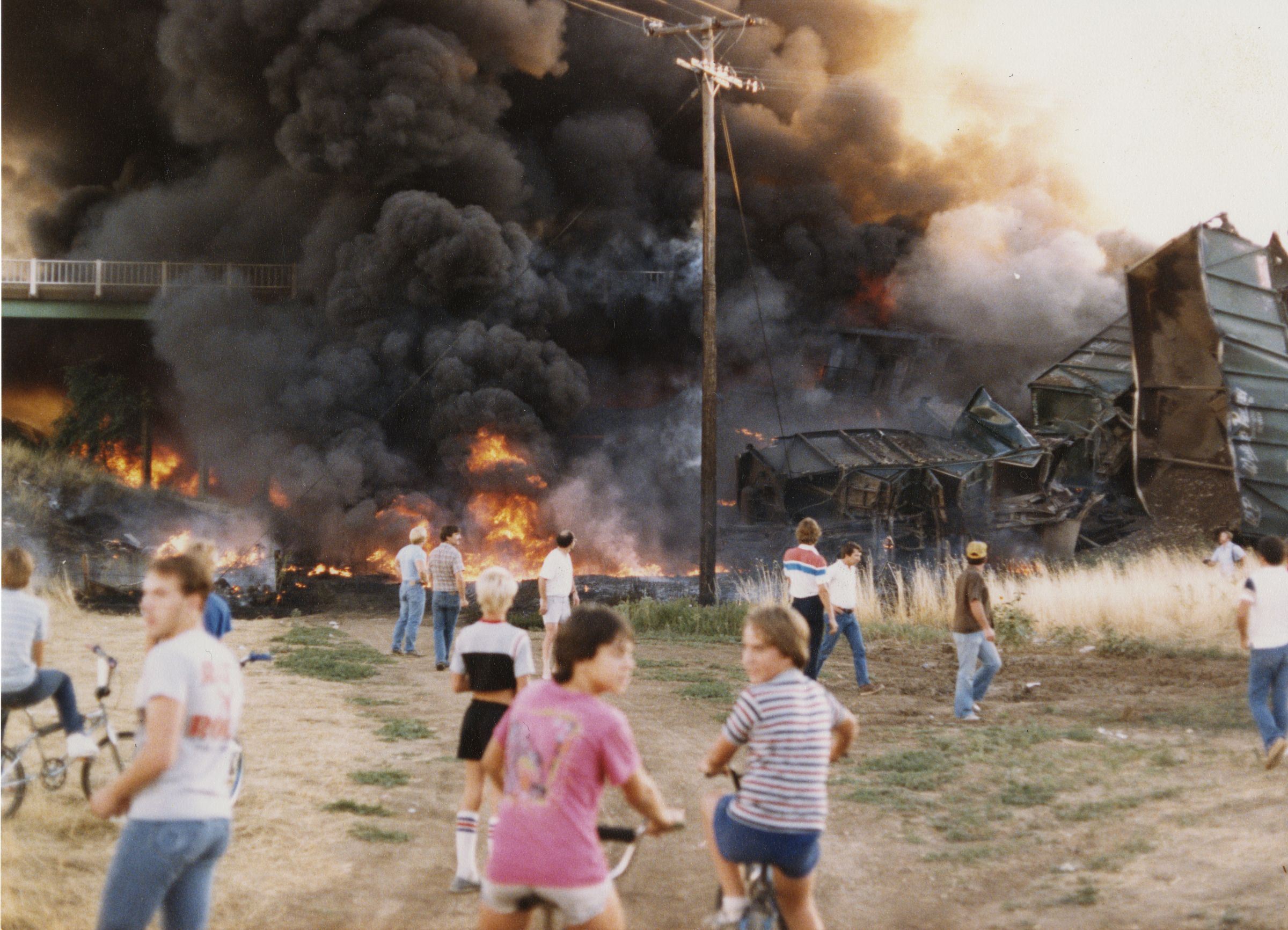 Color photograph of onlookers at the train wreck near the US 36 bridge between 104th avenue and the Broomfield exit, 1985. Three of the onlookers are children who are riding bicycles. The US 36 bridge, billowing black smoke, a telephone pole, and a pile of burnt, twisted train cars are visible in front of the onlookers.Collection