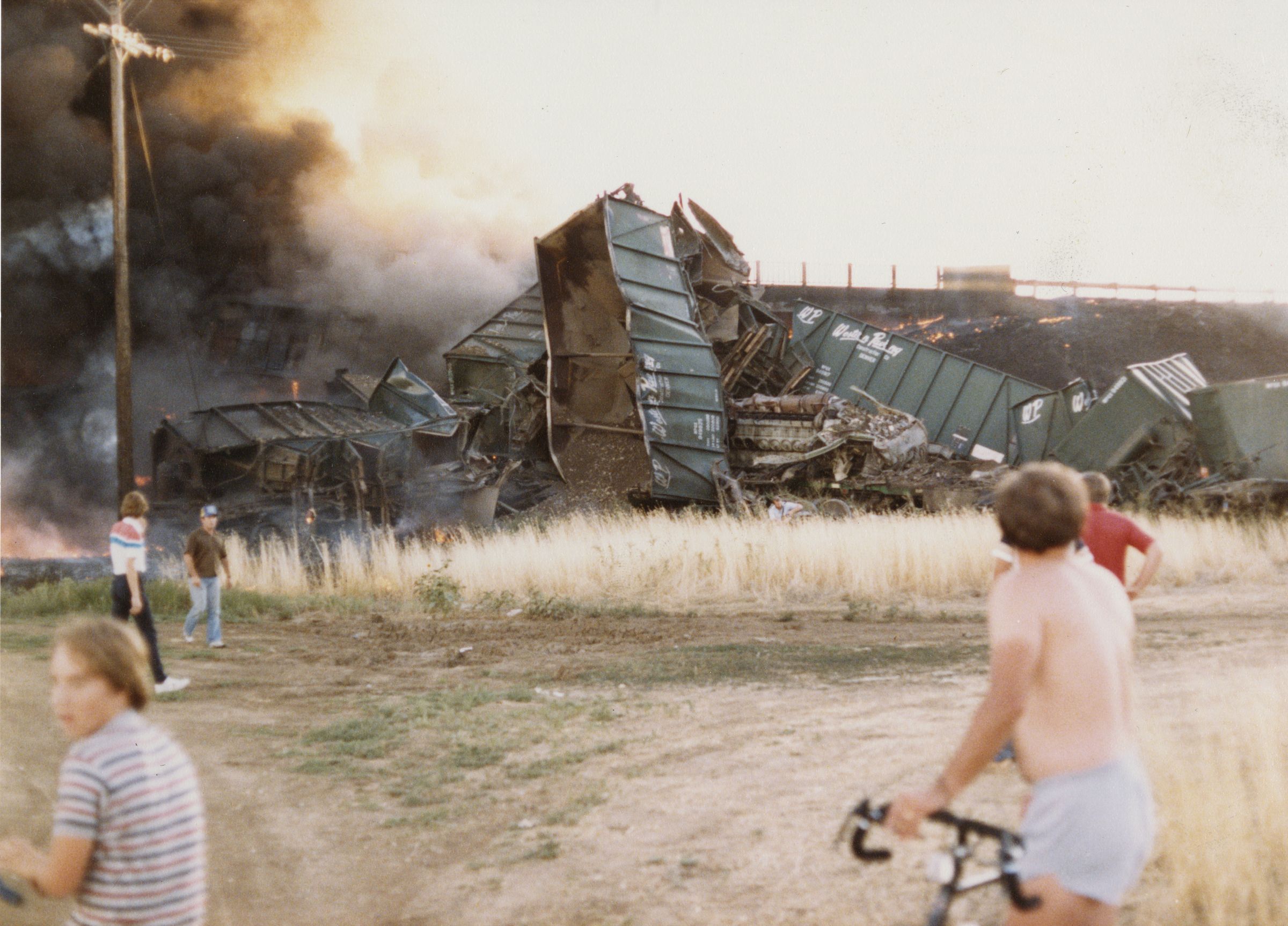 Color photograph print of a bicyclist and others overlooking train wreckage at the site of a train wreck near the US 36 bridge between 104th avenue and the Broomfield exit, 1985. The bicyclist is riding his bike, wearing just light blue shorts. A child can be seen with his face toward the camera in the lower left corner of the photograph. The wreckage consists of black billowing smoke and piled up, twisted, and burnt train cars. A telephone pole is visible to the left.Collection