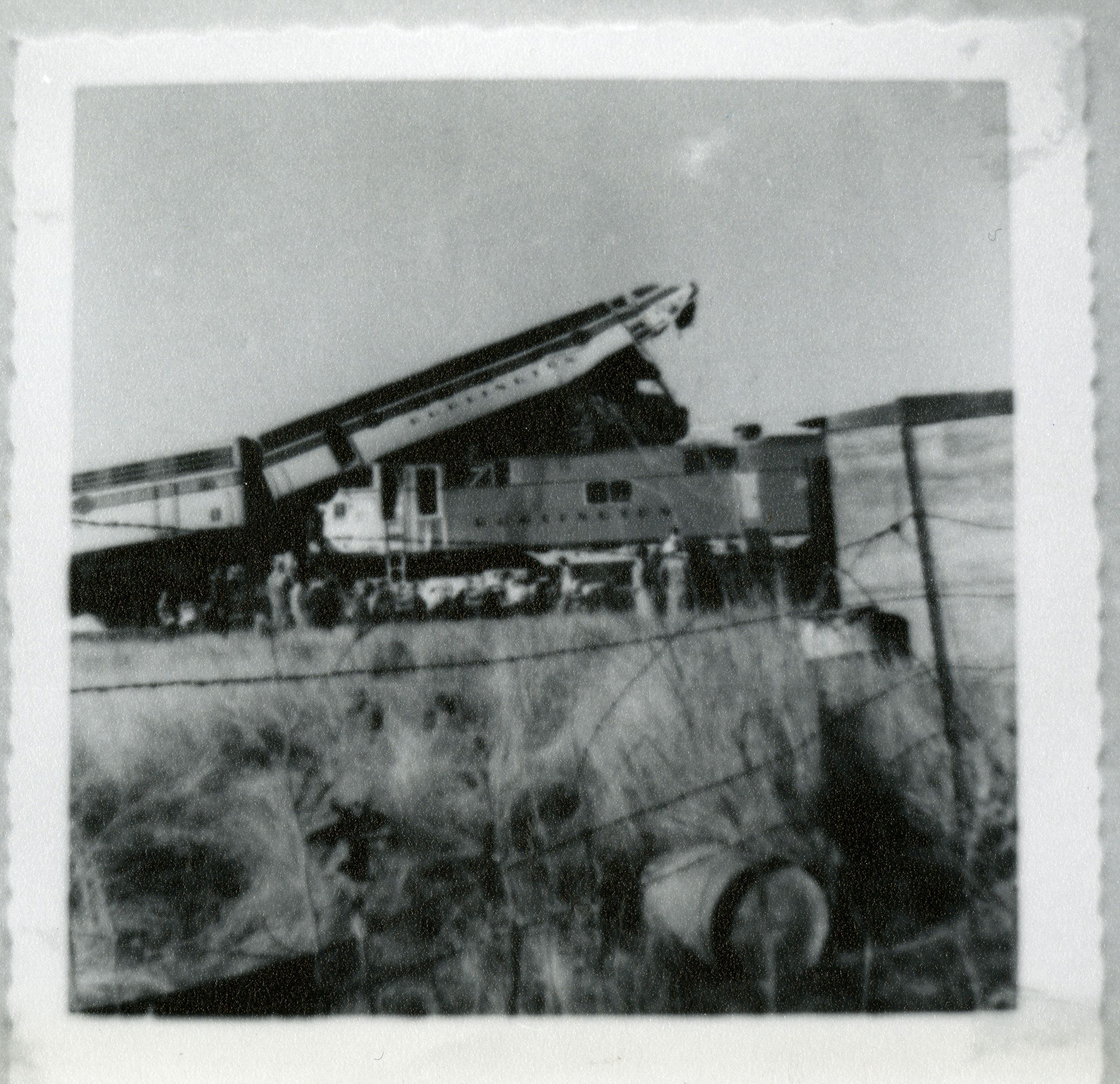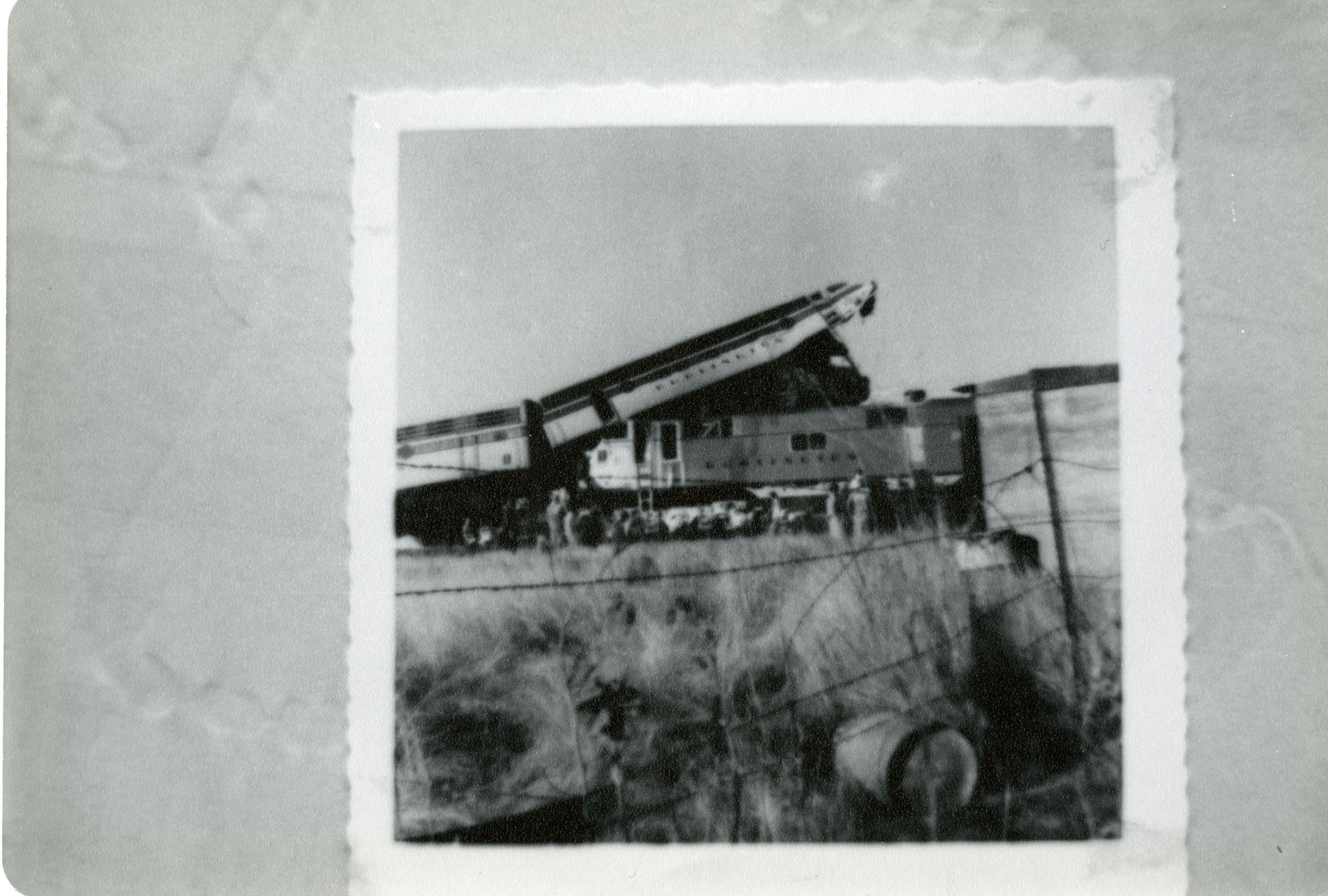 Black and white photograph of the 1958 train crash in Broomfield. The photograph is not the original but a photograph of another photograph (original appears to be Gelatin Silver print with deckled edges, approximately 3" x 3"). This photograph is a newer color process, circa 1980s.