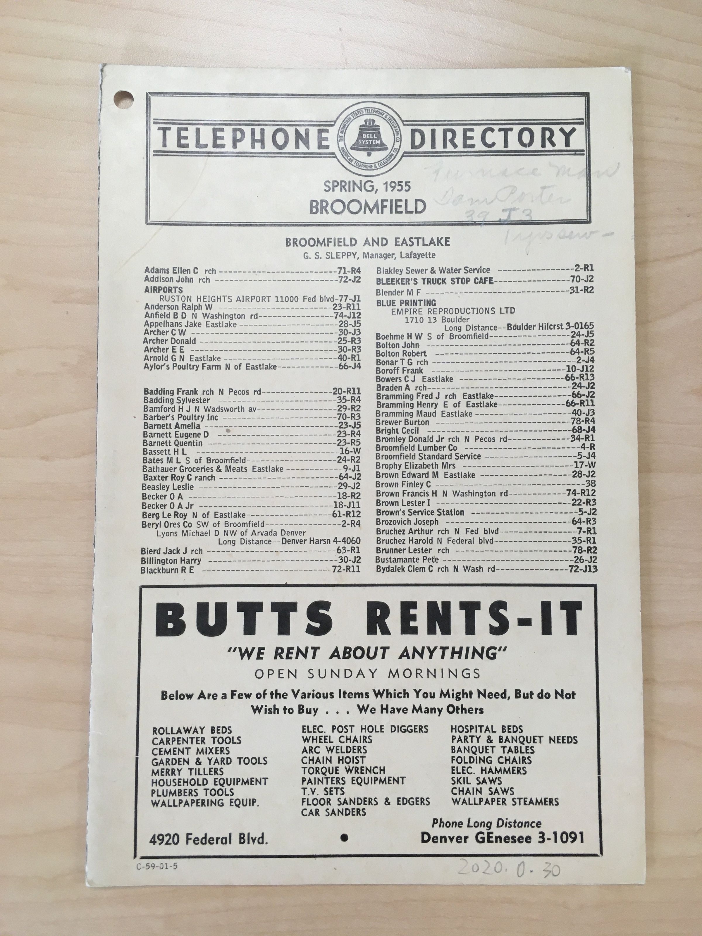 Broomfield telephone Directory, Spring 1955. Single folded piece of folded cardstock. Printed by Bell Systems, The Mountain States Telephone & Telegram Co.