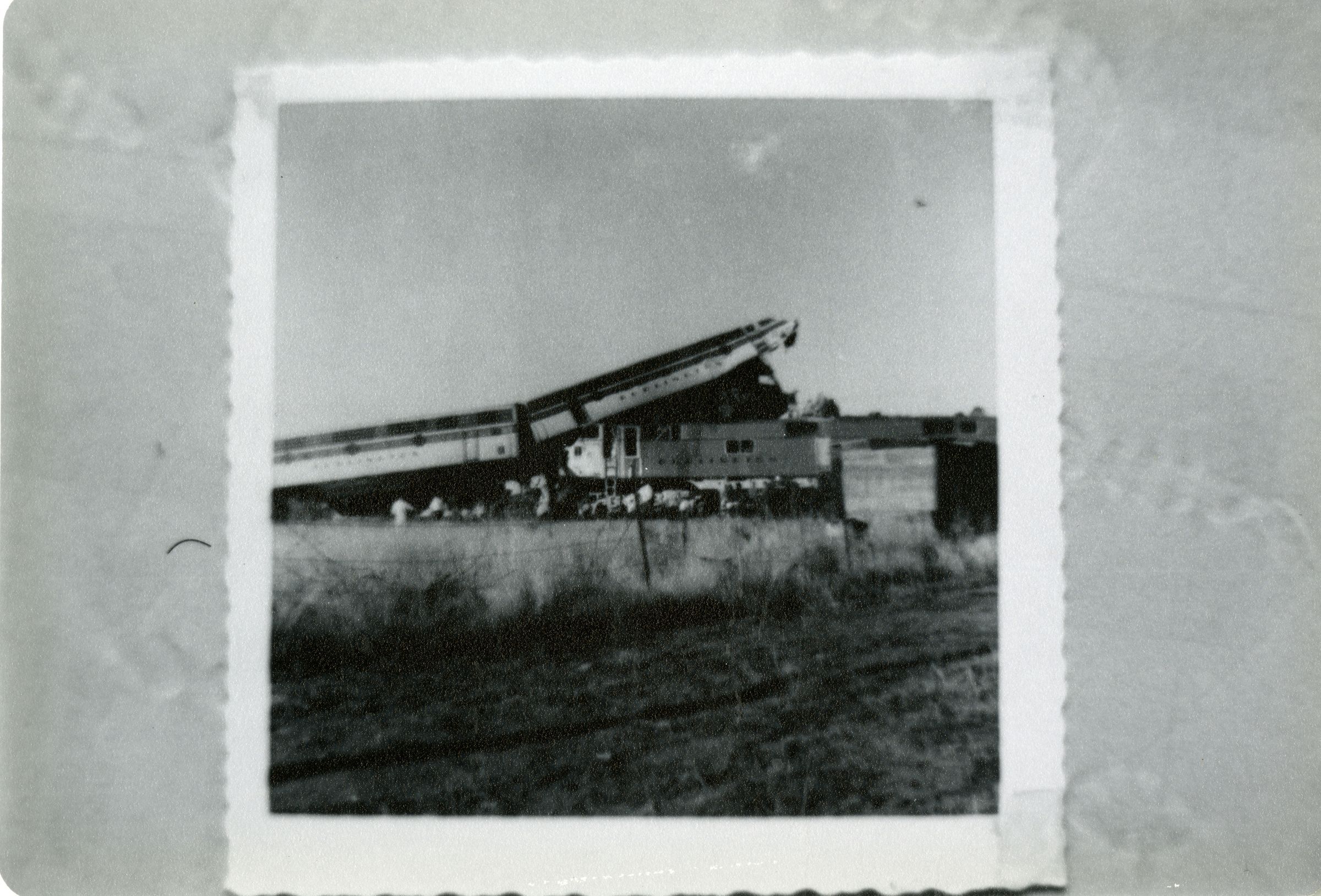 Black and white photograph of the 1958 train crash in Broomfield. The photograph is not the original but a photograph of another photograph (original appears to be Gelatin Silver print with deckled edges, approximately 3" x 3"). This photograph is a newer color process, circa 1980s.